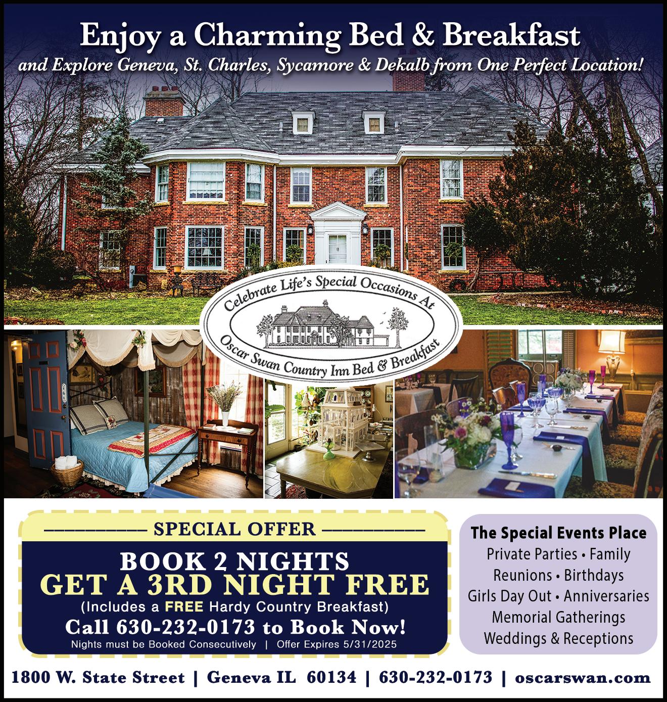 Oscar Swan Country Inn is located at 1800 W. State St. in Geneva. Call (630) 232-0173 to make a reservation. ❚