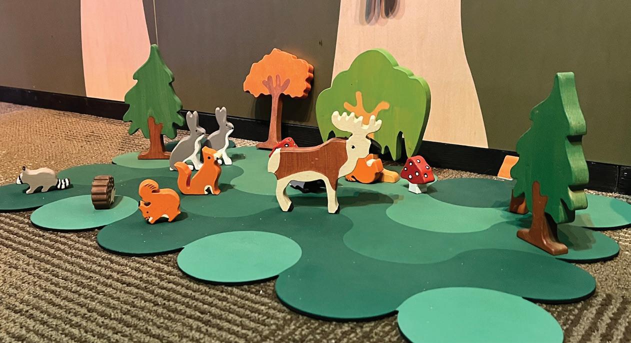 A sign posted in the exhibit explains the area and its purpose. There are several sensory-friendly activities including a fiber-optic waterfall with felted wool stones beneath, soft rugs, natural wood blocks, a magnetic wall with blocks and gears, and adorable wooden animals. Guests have told Galley they feel calm and relaxed the minute they step into the space.