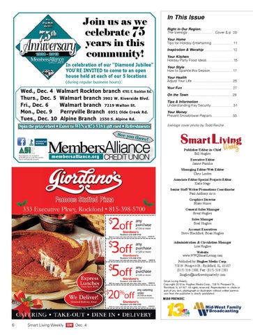 Executive Editor Janine Pumilia Managing Editor/Web Editor Chris Linden Associate Editor/Special Projects Editor Karla Nagy Senior Staff Writer/Promotions Coordinator Paul Anthony Arco Graphics Director Blake Nunes General Sales Manager Brent Hughes Sales Manager Brad Hughes Account Executives Steve Blachford, Brian Hughes Administration & Circulation Manager Lisa Hughes Website www.NWQSmartLiving.com Published by Hughes Media Corp. 728 N. Prospect St., Rockford, IL, 61107 (815) 316-2300, Fax: (815) 316-2301 lhughes@northwestquarterly.com Smart Living Weekly. Copyright 2013 by Hughes Media Corp., 728 N. Prospect St., Rockford, IL, 61107. All rights reserved. Reproduction in whole or part of any text, photograph or illustration without written permission from the publisher is strictly prohibited.