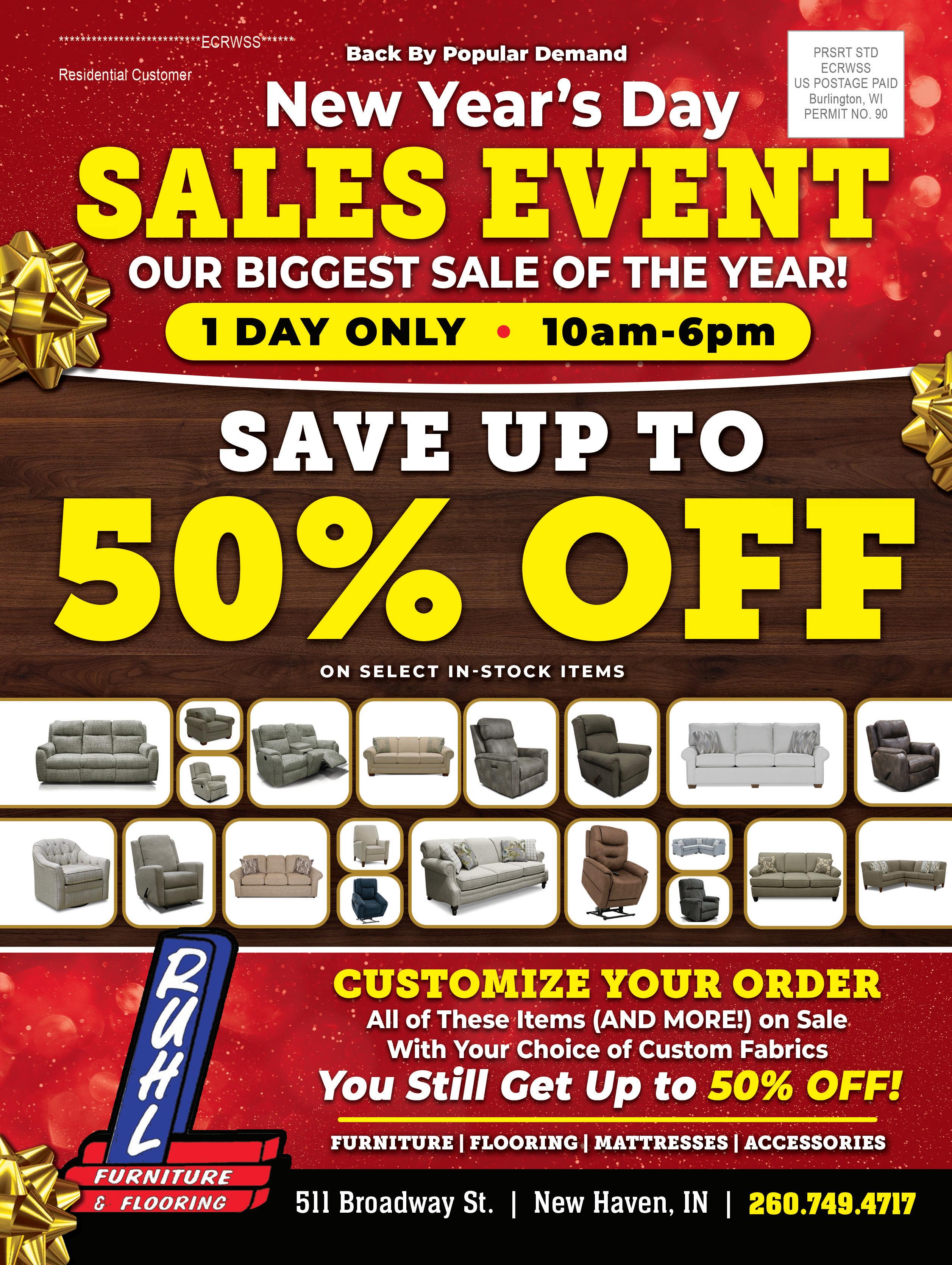 On Jan. 1, Ruhl Furniture and Flooring, in New Haven, is having storewide discounts, special order savings, and markdowns on furniture, flooring, mattresses and accessories.