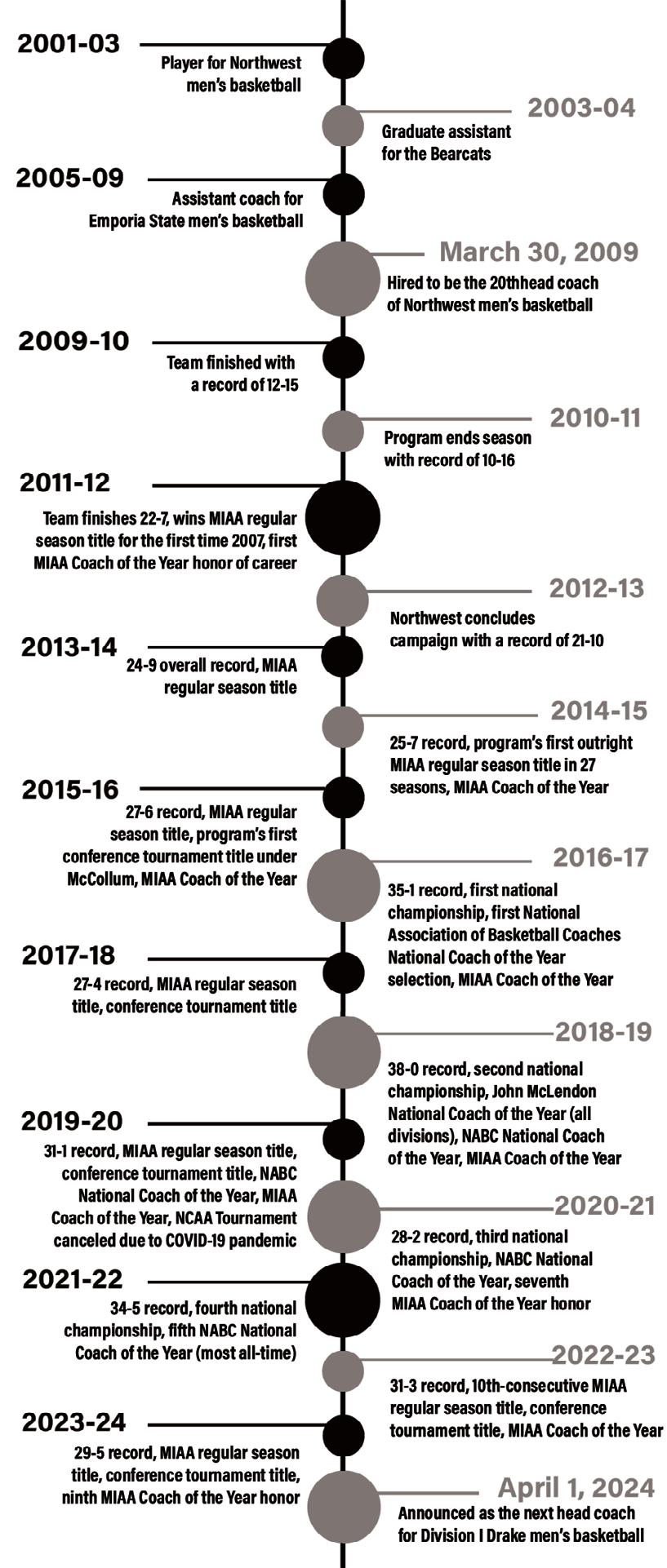 During Tappmeyer’s tenure, the Bearcats made it to 10-straight NCAA Tournaments but were never able to make it past the Elite Eight. After finishing below .500 in his first two seasons at the helm, Northwest went 22-7 in the 201112 season, and McCollum’s Bearcats won at least 21 games in every season after, eventually making it to four Final Fours and winning the previously mentioned four national championships.