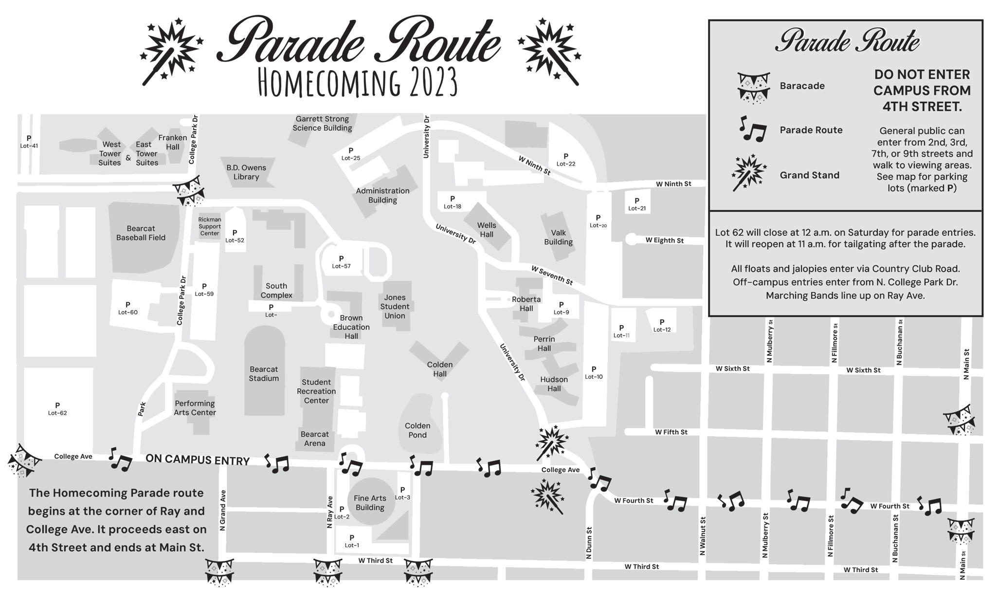 The Homecoming parade will last roughly an hour and a half and is open for the public to watch along the sidewalks of Fourth Street, up through where the parade ends at Main Street.