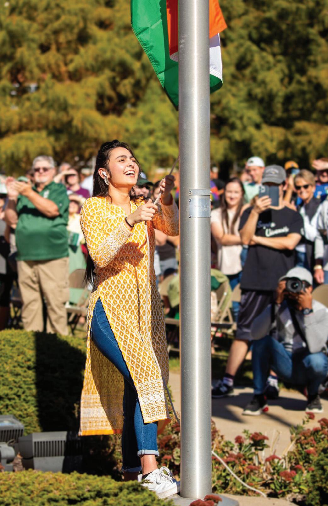 Northwest student Deep Shikha raises the Indian flag during the International Flag Raising Ceremony Oct. 20, 2023 at the Joyce and Harvey White International Flag Plaza.