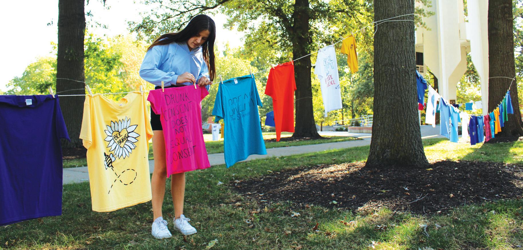 A Northwest student helps set up the Clothesline Project put on by It’s On Us. This year’s project, which is Oct. 7-14, gives survivors an opportunity to share their stories while hanging up clothes they were wearing at the time.