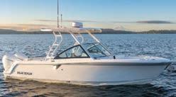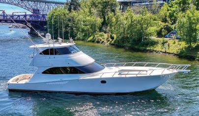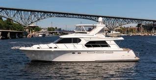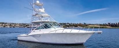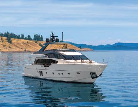 e sensible layout of the boat works well for cruising, entertaining, or simply relaxing. Multiple seating areas allow for separate intimate conversations and there is enough room for substantial gatherings. e expansive ybridge not only has a full outdoor control station but comfortable seating, a table, sunpad, a wetbar with fridge, and an electric BBQ. e back deck is large enough for an 11’ RIB and an Ollson Manufacturing crane davit with power rotation that comes standard. A Bimini top and canvas enclosure are ybridge options.