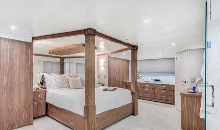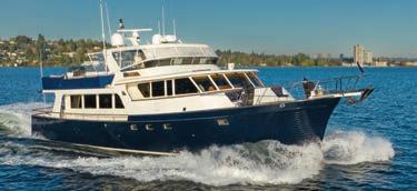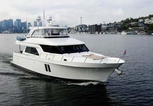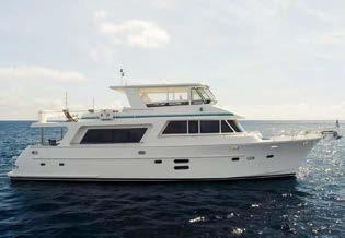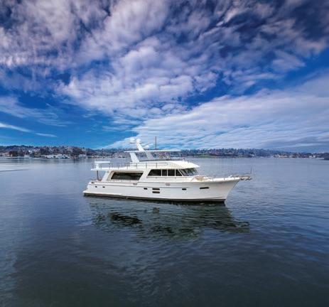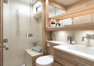 e pilothouse has an adjustable helm seat, an adjacent dining table, and a watertight door that opens to the wide side deck for easy access whether anchoring or docking. ere is also a convenient centrally located day head that is easy to reach from all the topside areas, including the ybridge. e cabin deck accommodations include a full beam master stateroom with en suite head, a large VIP cabin with a queen berth, a substantial twin berth cabin, and another belowdecks head complete with separate shower.