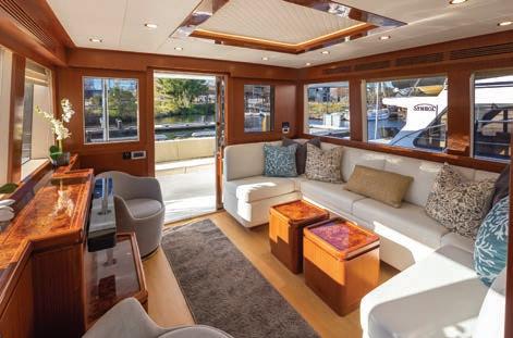 All boats come ready to cruise with an extensive list of standard equipment that typically would be optional on other similar boats. e 52 comes with a deluxe Garmin electronics package valued at $38,000 that includes a Fantom radar, autopilot with remote, AIS, VHF, electronic charts, and twin 16” 8616MFD displays with two 11” ybridge repeaters. Other notable standard equipment includes a Lewmar electric windlass, anchor and ground tackle, an inverter, AGM 8D battery system, an electric bow thruster with separate AGM batteries, ve zones of reverse cycle heat and air, an Onan 13.5 kW genset, canvas covers for exterior furniture, Samsung at screen TVs, Bose surround sound, and much more.