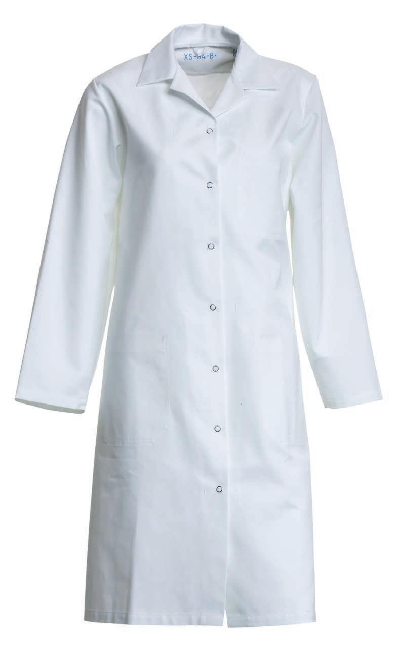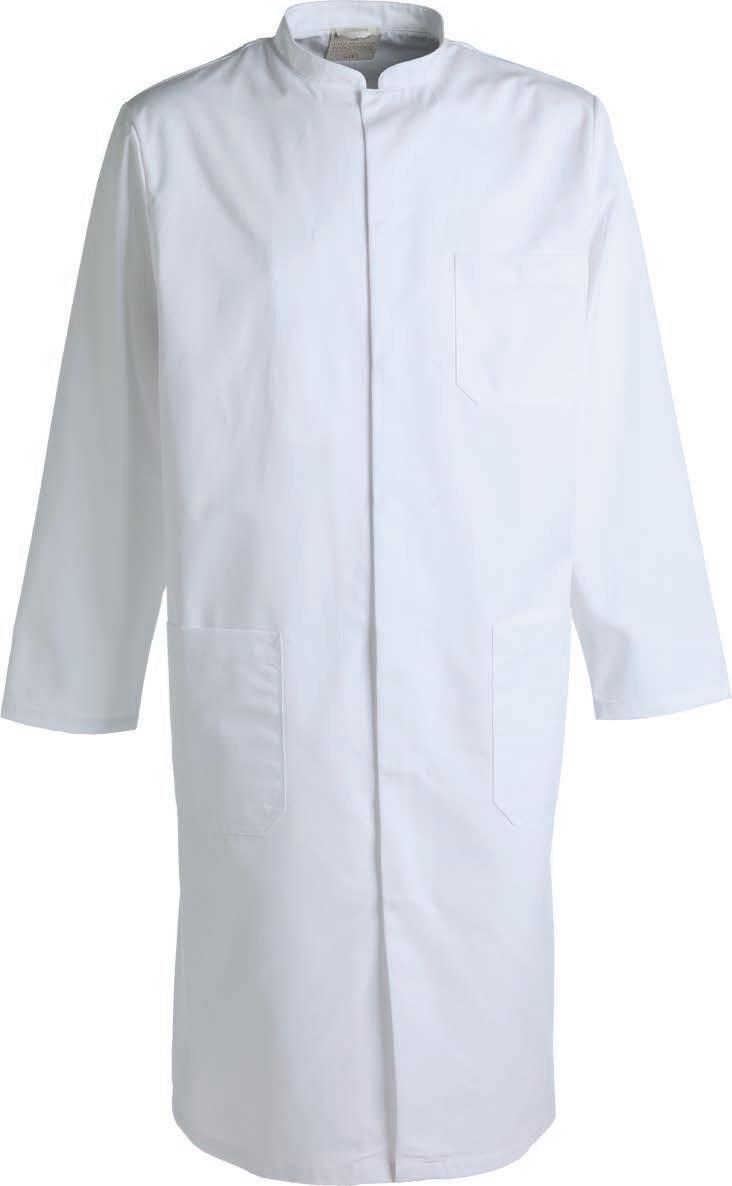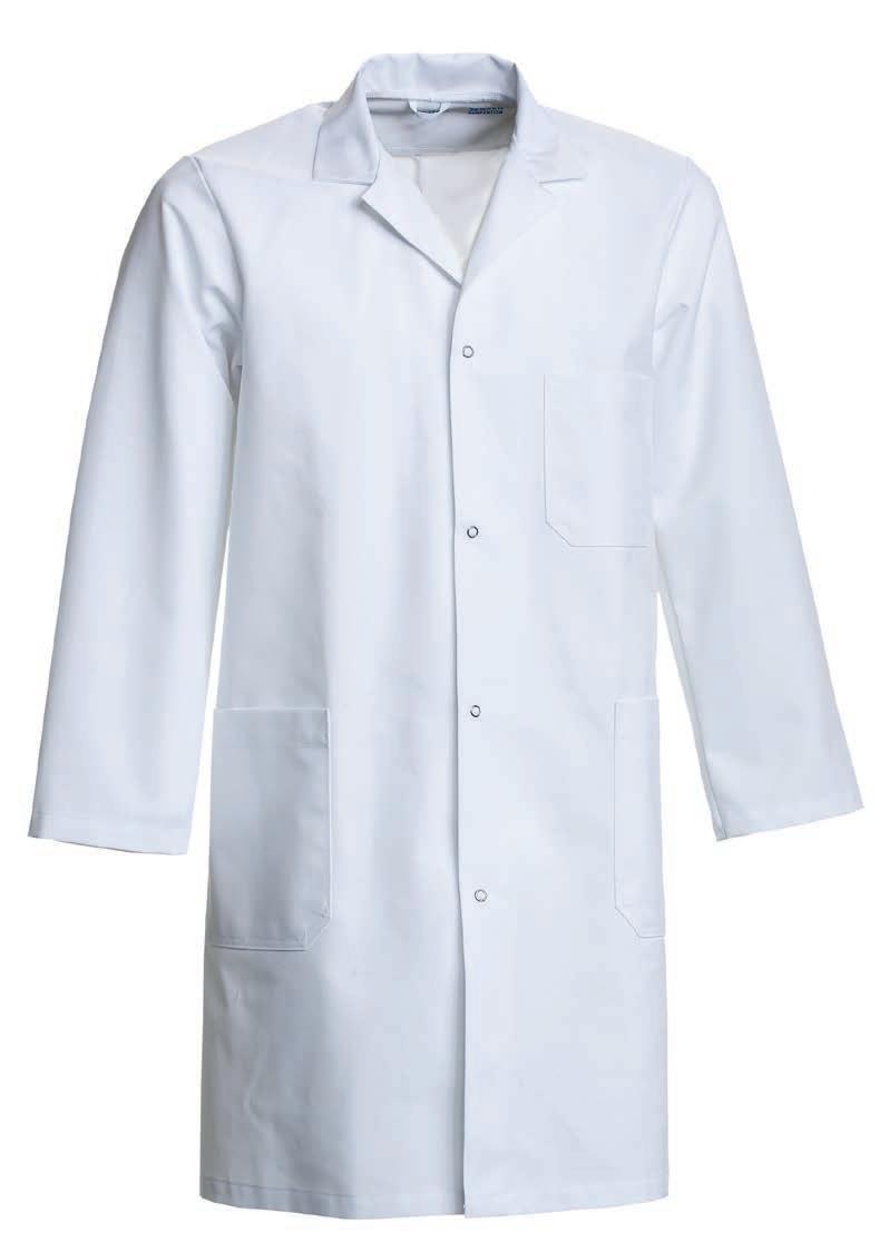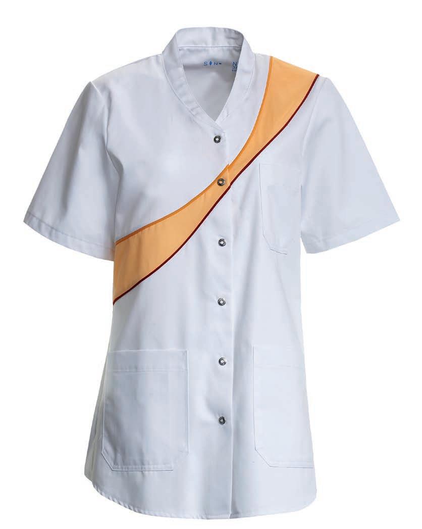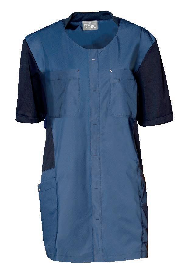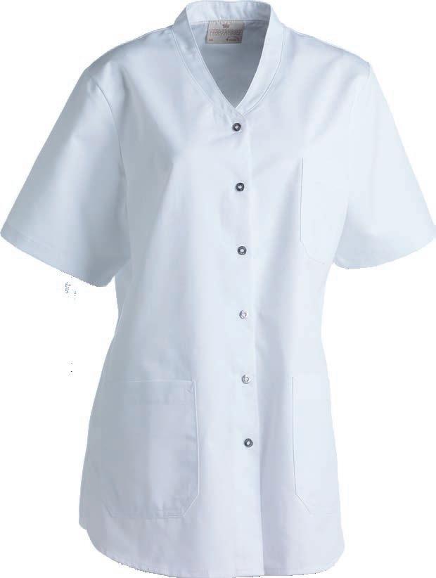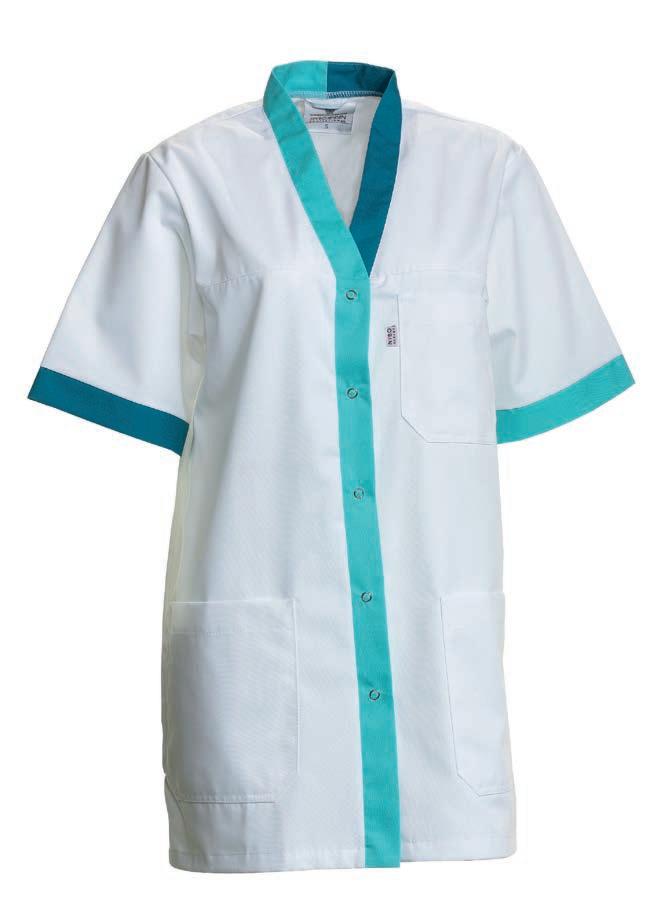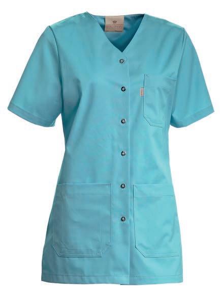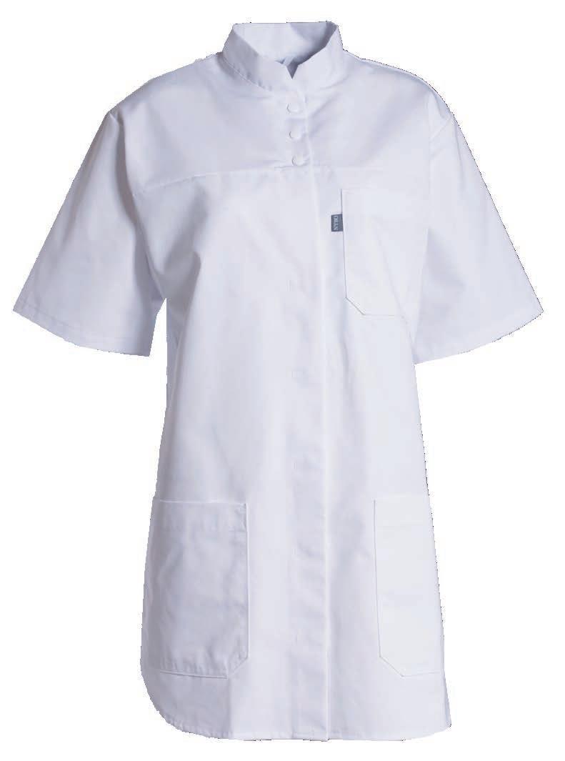 Coloured smock with lapel. As per regulations, it has an internal left breast pocket. The sleeve openings can be adjusted with snap fasteners. It has concealed snap fasteners on a placket. The cut is straight up and down with good length at the back.