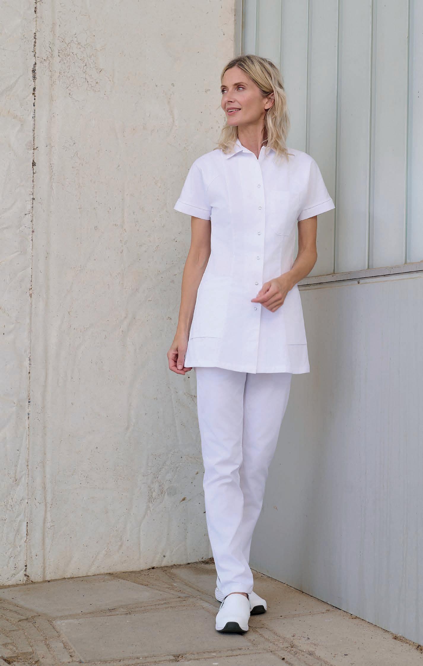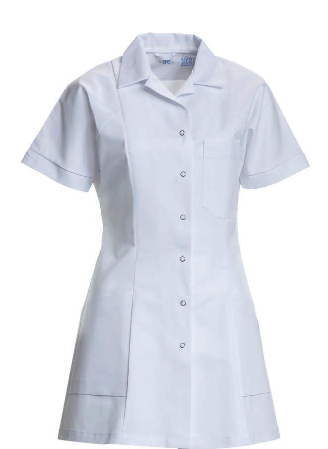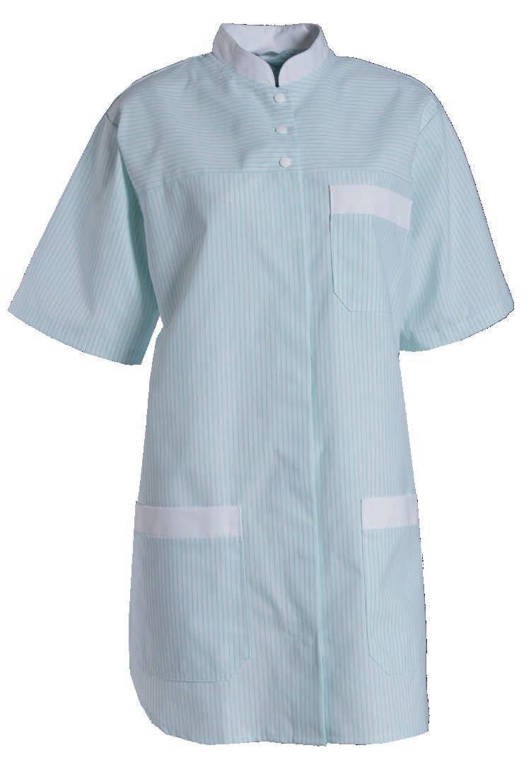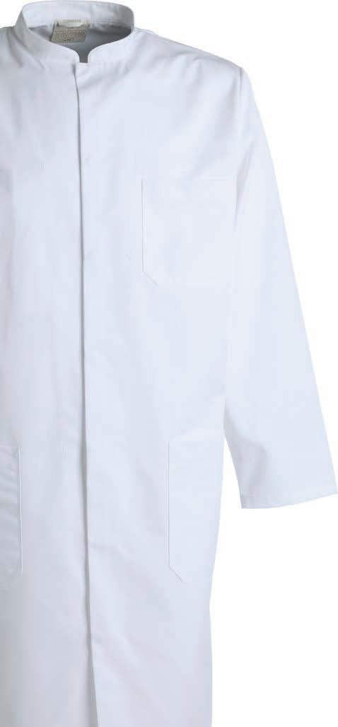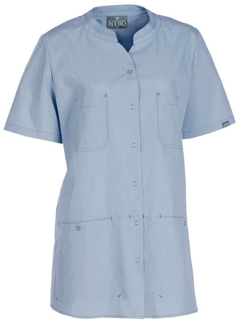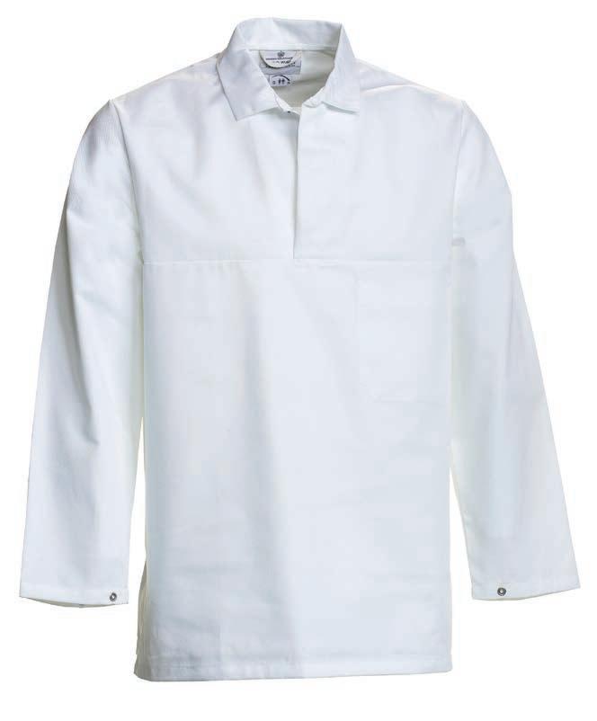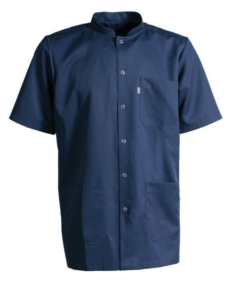 Coloured smock with lapel. As per regulations, it has an internal left breast pocket. The sleeve openings can be adjusted with snap fasteners. It has concealed snap fasteners on a placket. The cut is straight up and down with good length at the back.