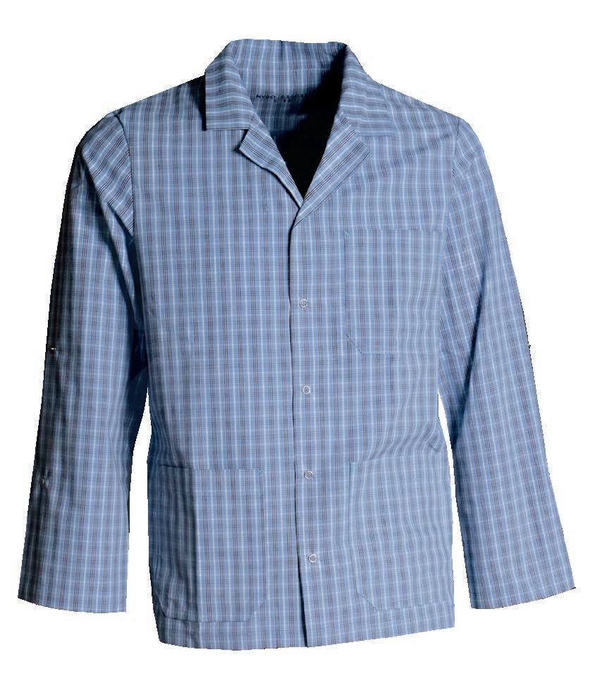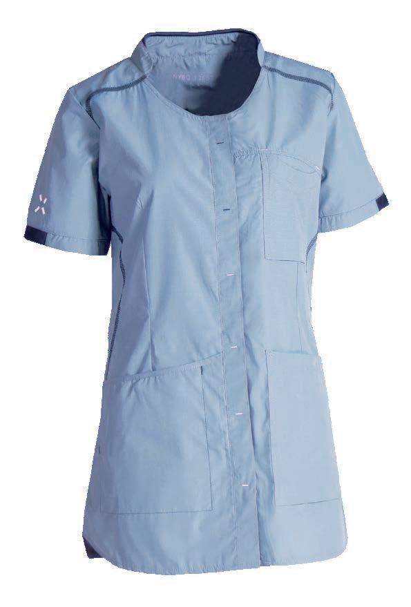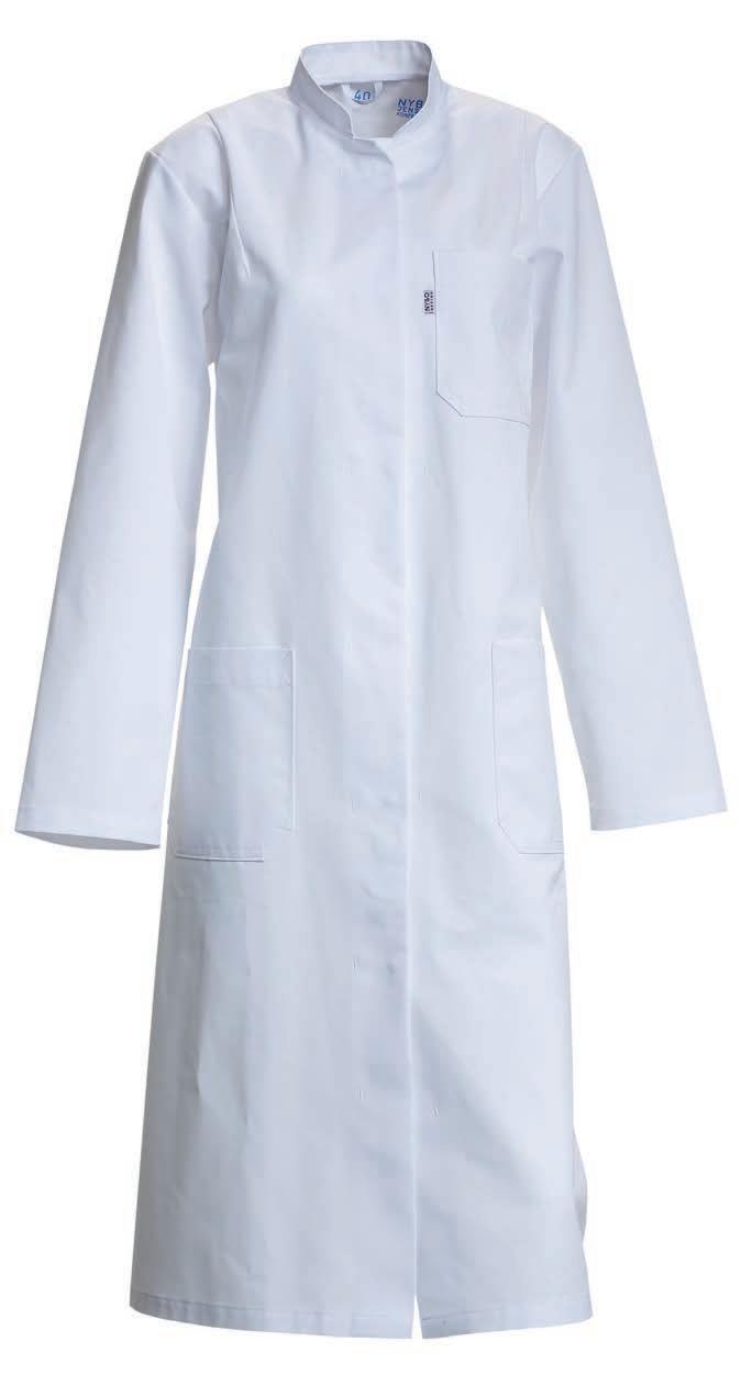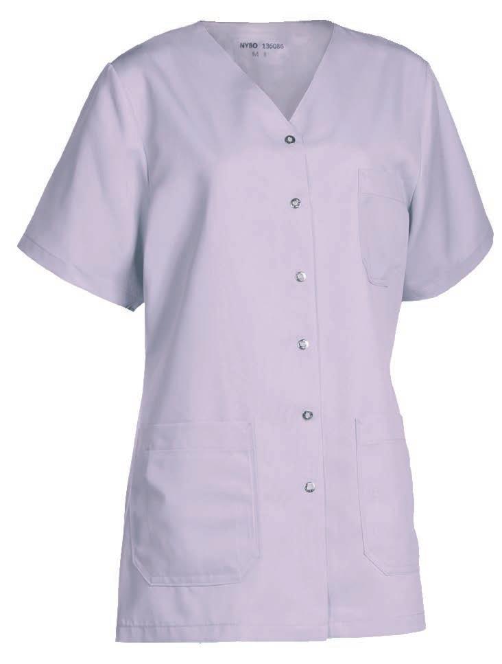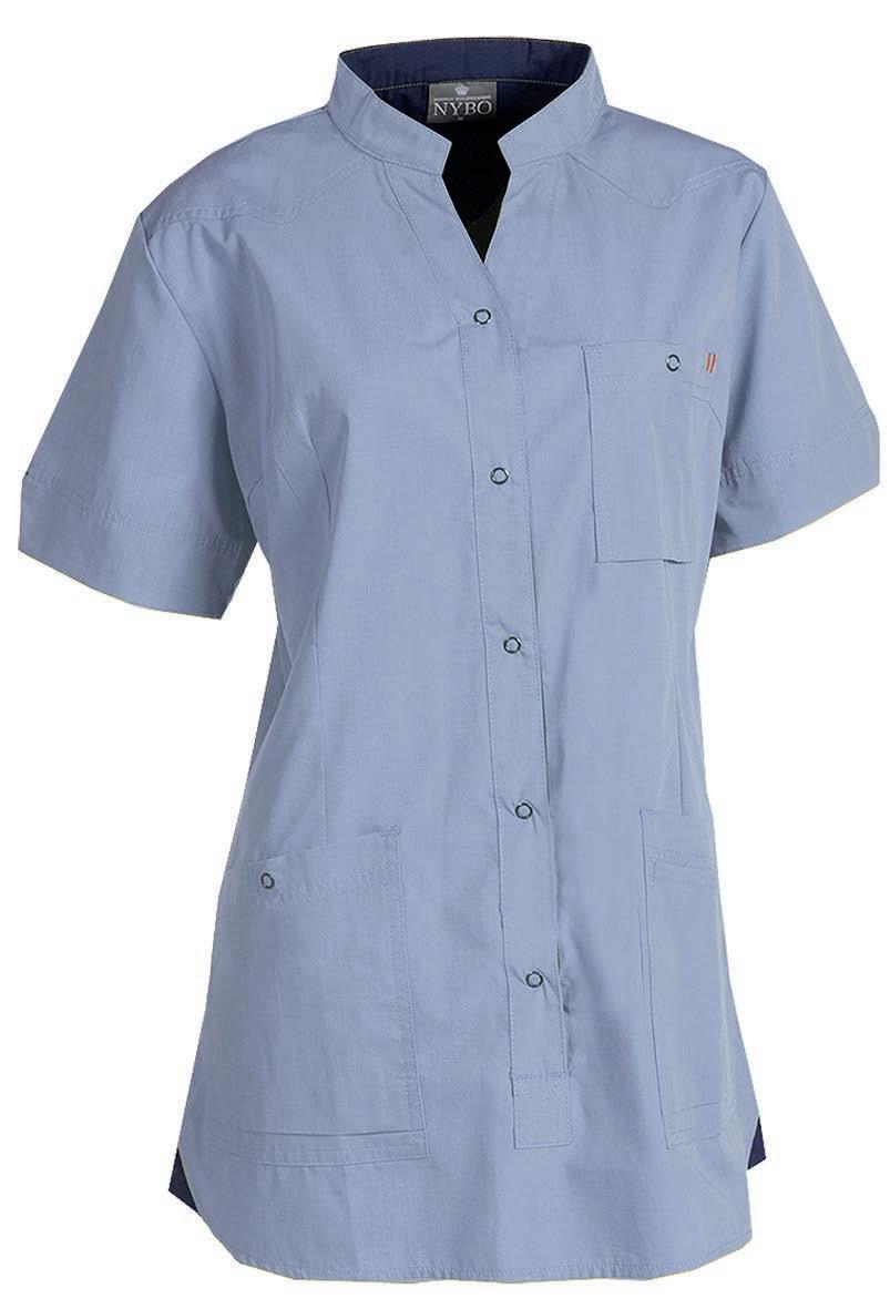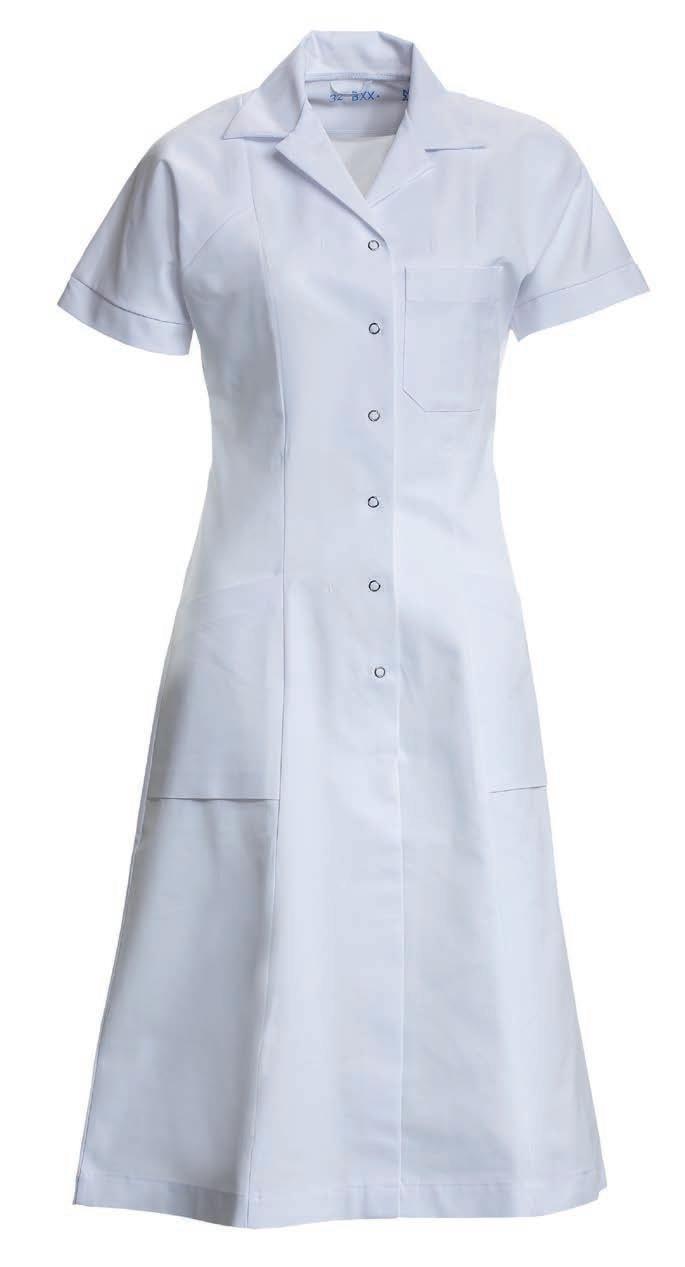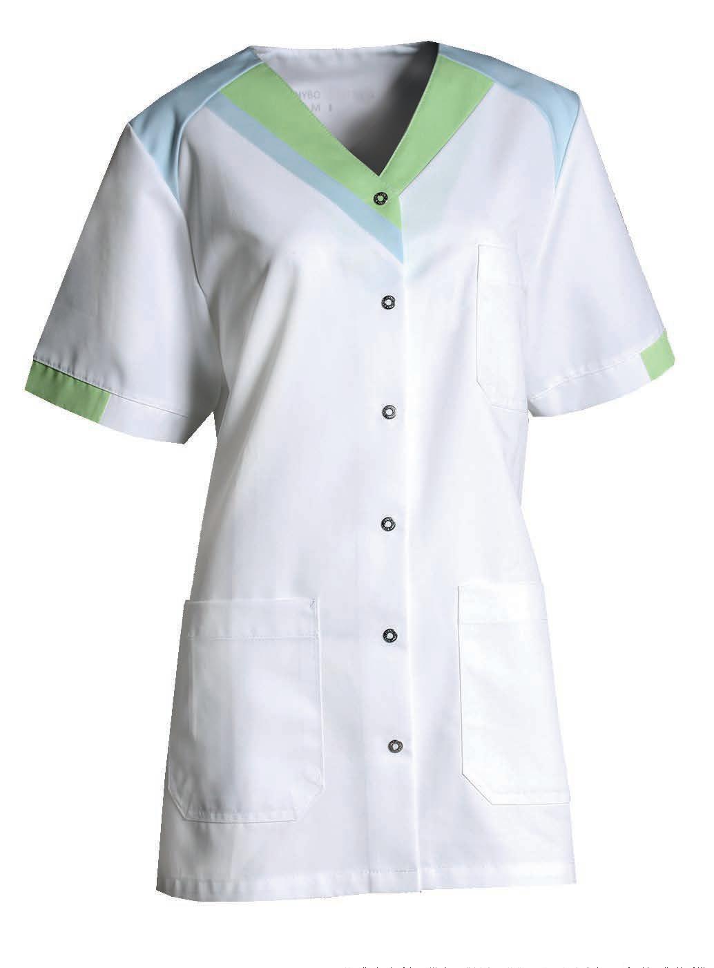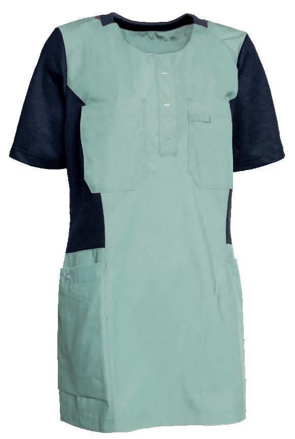 Coloured smock with lapel. As per regulations, it has an internal left breast pocket. The sleeve openings can be adjusted with snap fasteners. It has concealed snap fasteners on a placket. The cut is straight up and down with good length at the back.