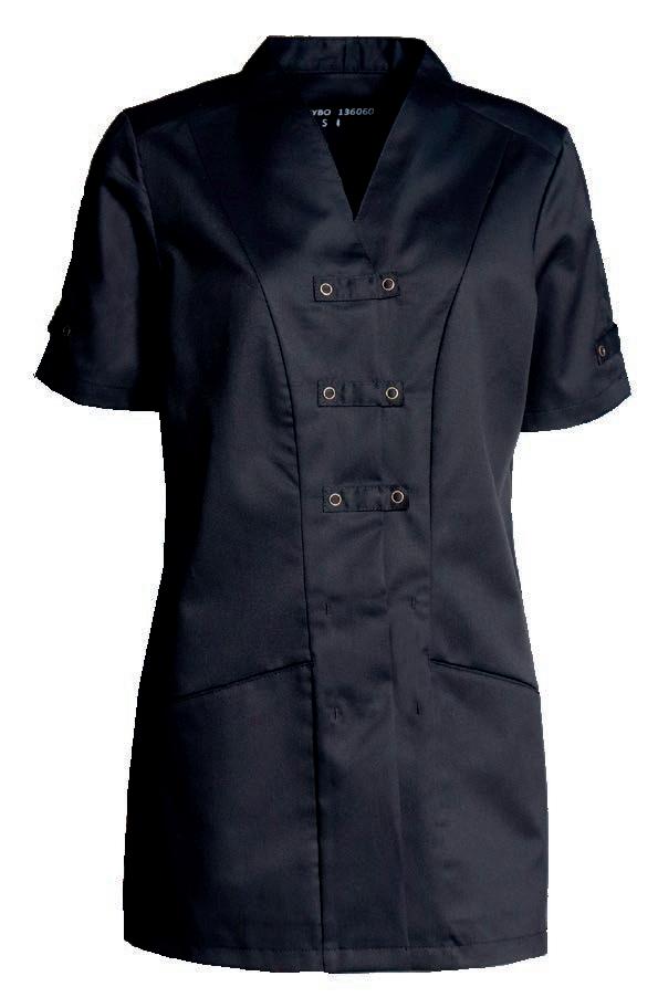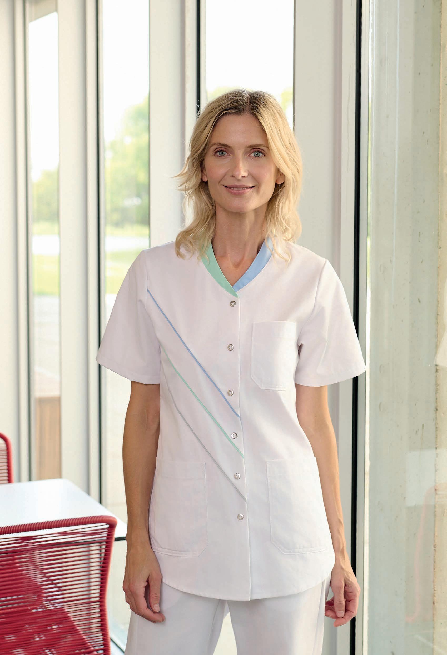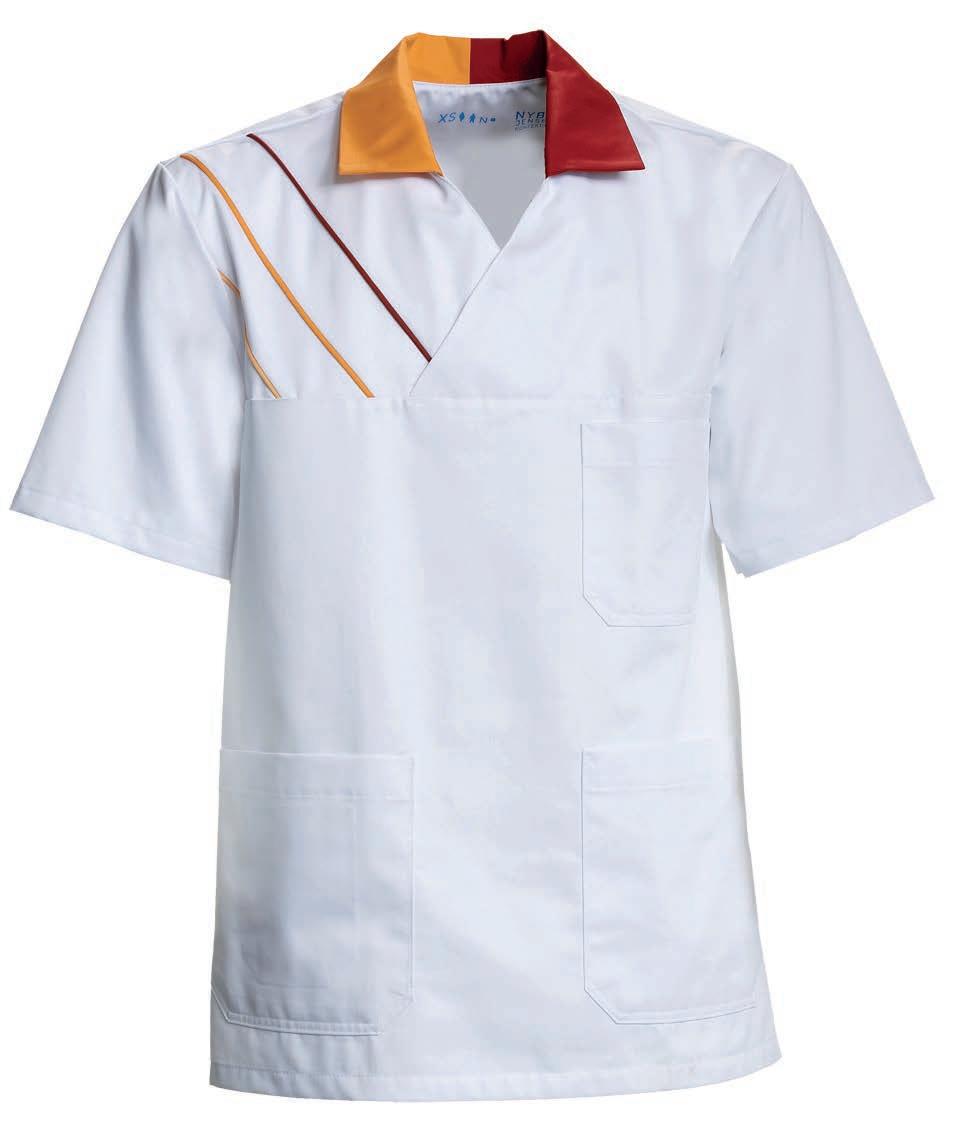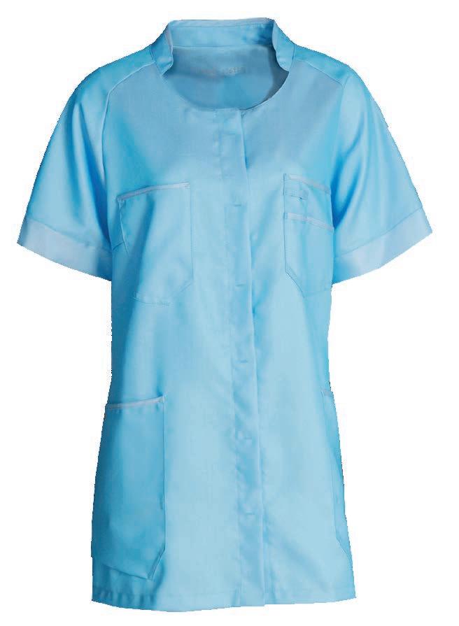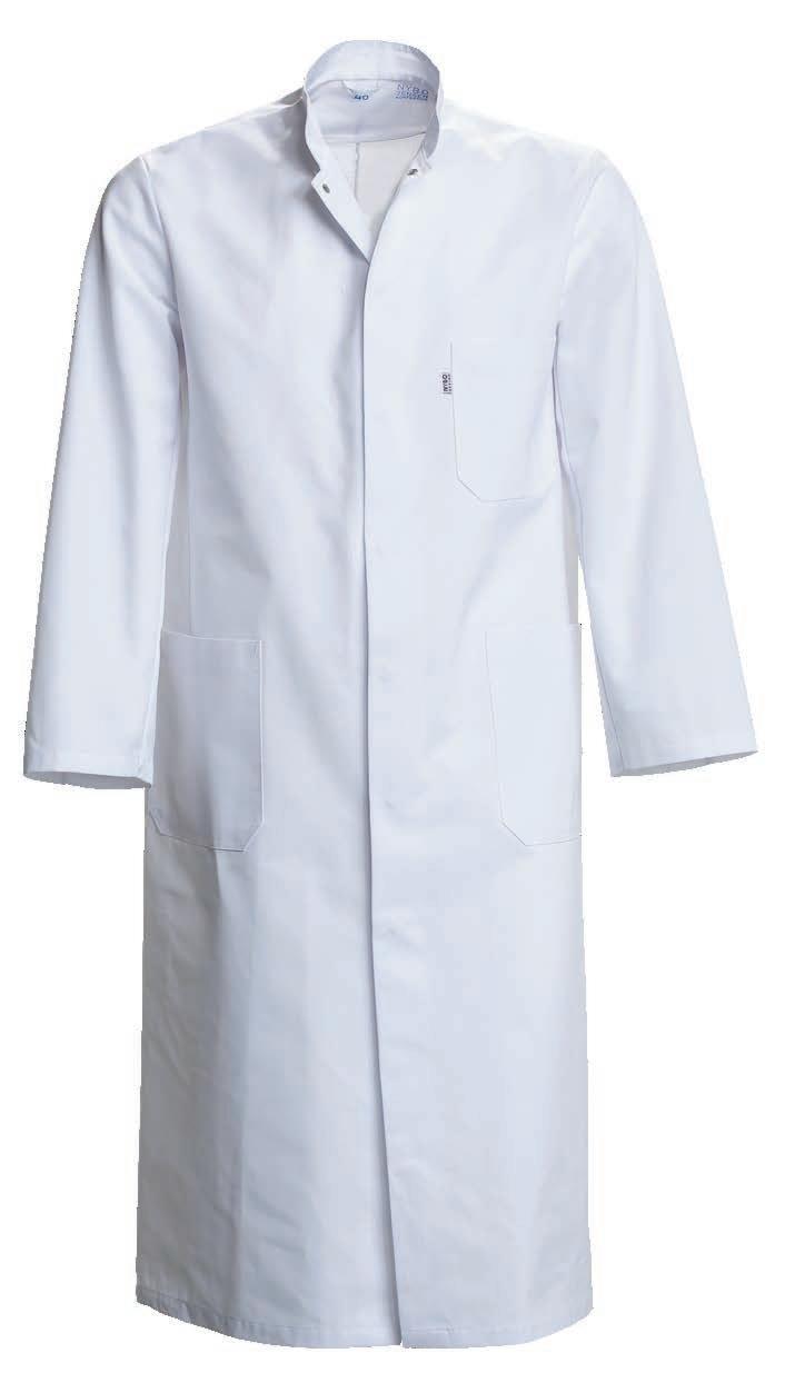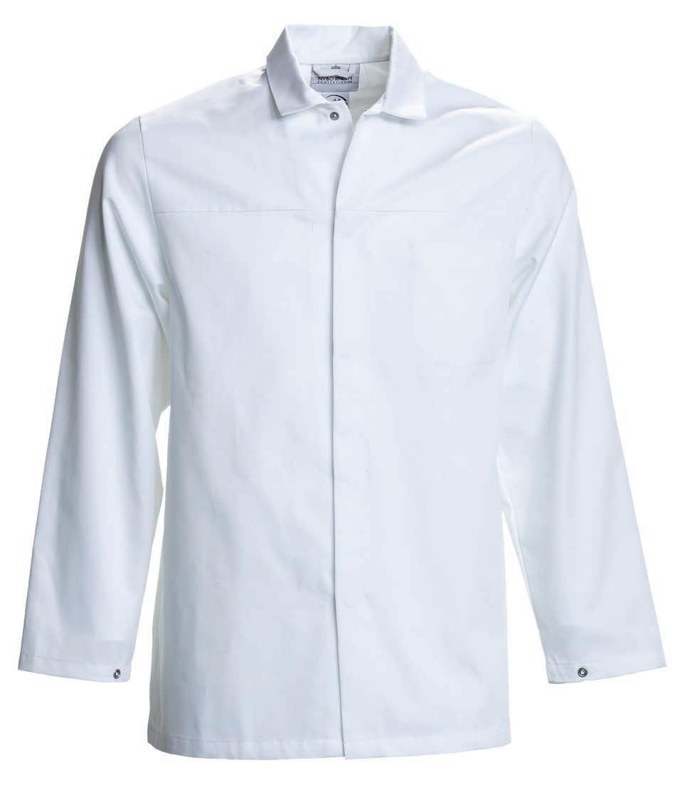 Coloured smock with lapel. As per regulations, it has an internal left breast pocket. The sleeve openings can be adjusted with snap fasteners. It has concealed snap fasteners on a placket. The cut is straight up and down with good length at the back.