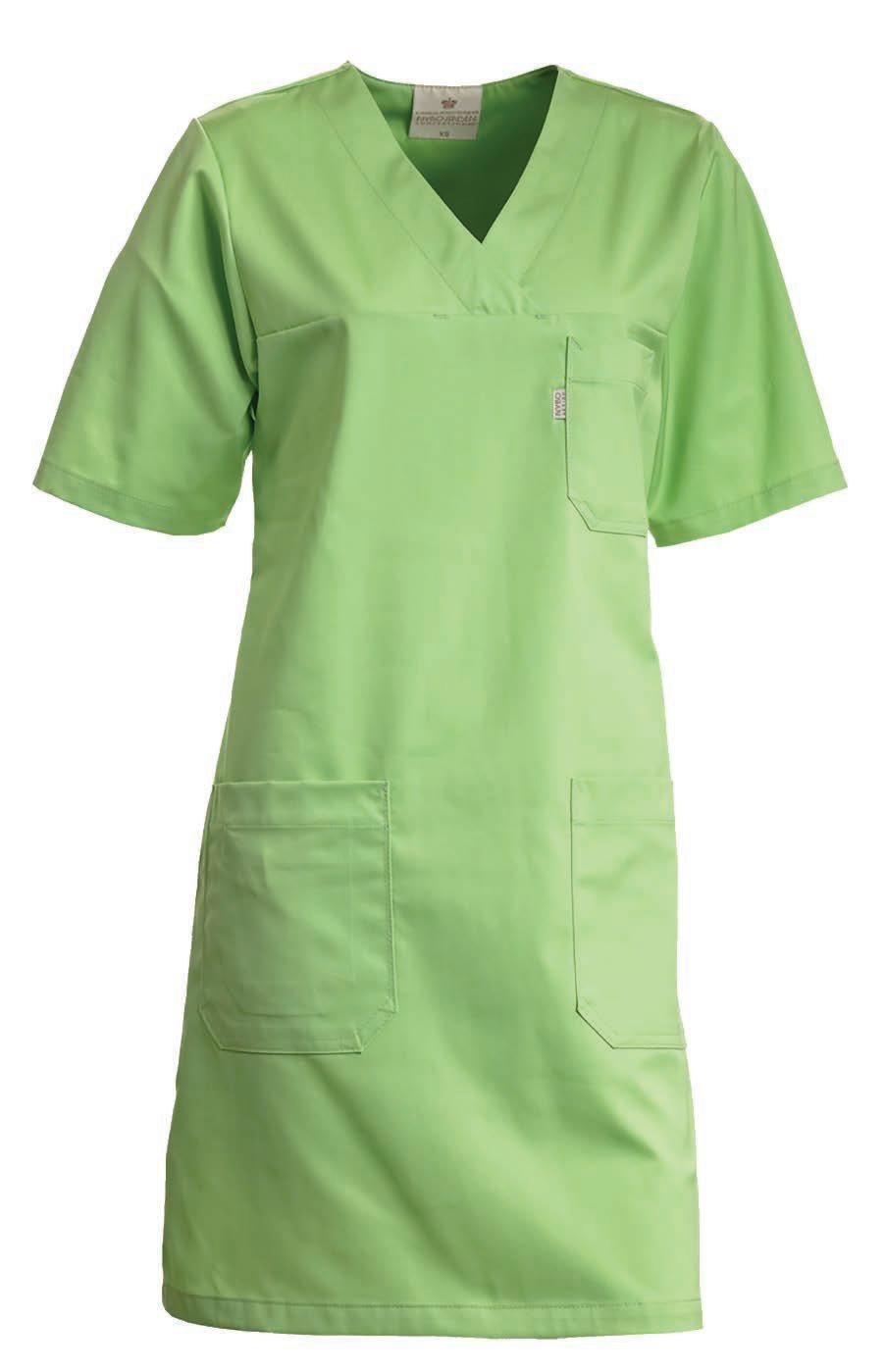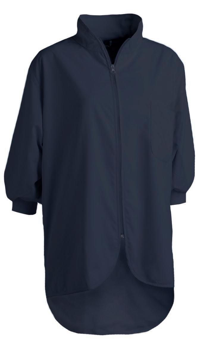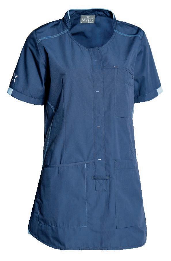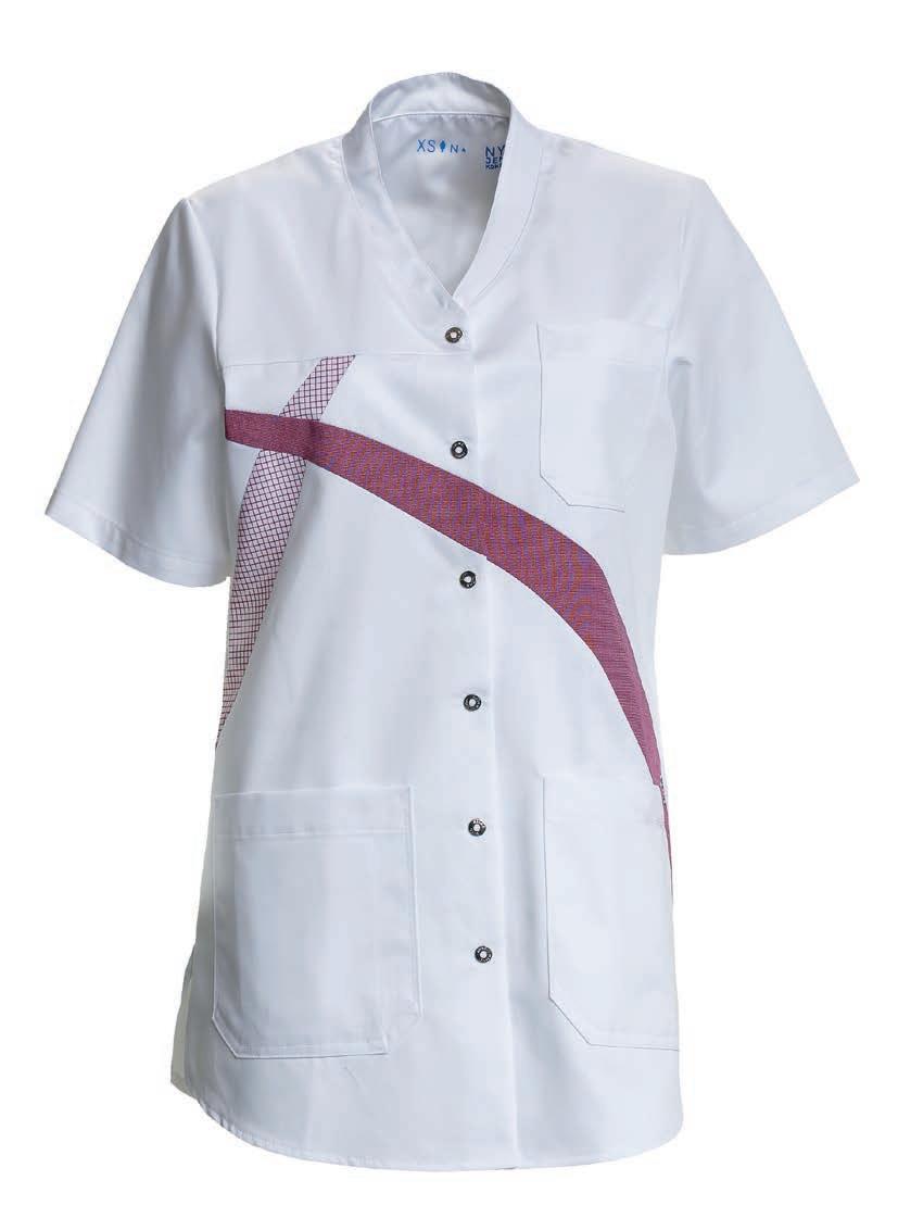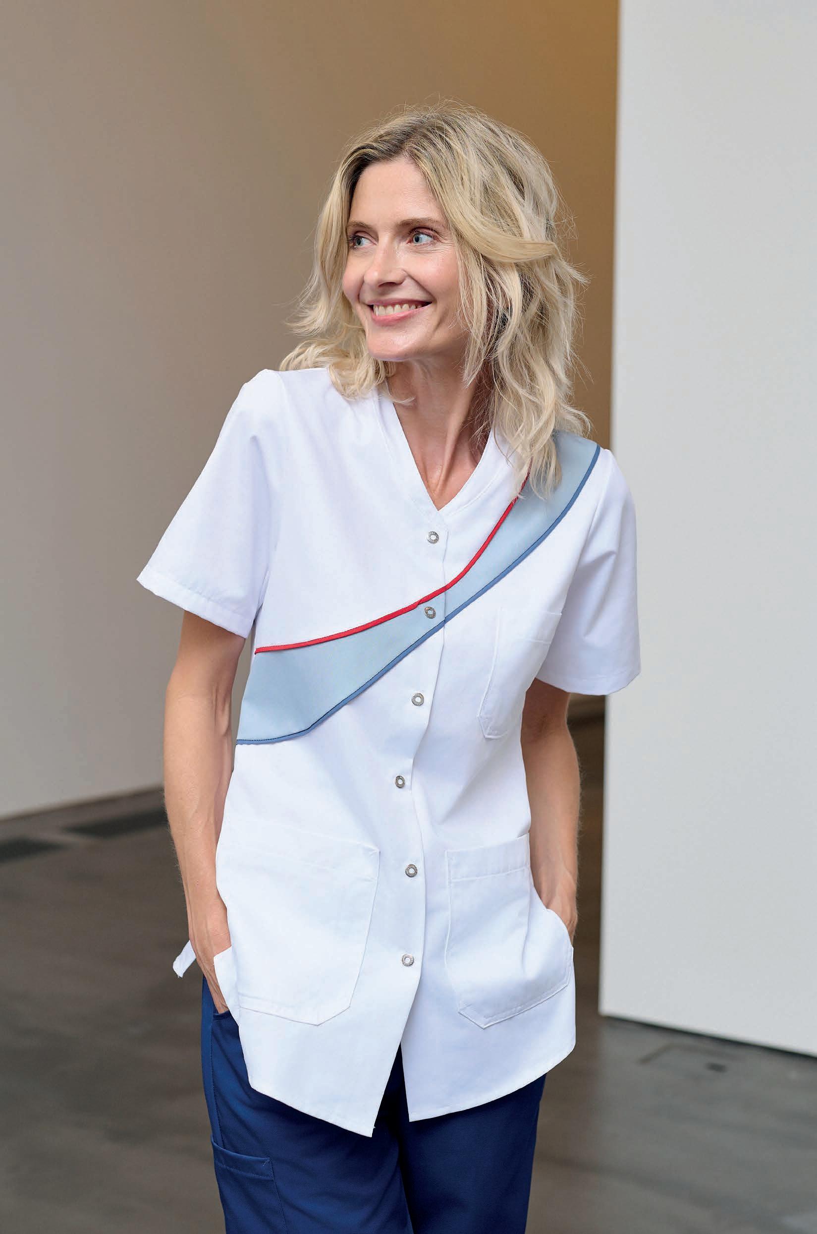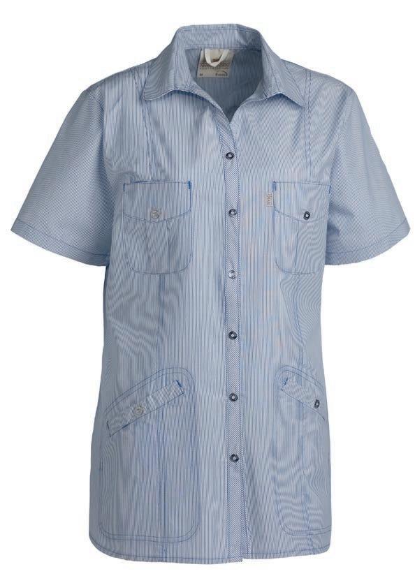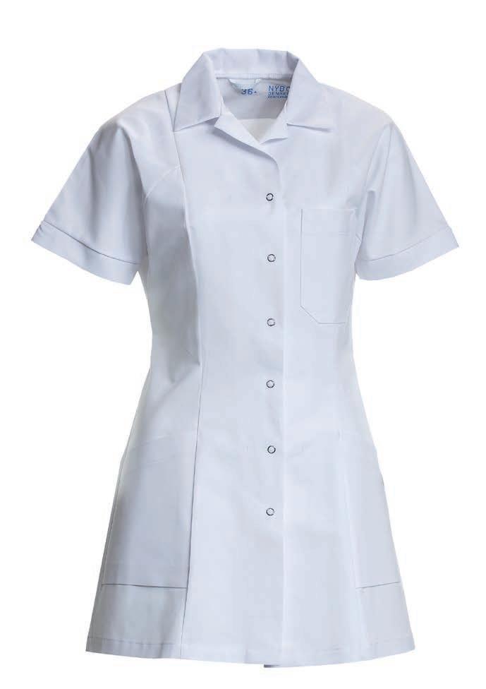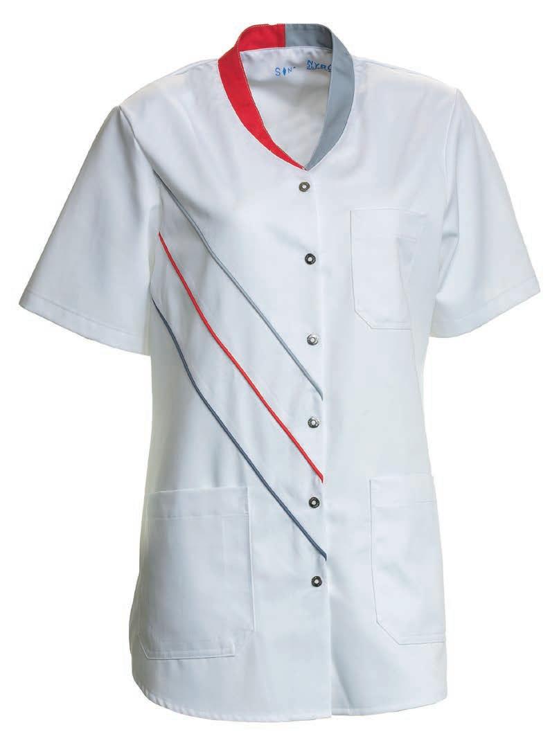 Coloured smock with lapel. As per regulations, it has an internal left breast pocket. The sleeve openings can be adjusted with snap fasteners. It has concealed snap fasteners on a placket. The cut is straight up and down with good length at the back.