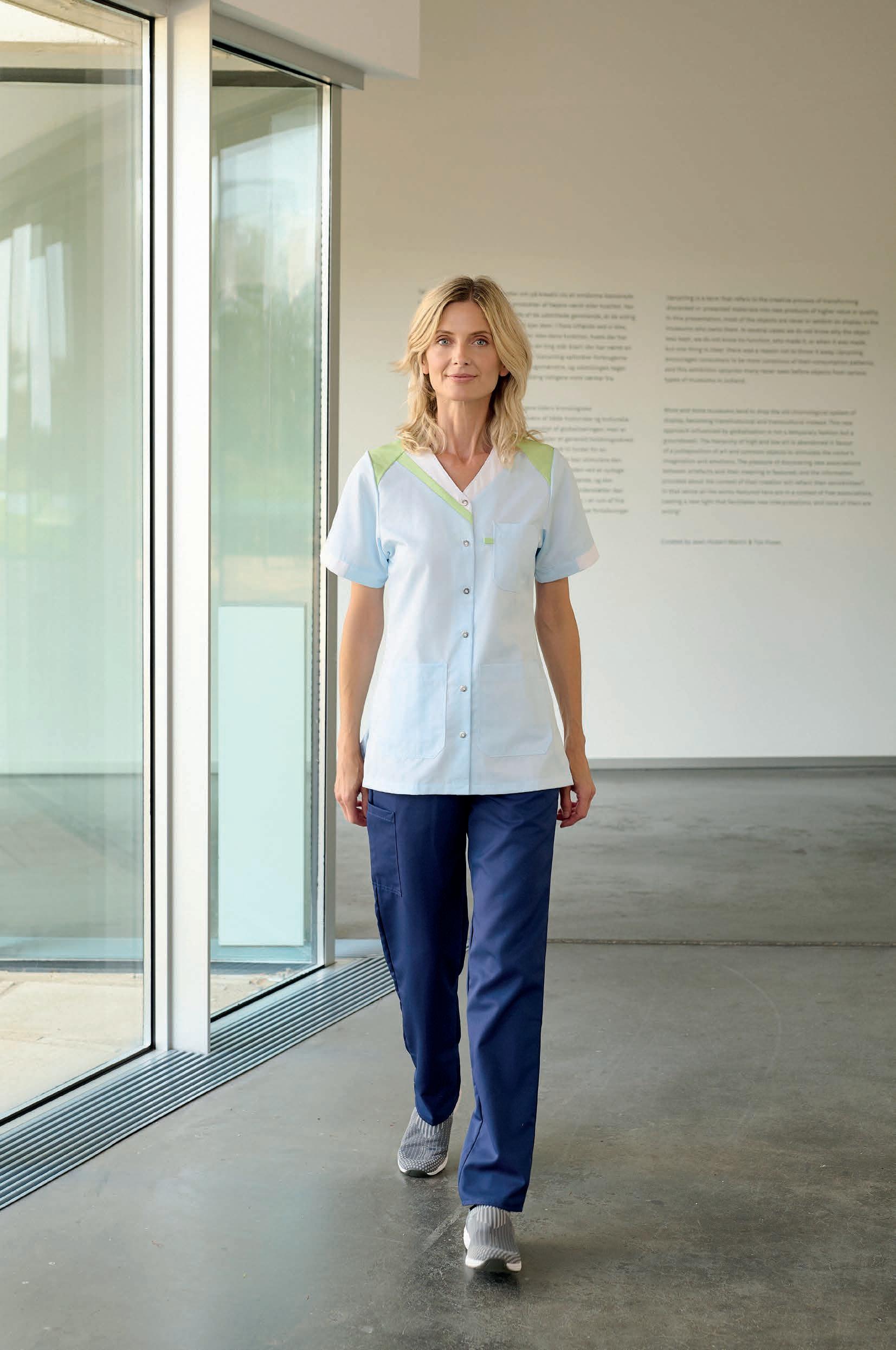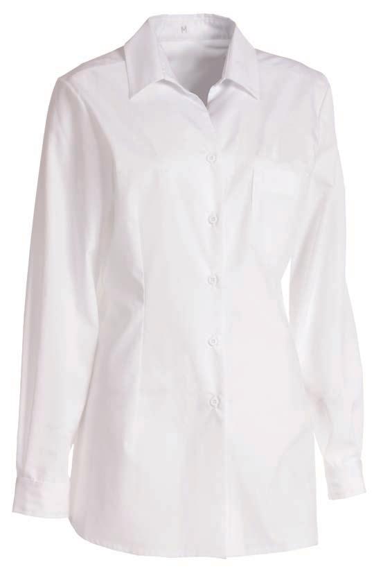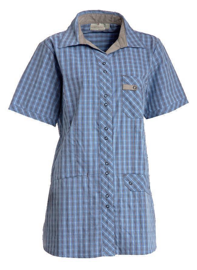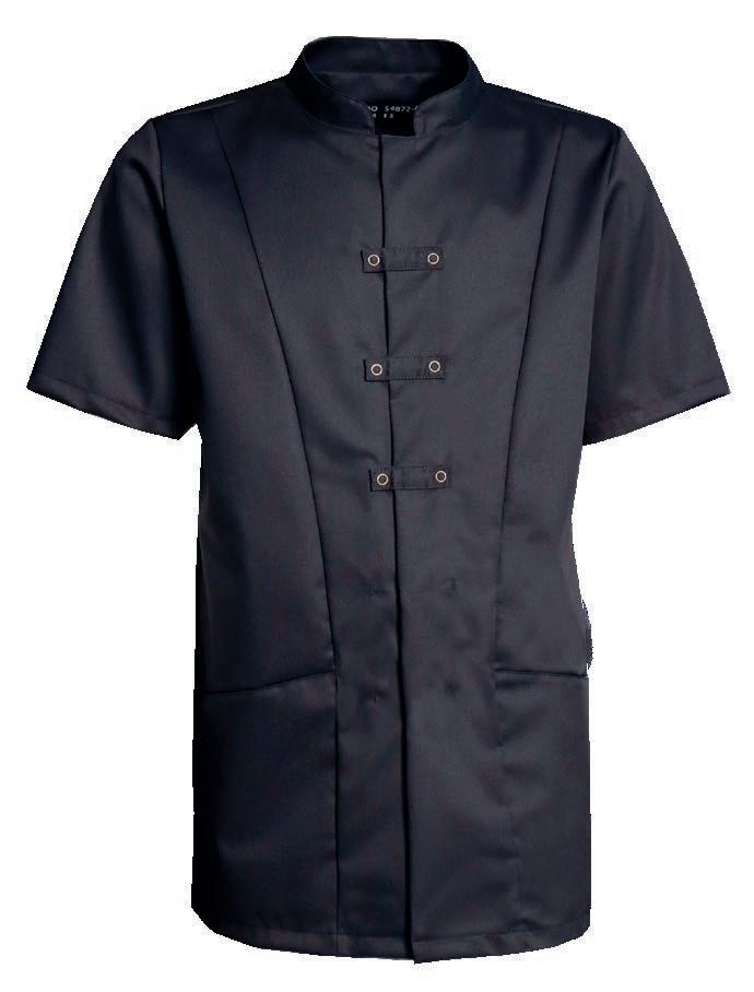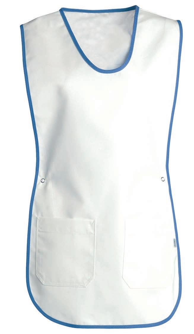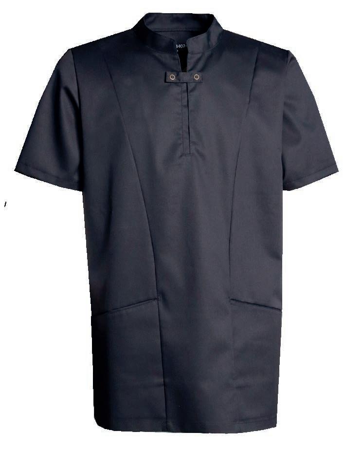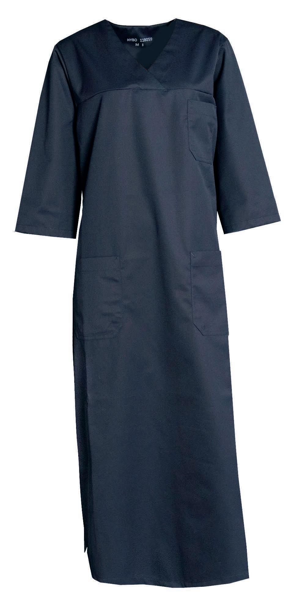 Coloured smock with lapel. As per regulations, it has an internal left breast pocket. The sleeve openings can be adjusted with snap fasteners. It has concealed snap fasteners on a placket. The cut is straight up and down with good length at the back.