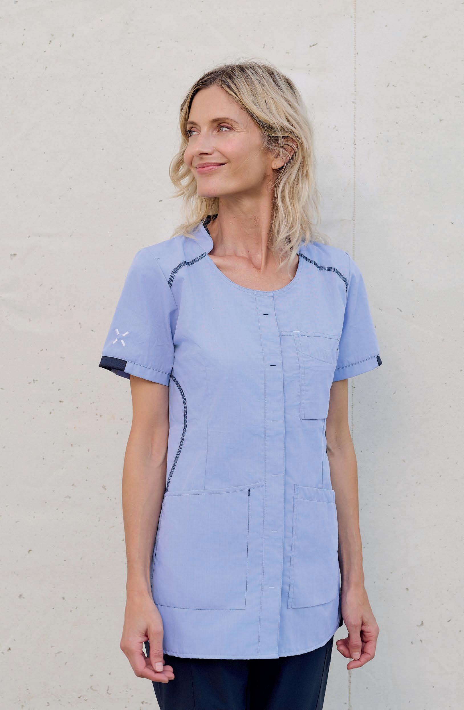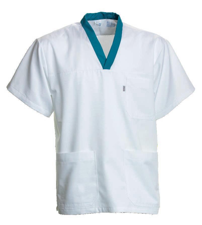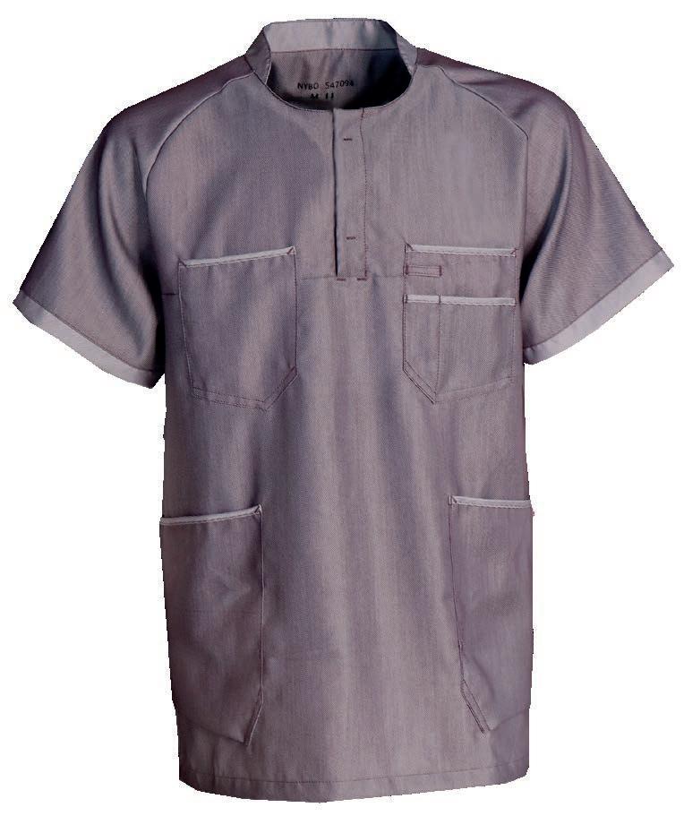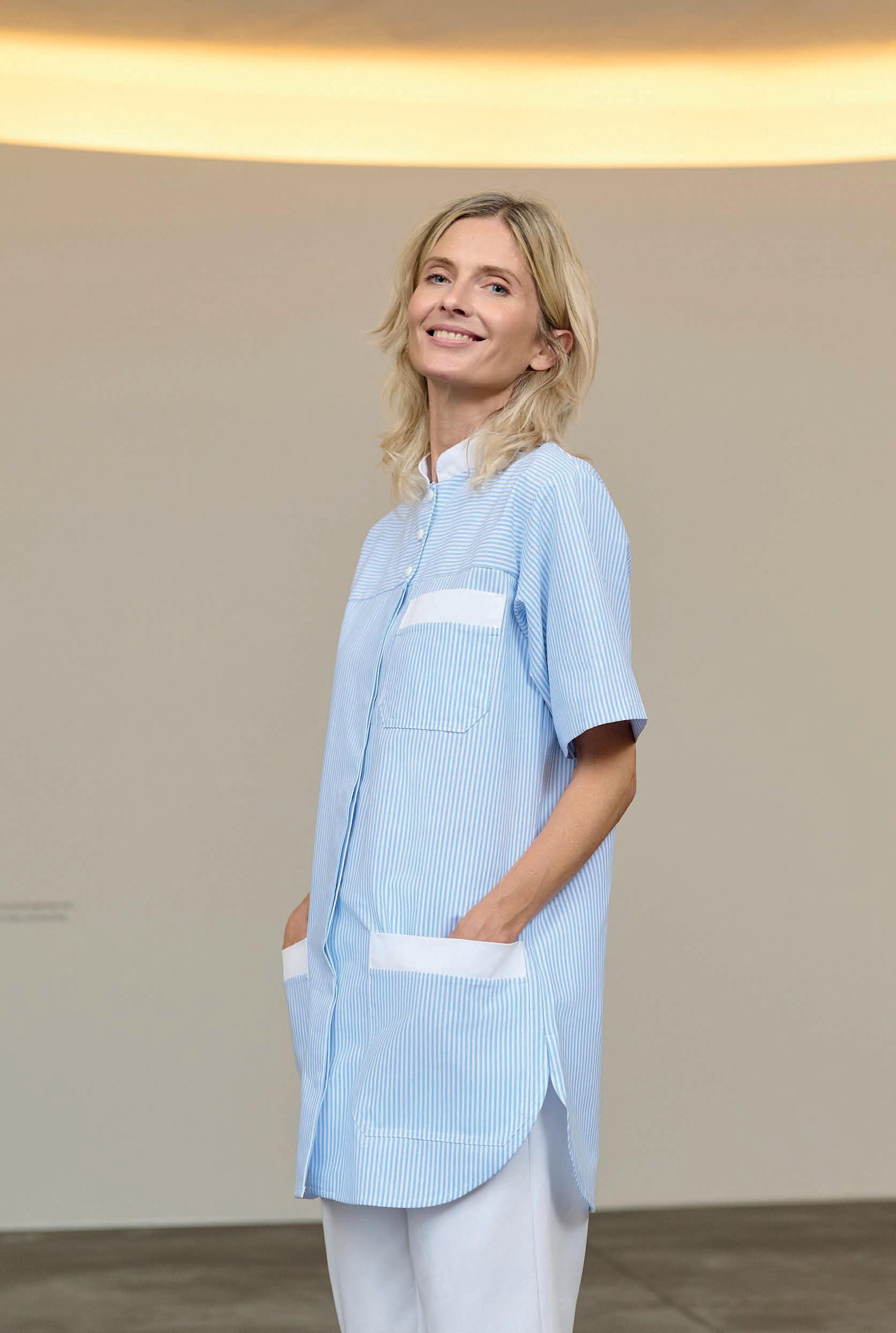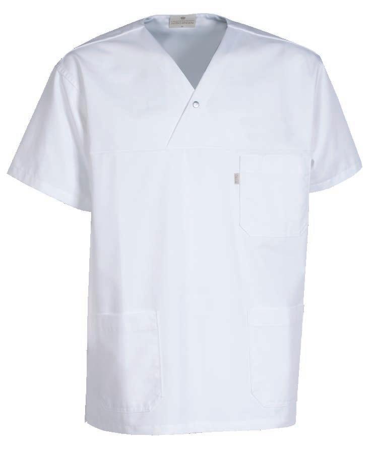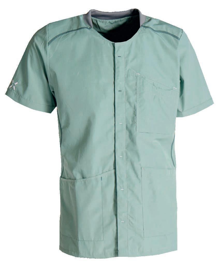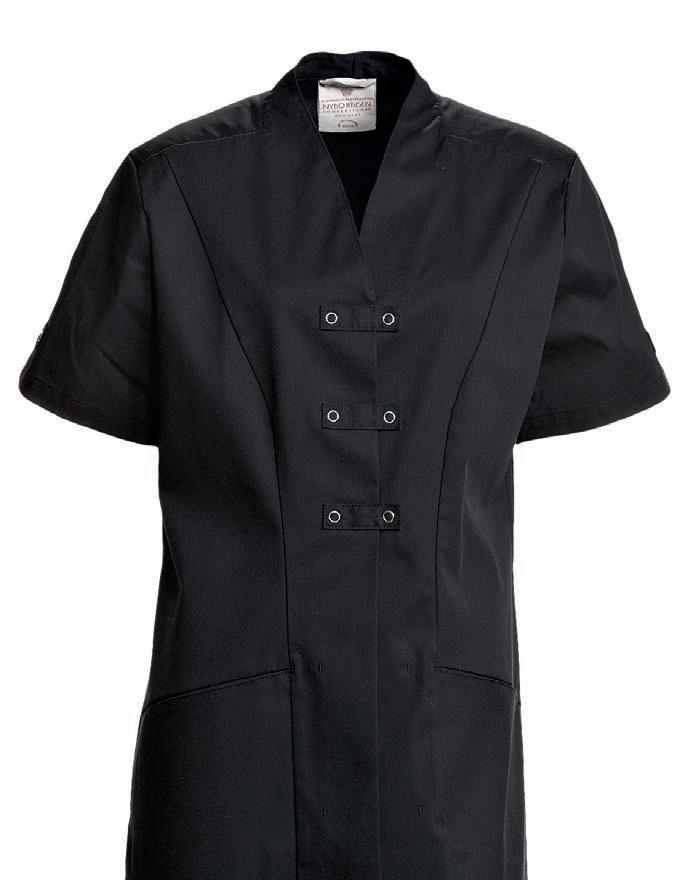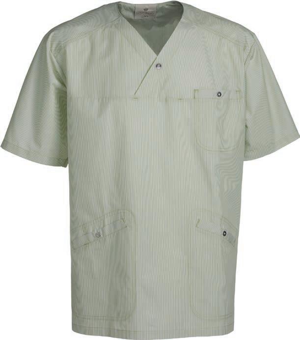 Coloured smock with lapel. As per regulations, it has an internal left breast pocket. The sleeve openings can be adjusted with snap fasteners. It has concealed snap fasteners on a placket. The cut is straight up and down with good length at the back.