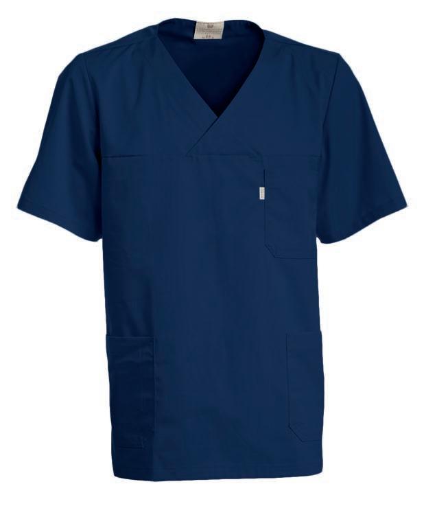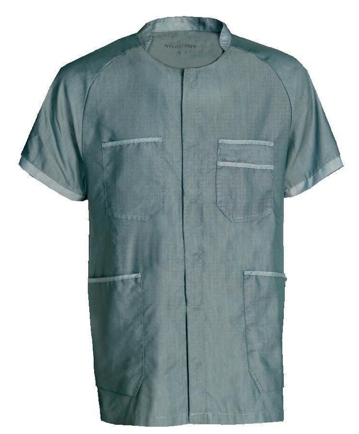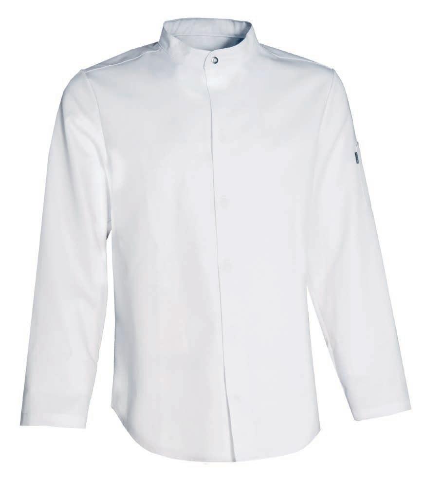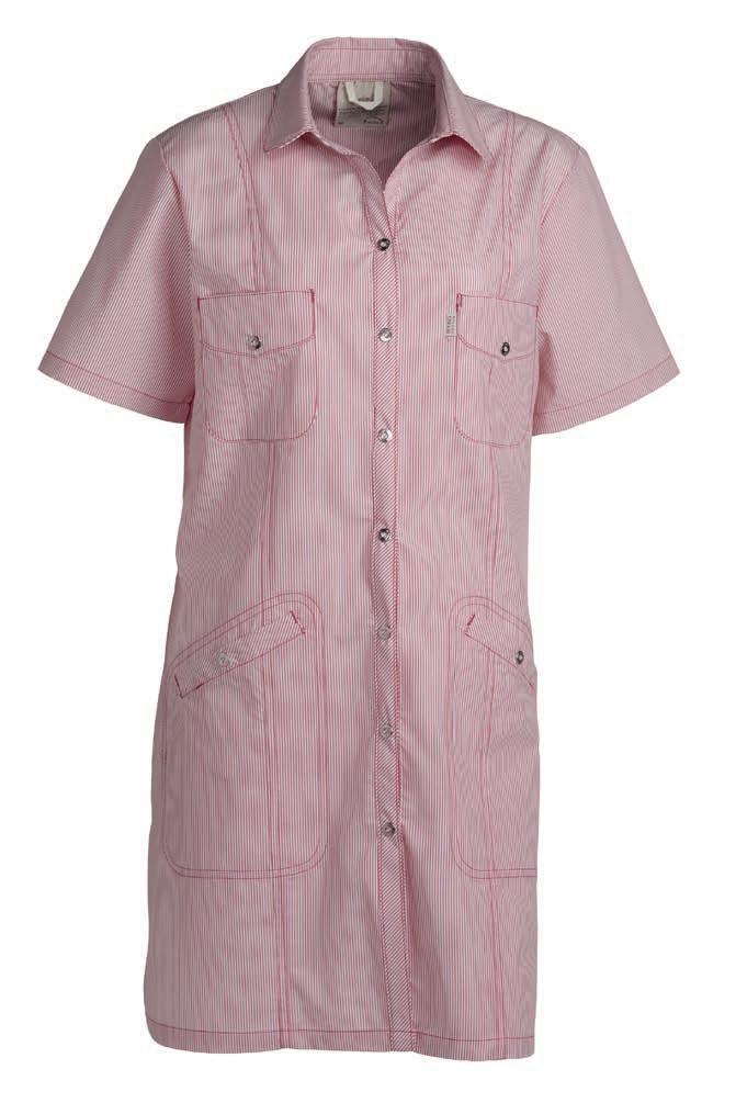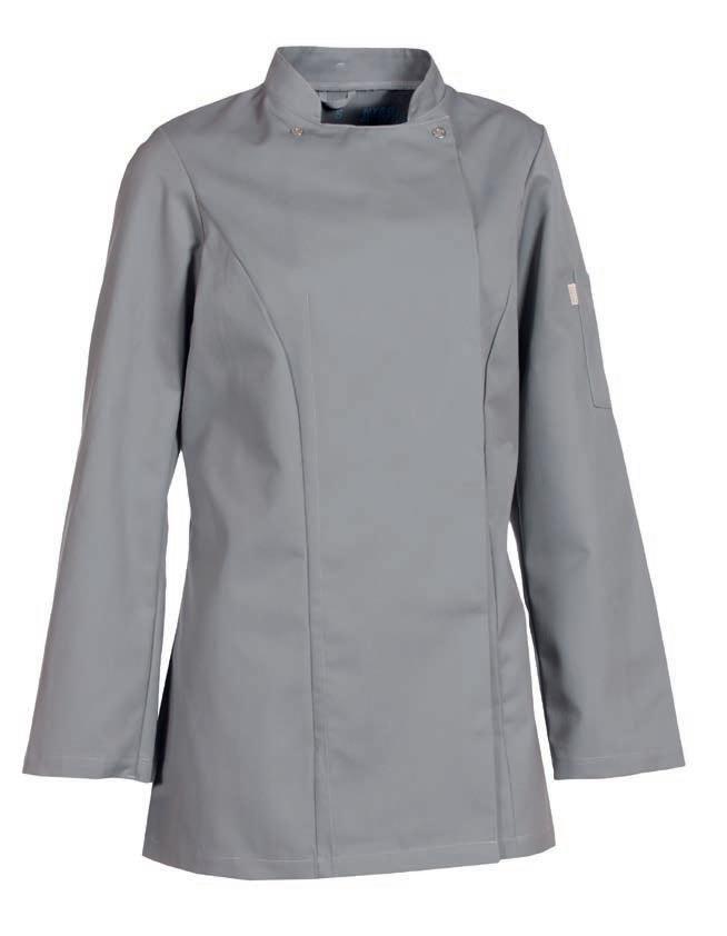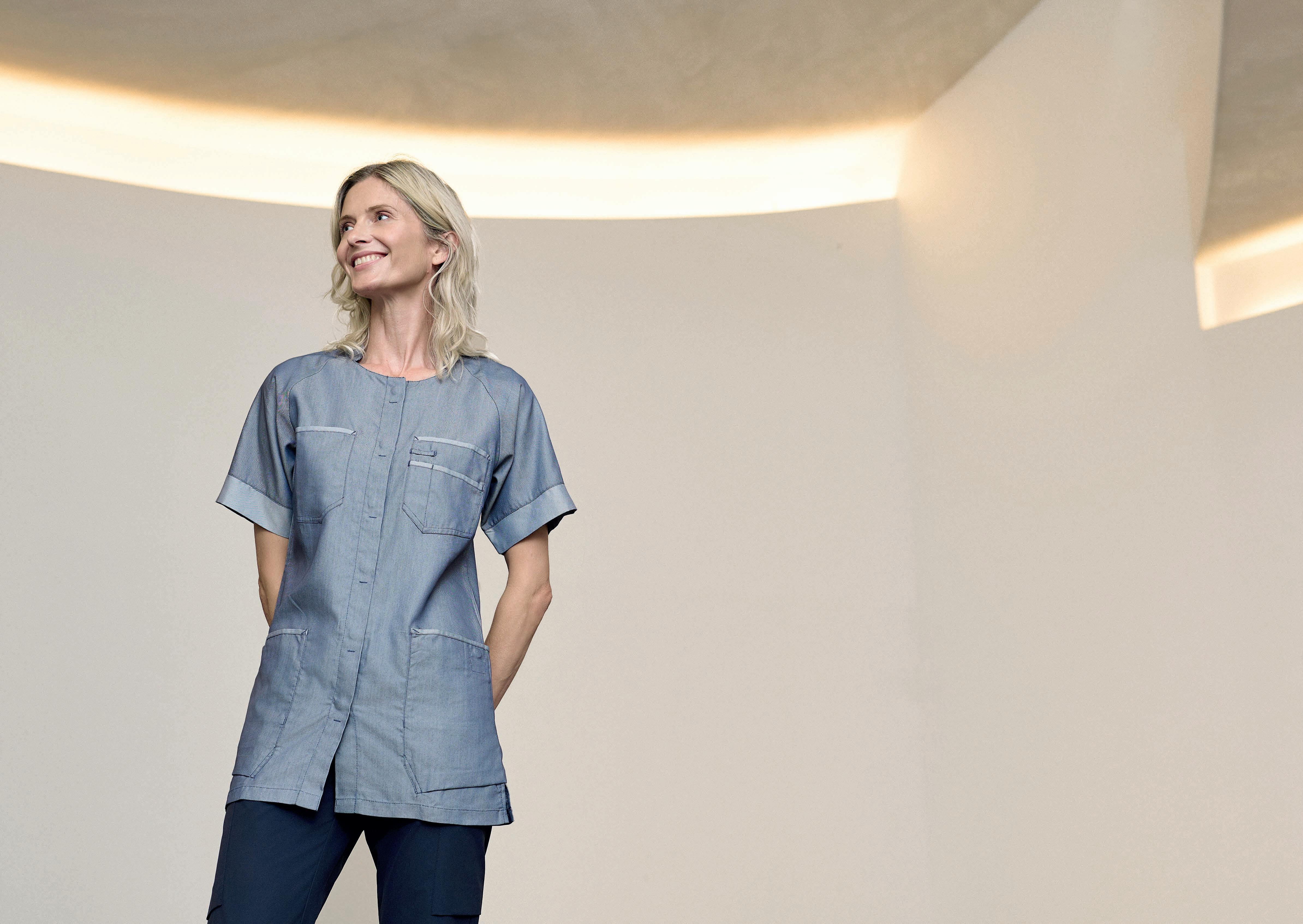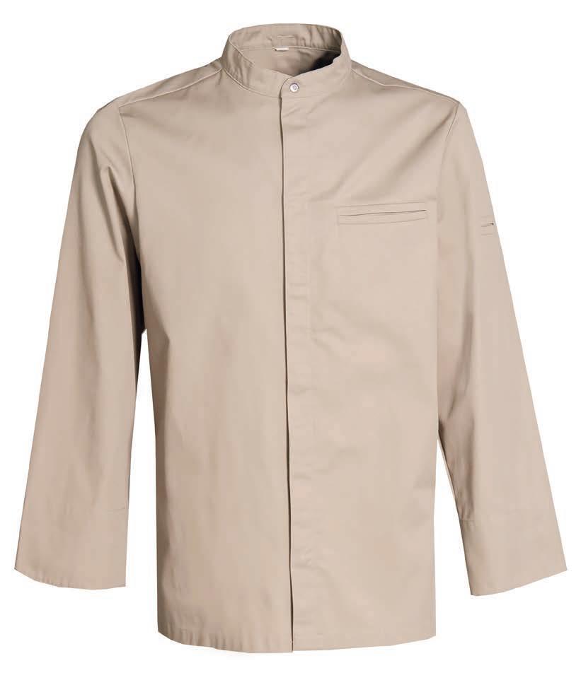Coloured smock with lapel. As per regulations, it has an internal left breast pocket. The sleeve openings can be adjusted with snap fasteners. It has concealed snap fasteners on a placket. The cut is straight up and down with good length at the back.