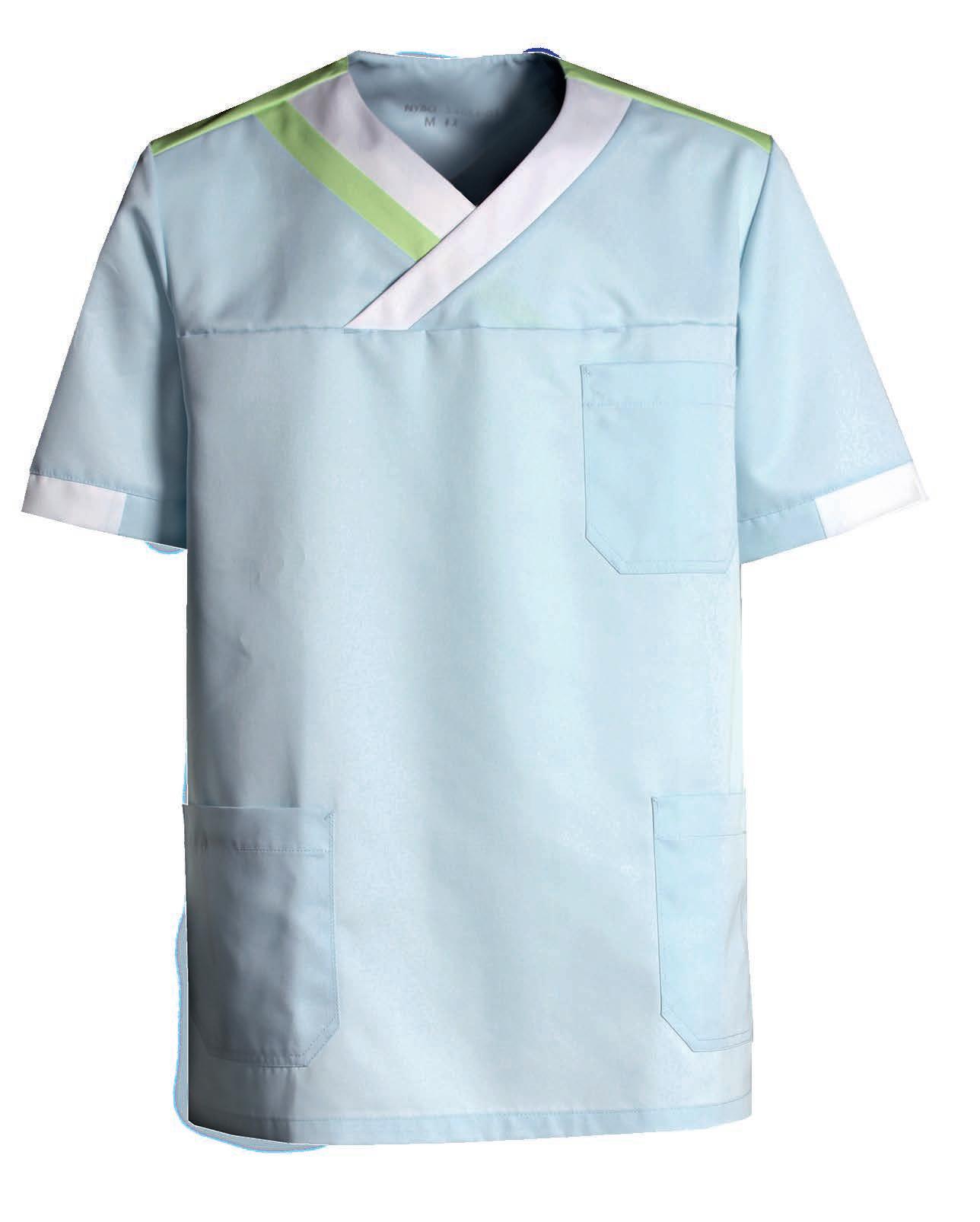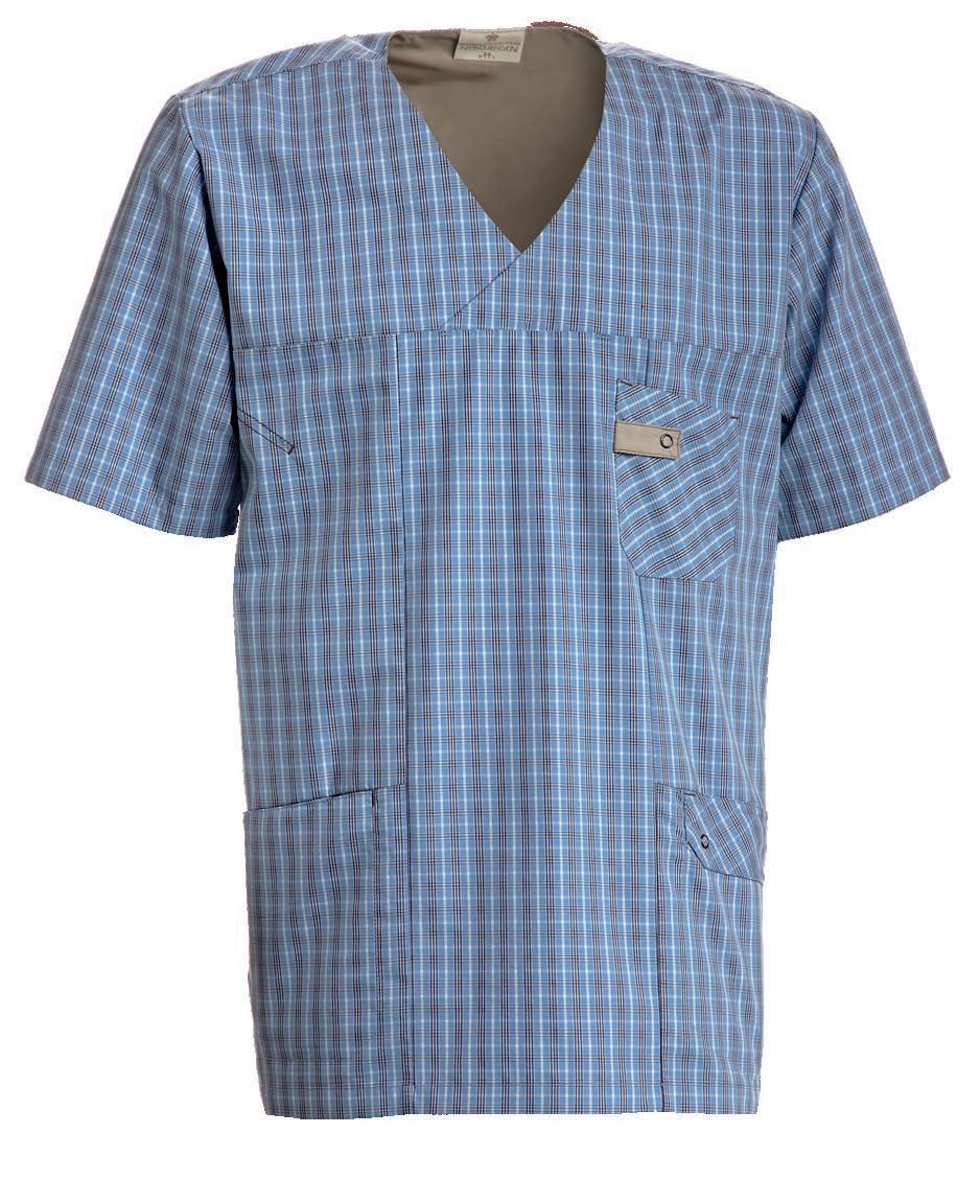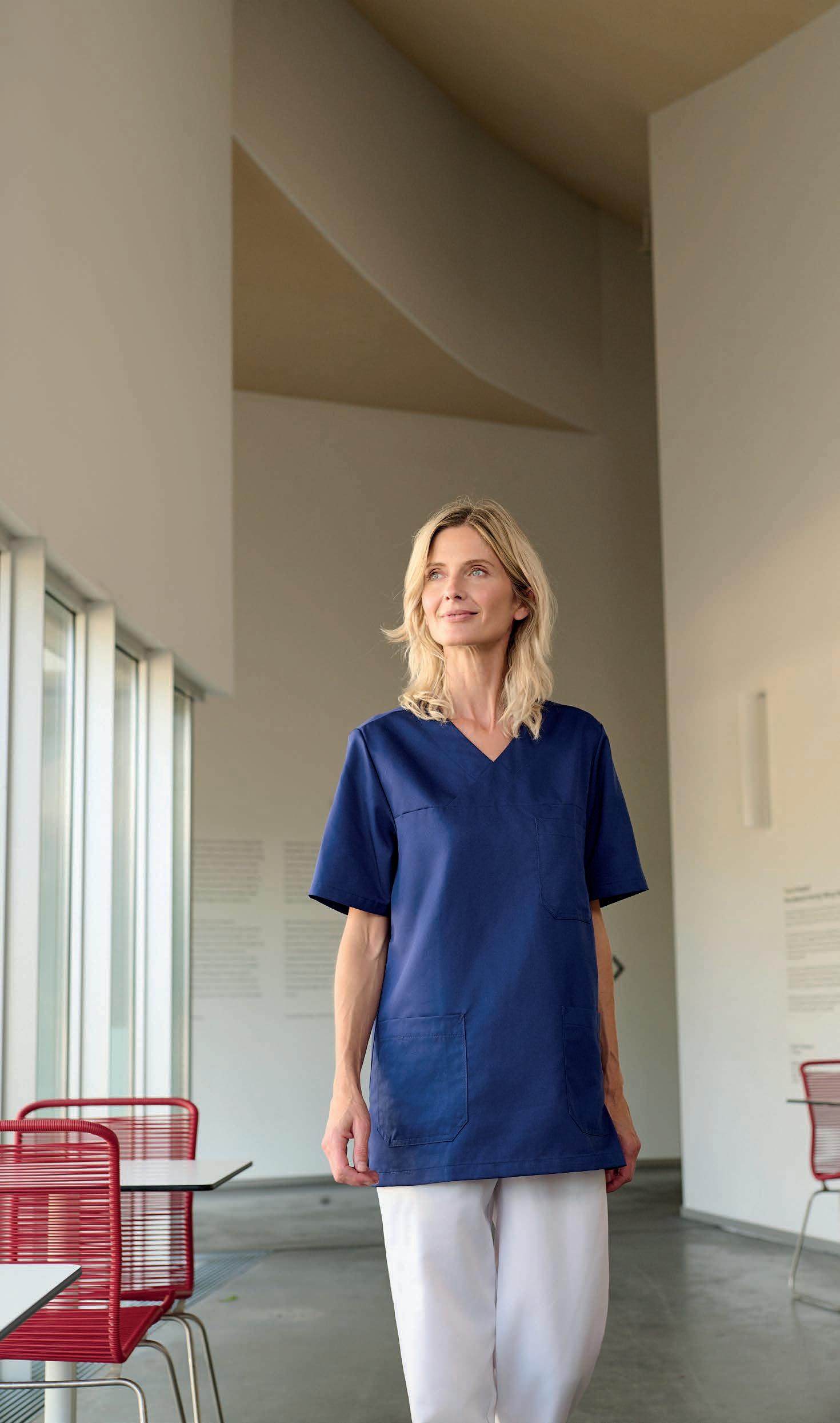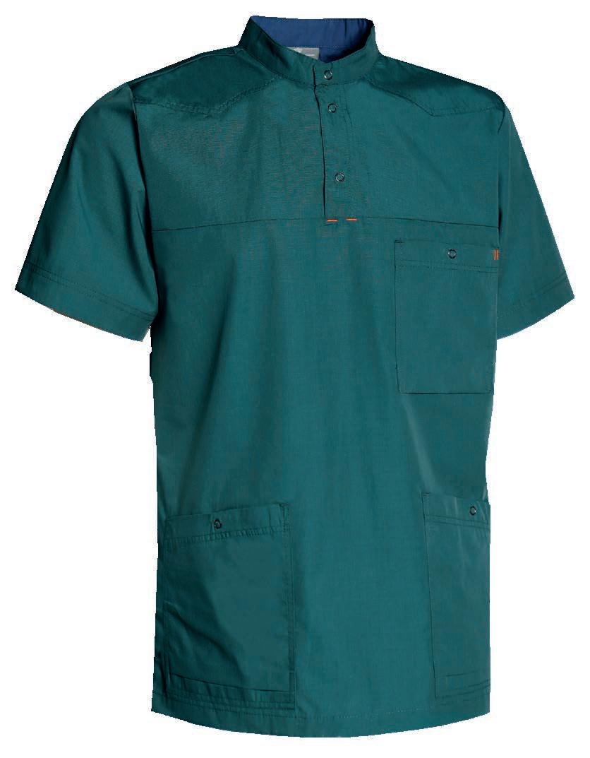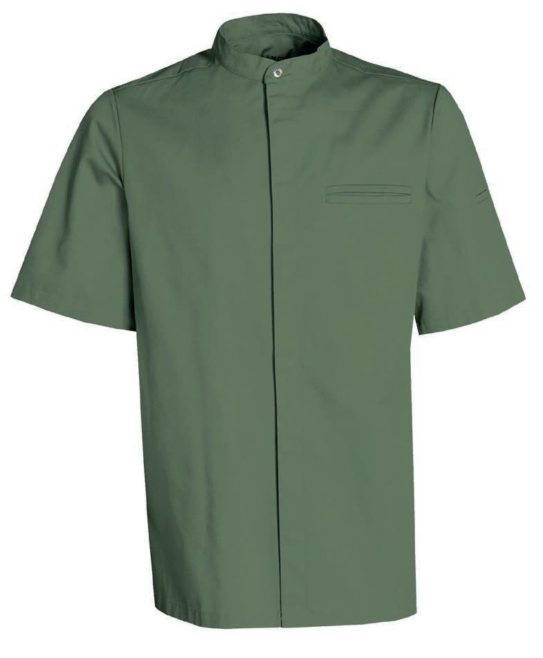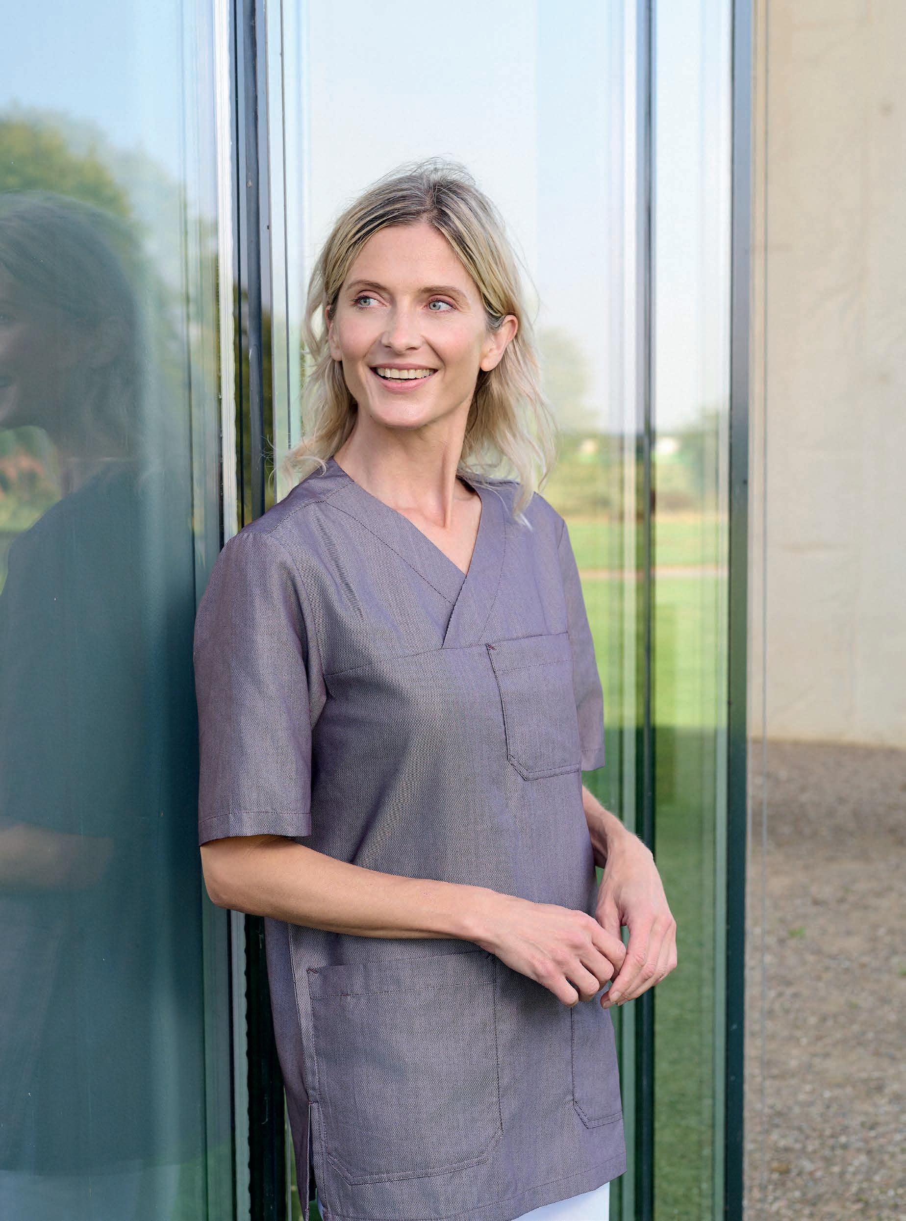Coloured smock with lapel. As per regulations, it has an internal left breast pocket. The sleeve openings can be adjusted with snap fasteners. It has concealed snap fasteners on a placket. The cut is straight up and down with good length at the back.