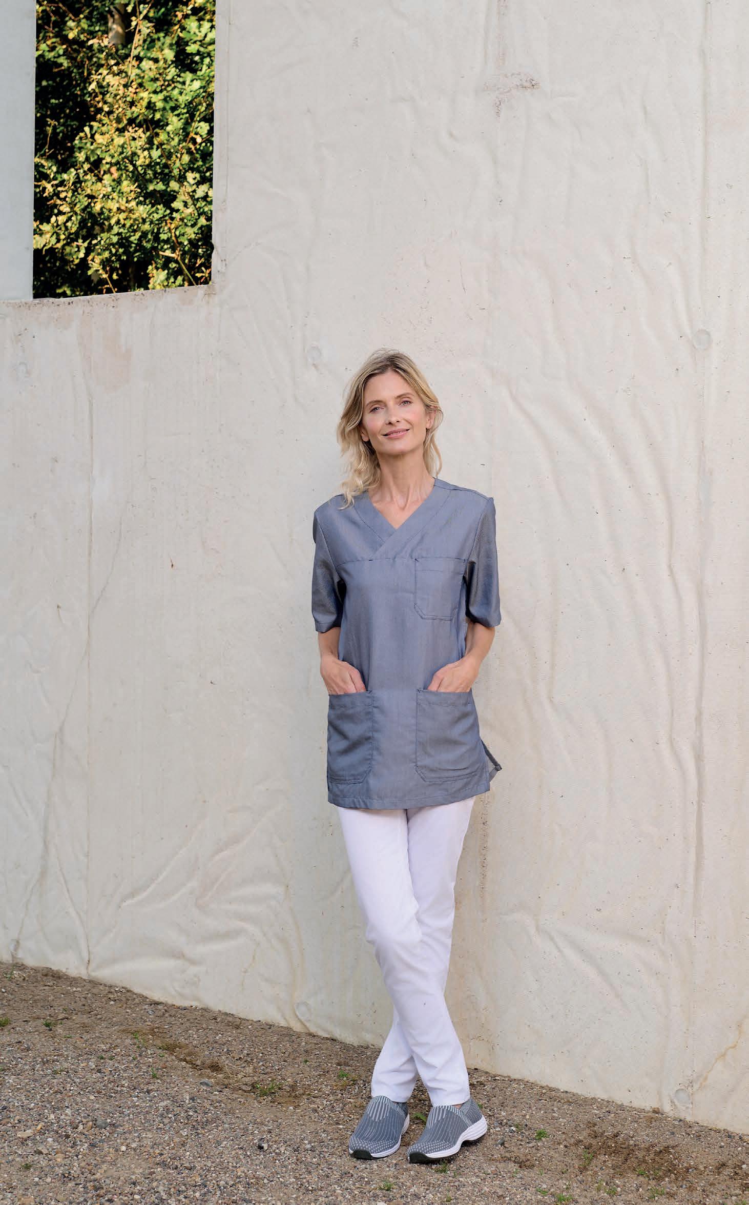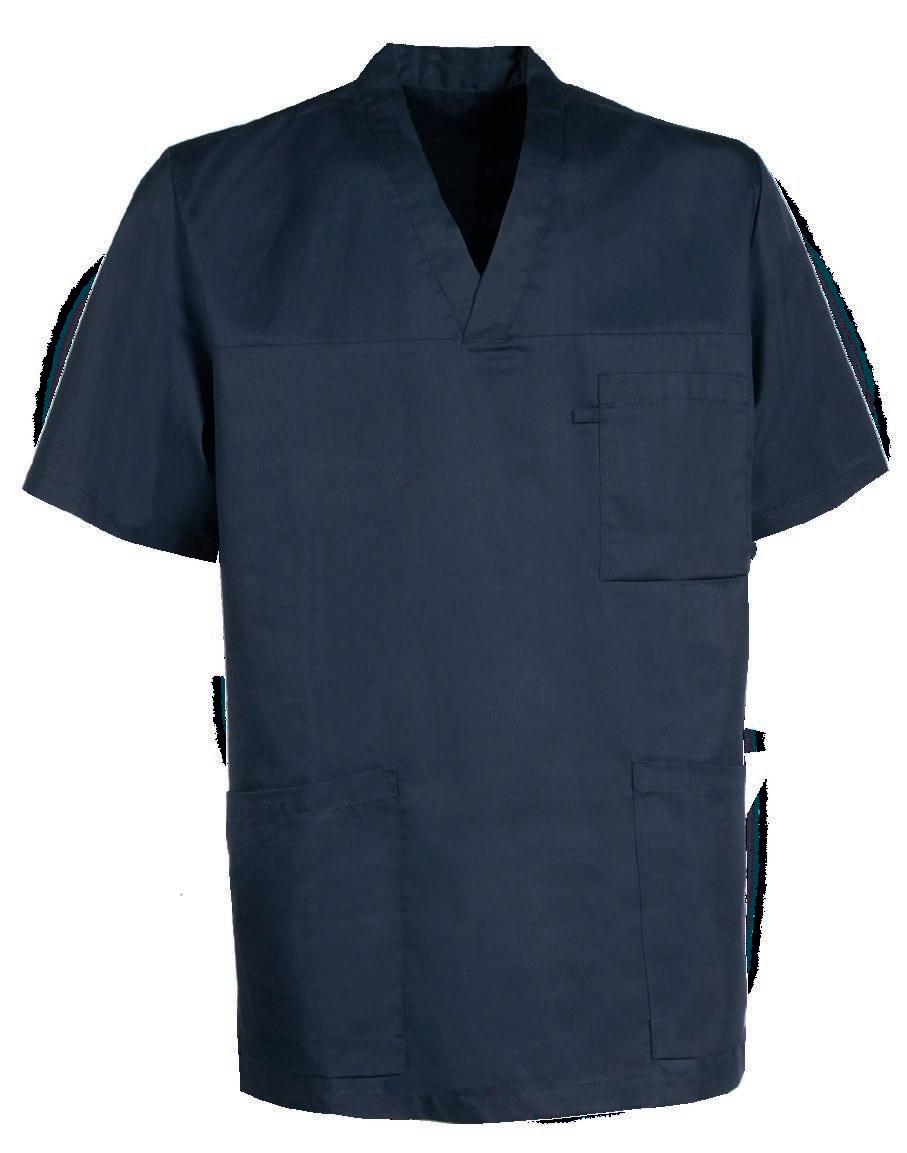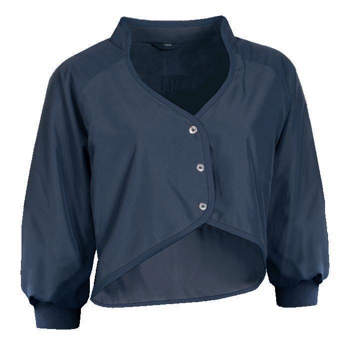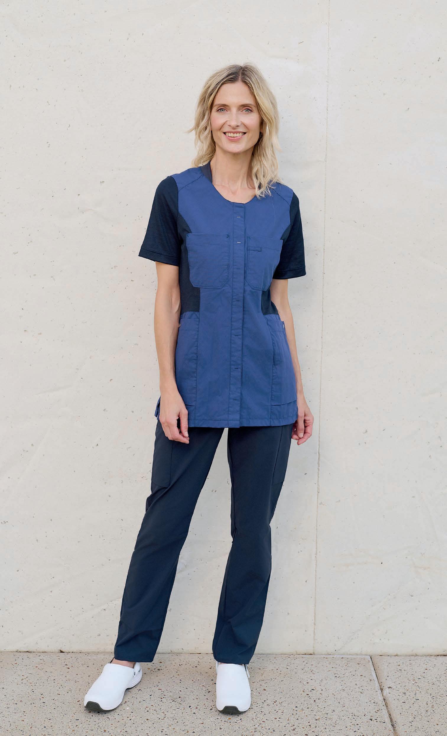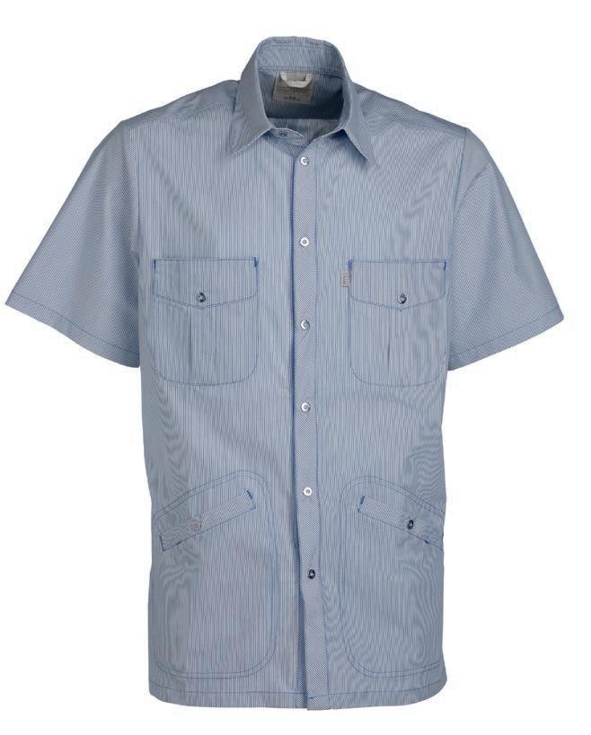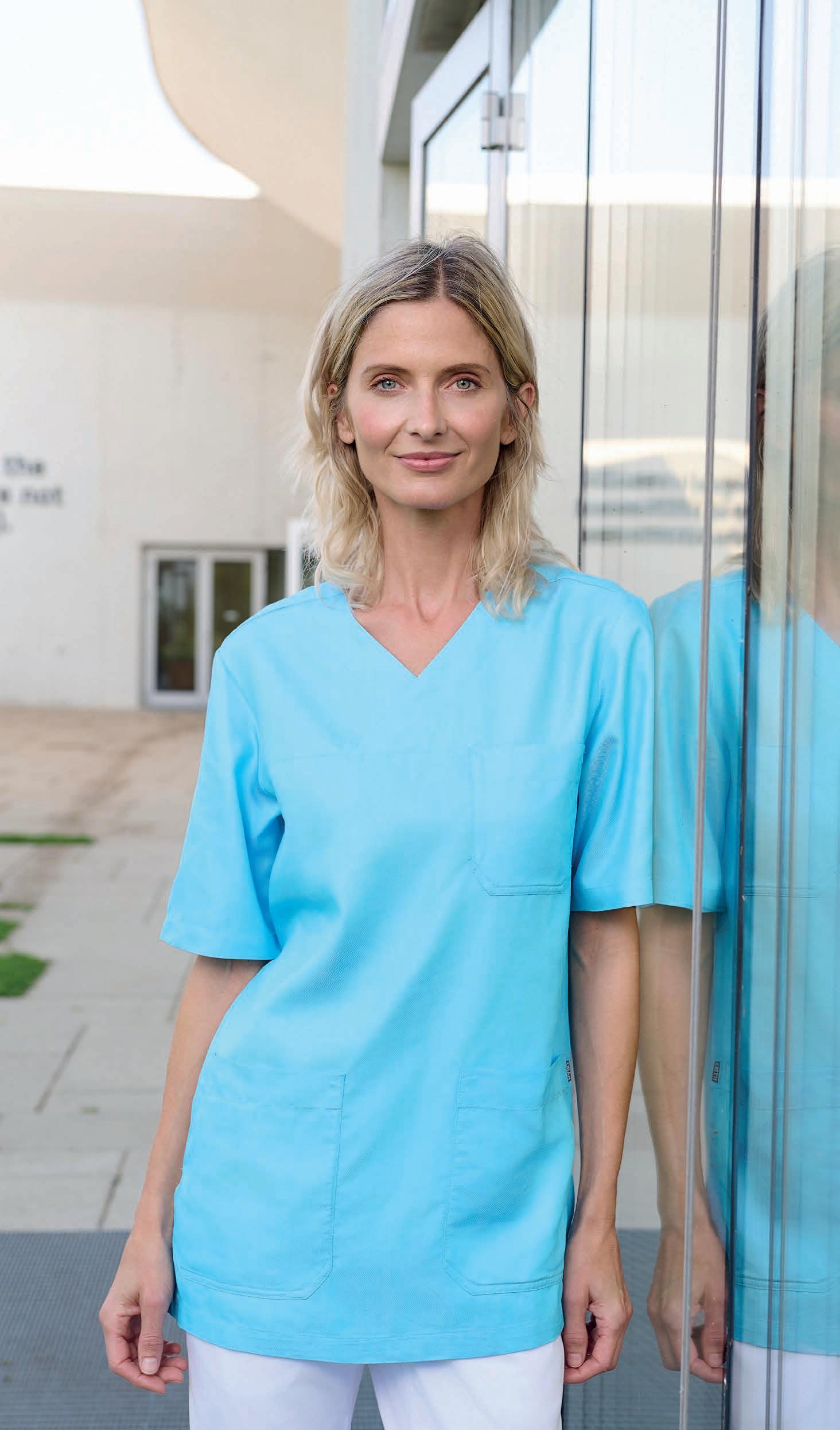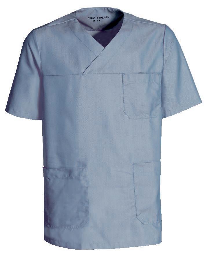 Coloured smock with lapel. As per regulations, it has an internal left breast pocket. The sleeve openings can be adjusted with snap fasteners. It has concealed snap fasteners on a placket. The cut is straight up and down with good length at the back.