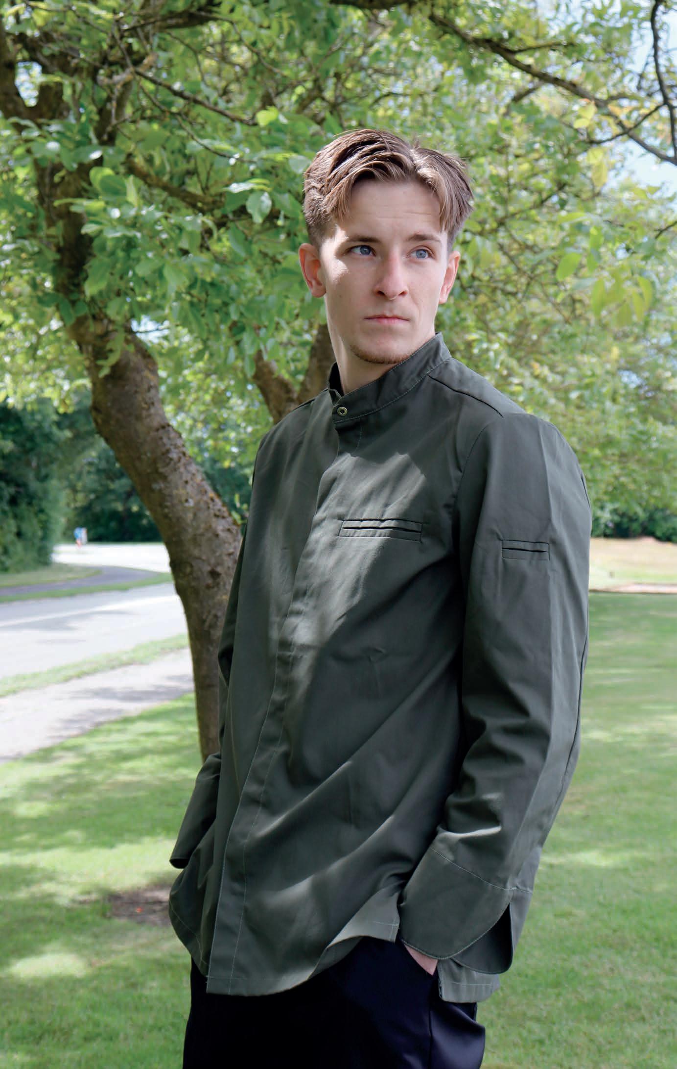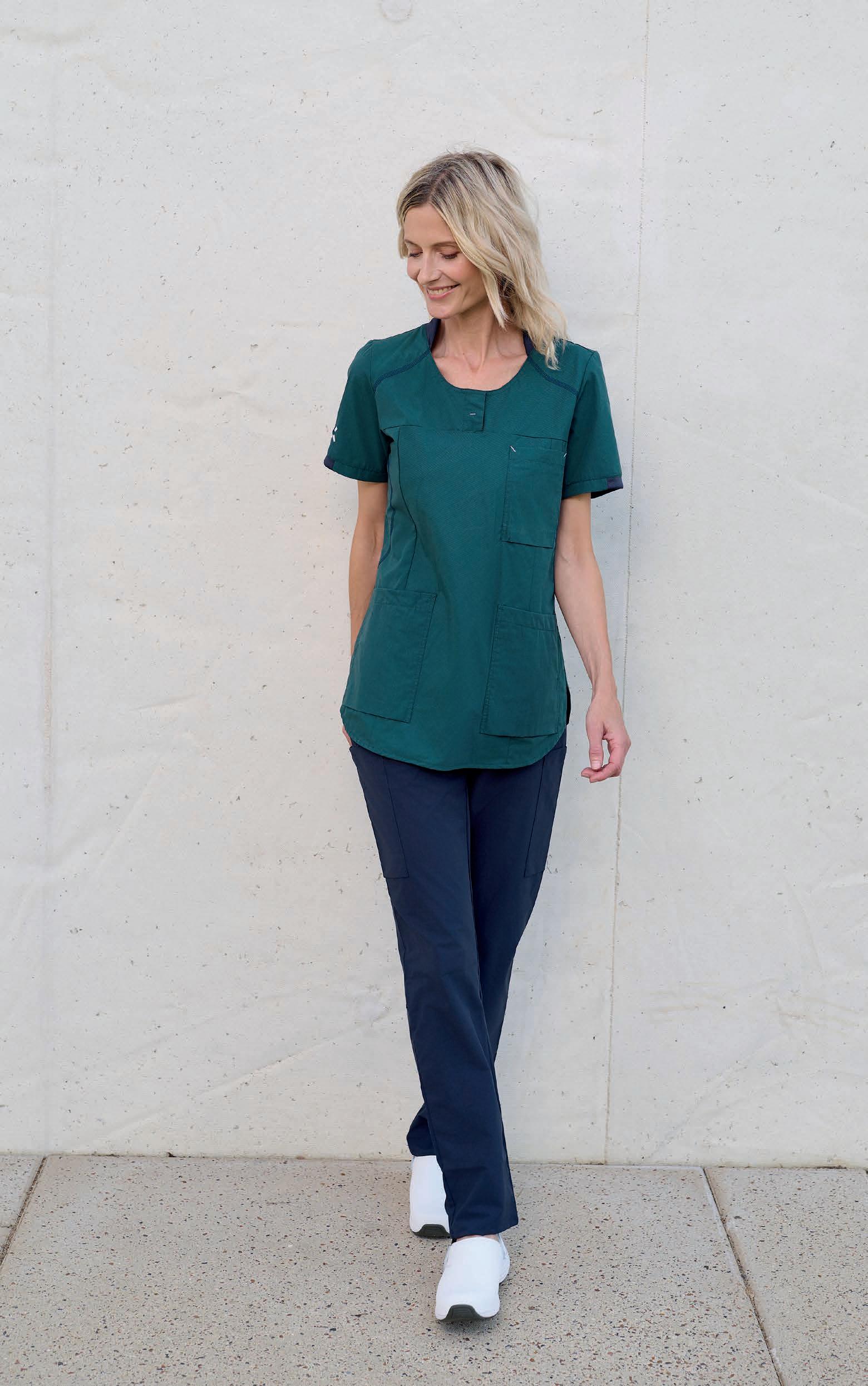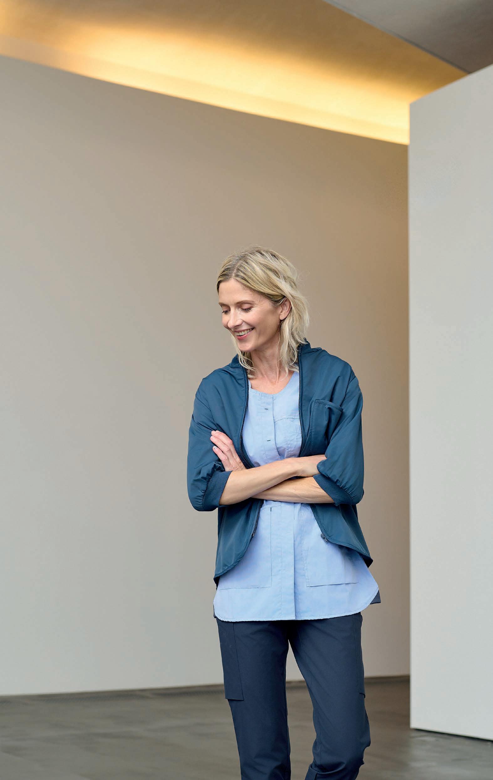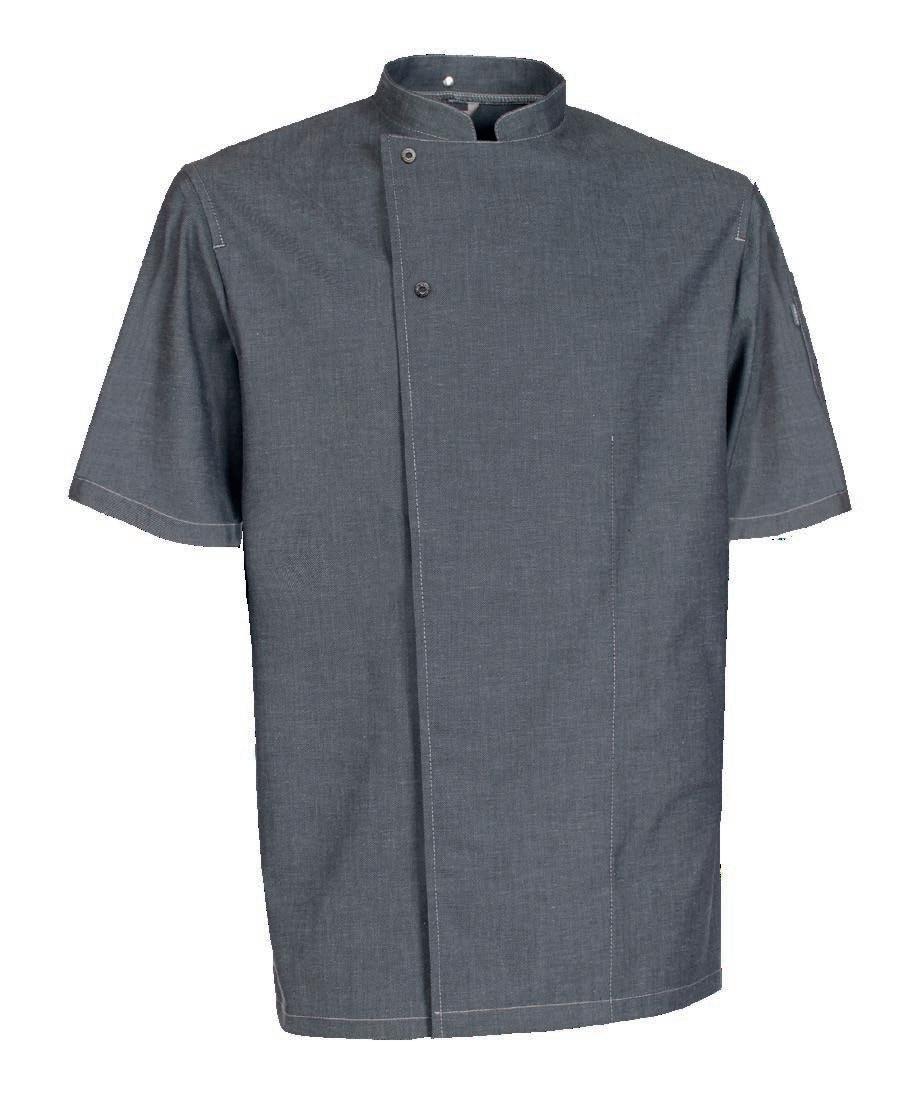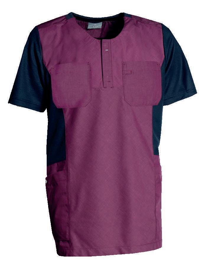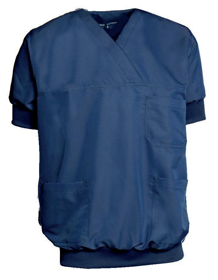 Coloured smock with lapel. As per regulations, it has an internal left breast pocket. The sleeve openings can be adjusted with snap fasteners. It has concealed snap fasteners on a placket. The cut is straight up and down with good length at the back.