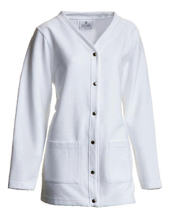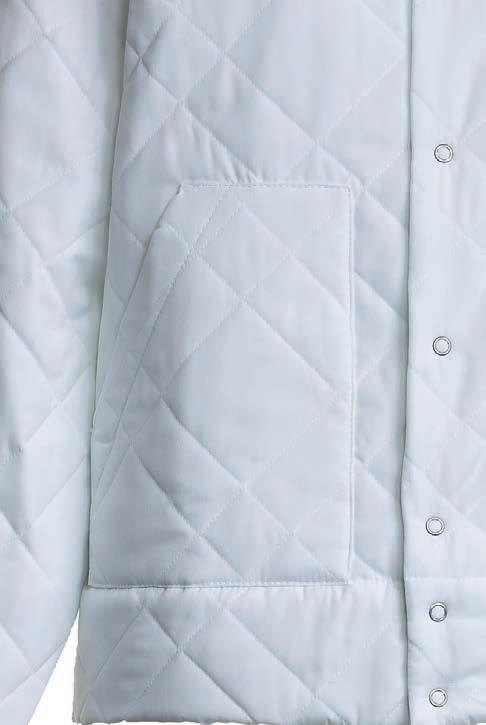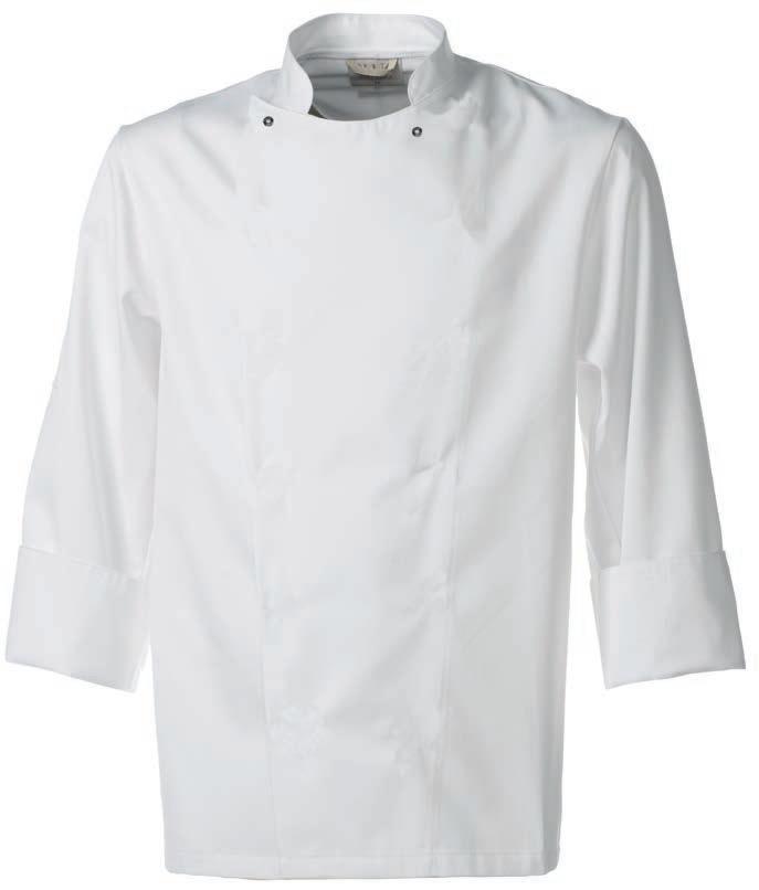 White unisex jacket with lapel. It has an internal left breast pocket and internal hip pockets with access on right side. The sleeve openings can be adjusted with snap fasteners. The cut is straight up and down, and it fastens at the front with concealed snap fasteners.