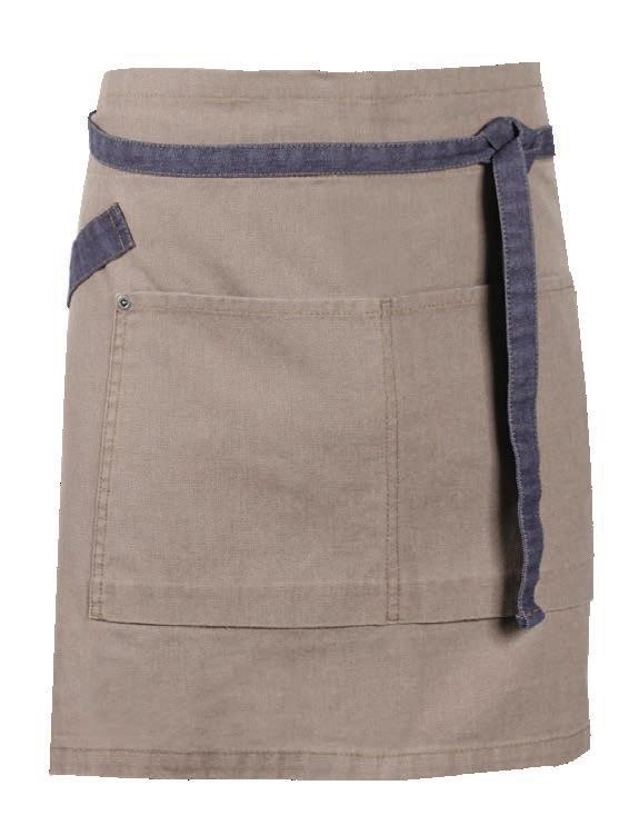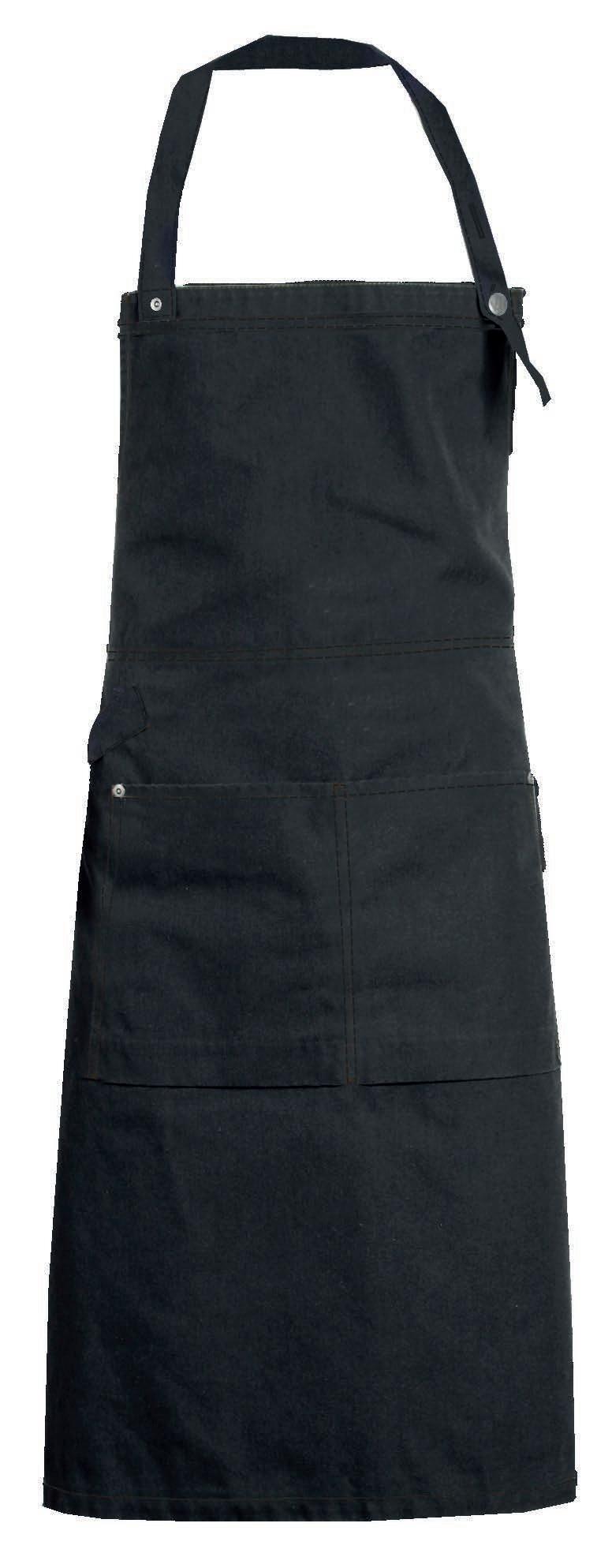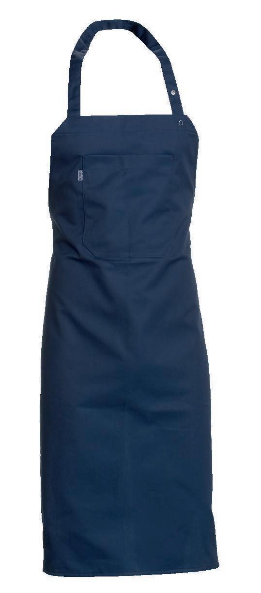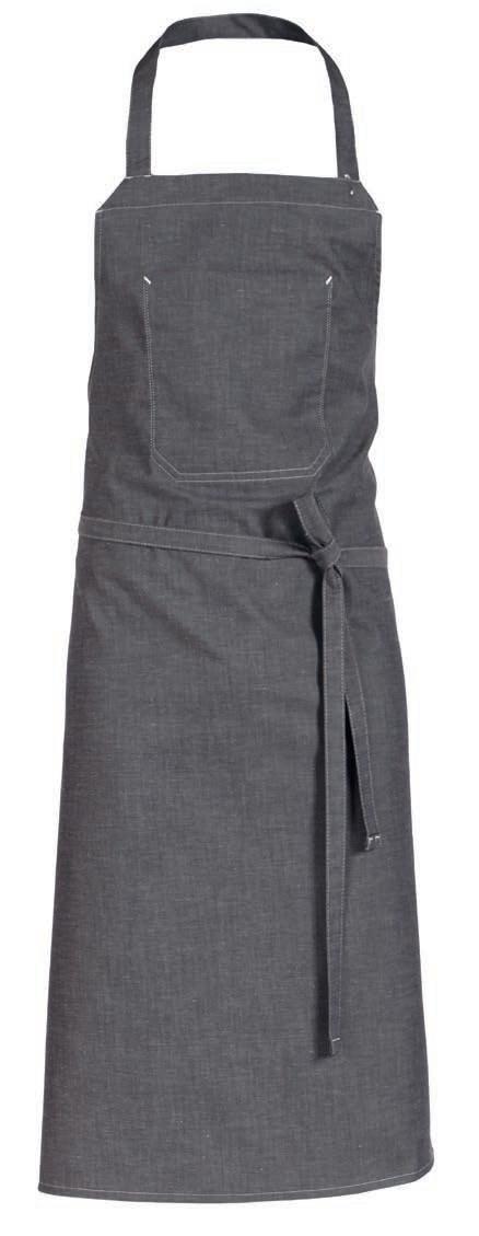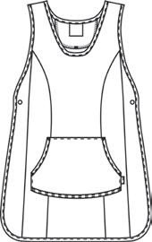 Kuskeforklæde med brystlomme og bindebånd, der enten kan bindes bagpå eller føres rundt om livet for at give facon. Længden på nakkestropperne kan justeres med trykknapper.