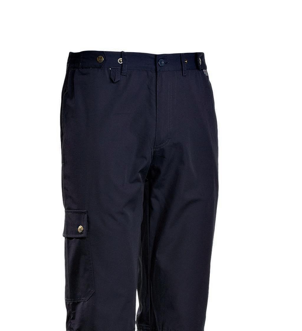 Men’s trousers with angled pockets with snap fasteners. Right-side back pocket also with snap fasteners. These trousers fasten at the front with two buttons and buttonholes and a zip fly.