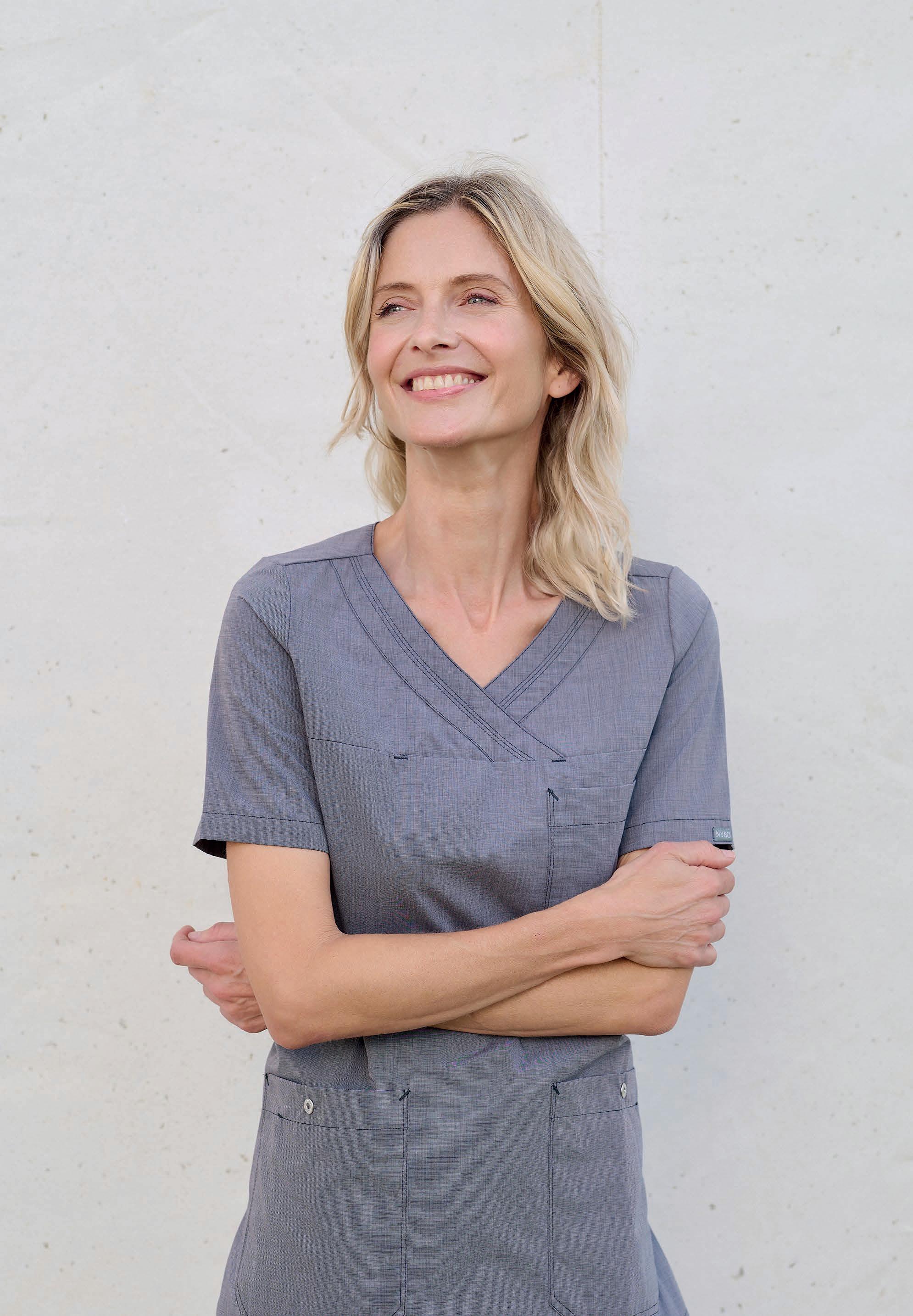 Justerbart sandwichforklæde med specialudviklet pasform, som giver et feminint udtryk og stor komfort. Modellen er desuden udstyret med en stor brugbar lomme. XS - 4XL