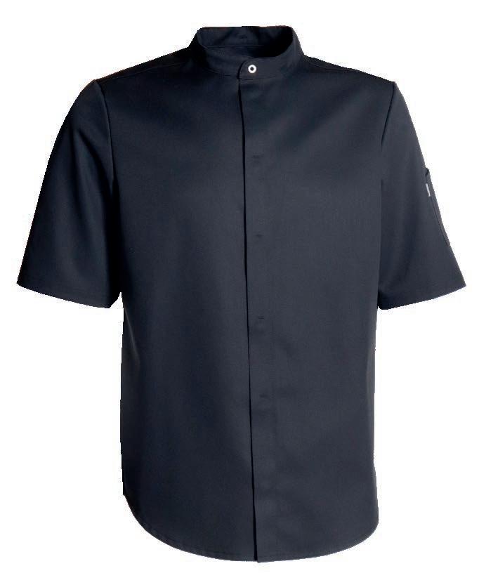 UNISEX-KOCHJACKE, FLOW Jacke mit kurzen Ärmeln und verdecktem Druckknopfverschluss. Zwei sichtbare Kontrastdruckknöpfe am Hals. Tasche auf dem linken Oberarm. Body Fit-Passform und Kontraststeppnähte. Äussere Nackenschlaufe für Schürzenband. Das Gewebe im Denim Look ist sehr angenehm und weich und sichert optimale Trageeigenschaften. XS - 4XL