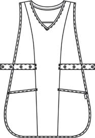 Bib apron with large breast pocket. It has straps that can either be tied at the back in a bow or wrapped round the waist to give a little shape. It offers good length and width.