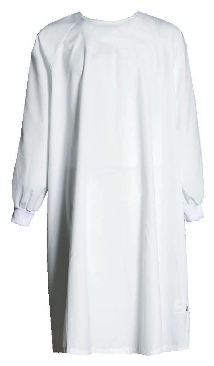 Coloured smock with lapel. As per regulations, it has an internal left breast pocket. The sleeve openings can be adjusted with snap fasteners. It has concealed snap fasteners on a placket. The cut is straight up and down with good length at the back.