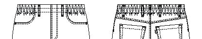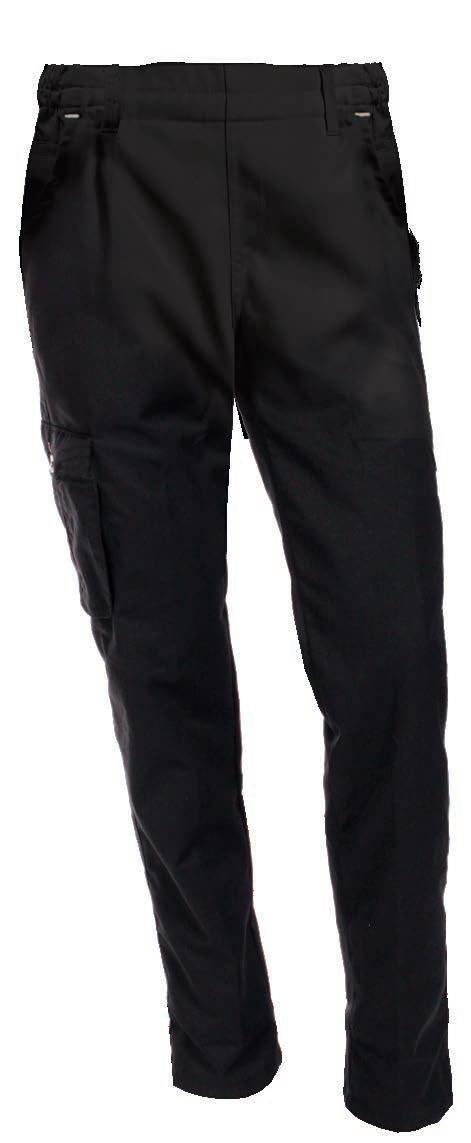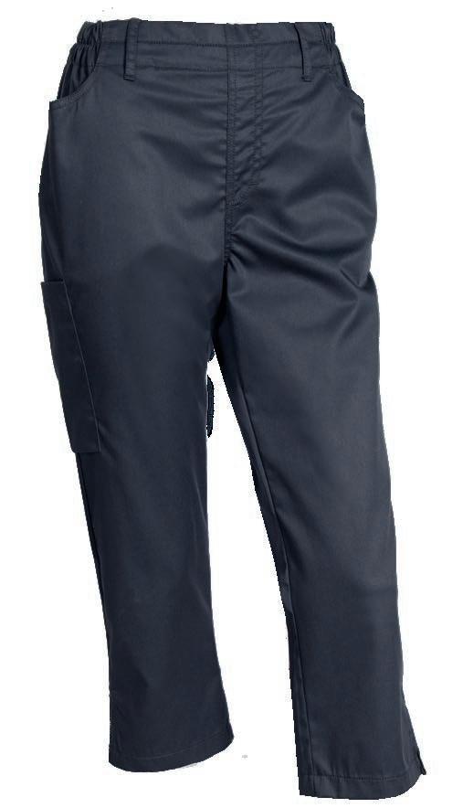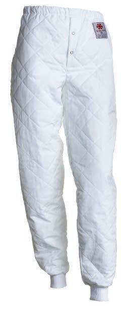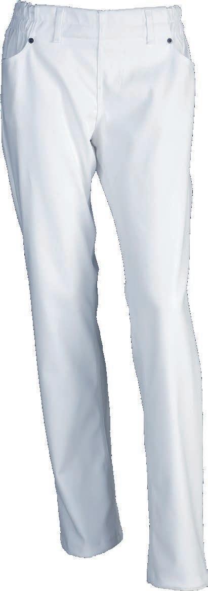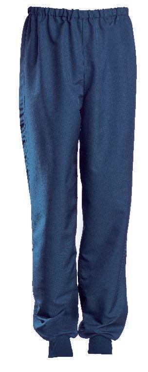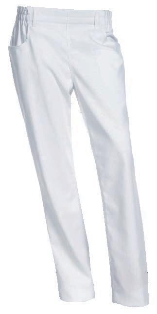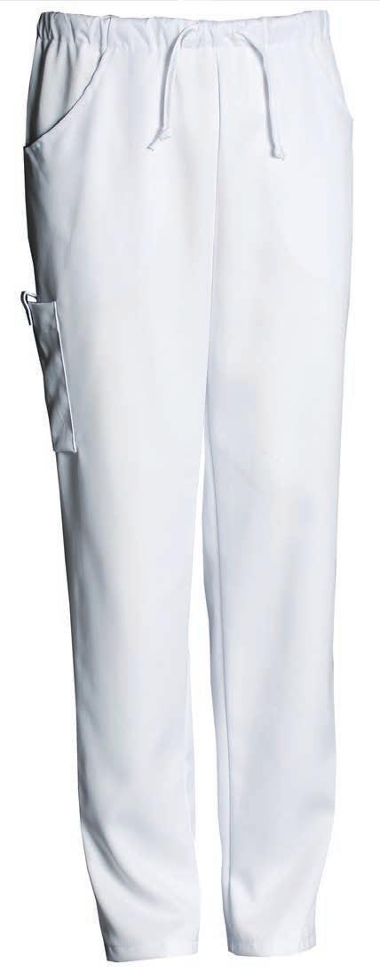 Buks med elastik og bindesnor indvendig i linningen. Benlukningen er regulerbar med trykknapper. Modellen er specielt udviklet til fødevareindustrien og opfylder kravene i DIN 10524-standarden. Dette minimerer risikoen for tab af løse genstande og sikrer, at tøjet kan vaskes ved høje temperaturer.