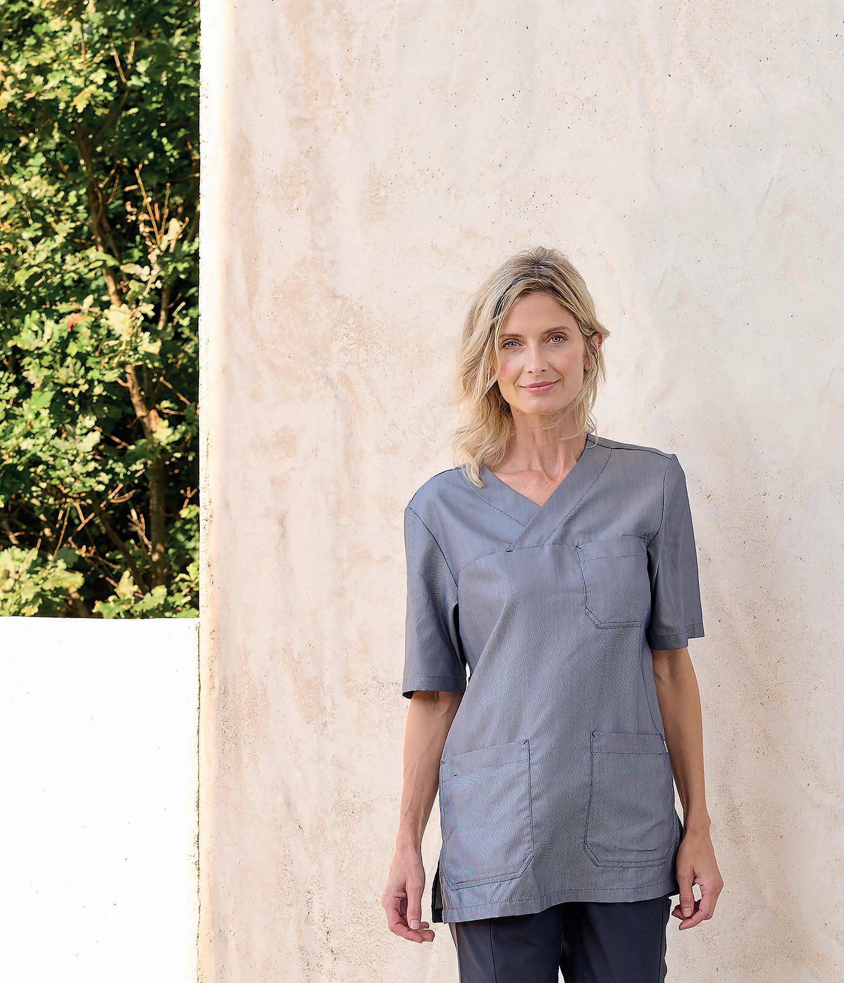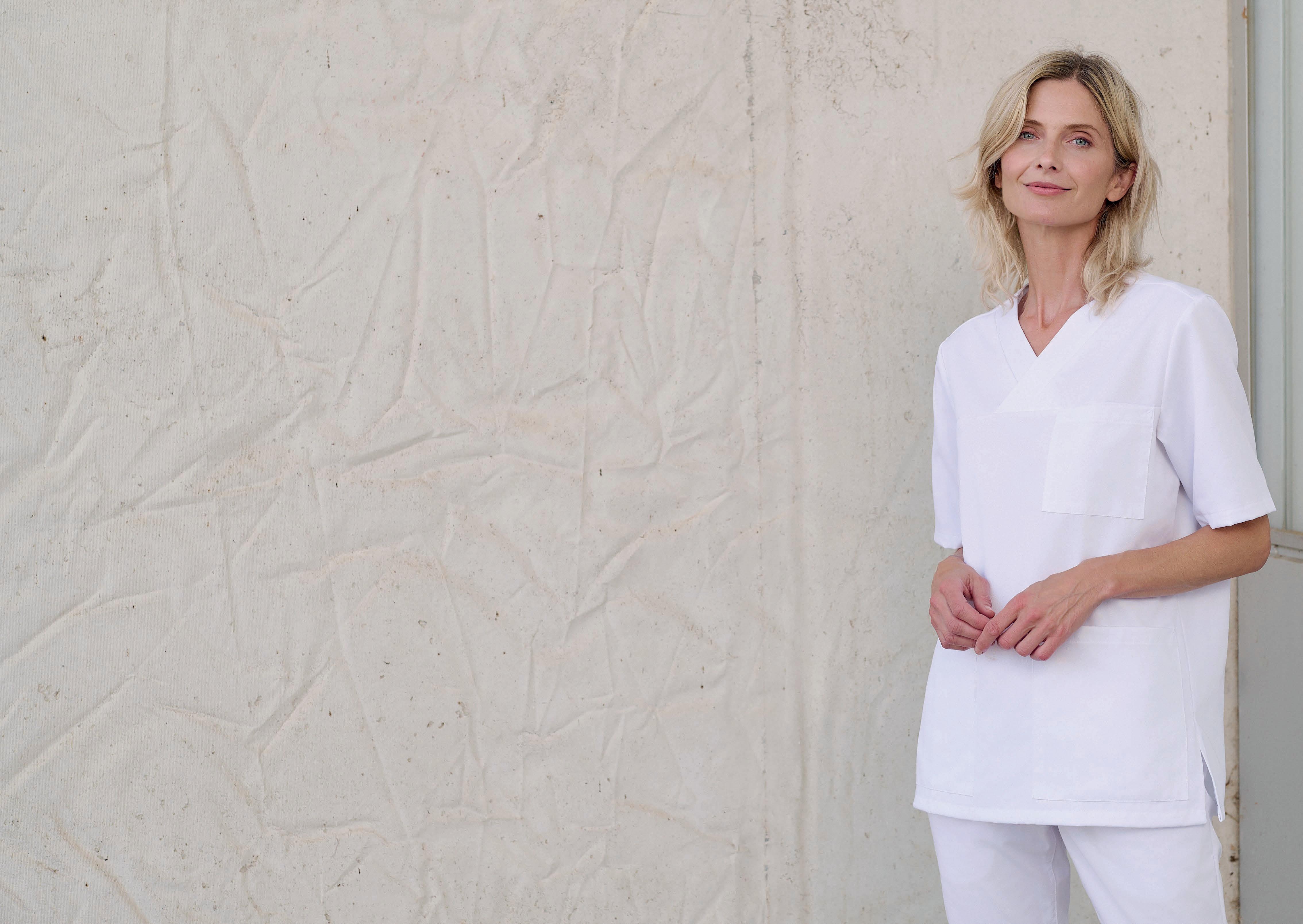 Hvid unisex-kittel med revers. Modellen har efter forskrifterne indvendige lommer med indgreb i kittelens sider. Ærmeåbningen kan reguleres med trykknapper. Modellen lukkes foran med skjulte trykknapper.