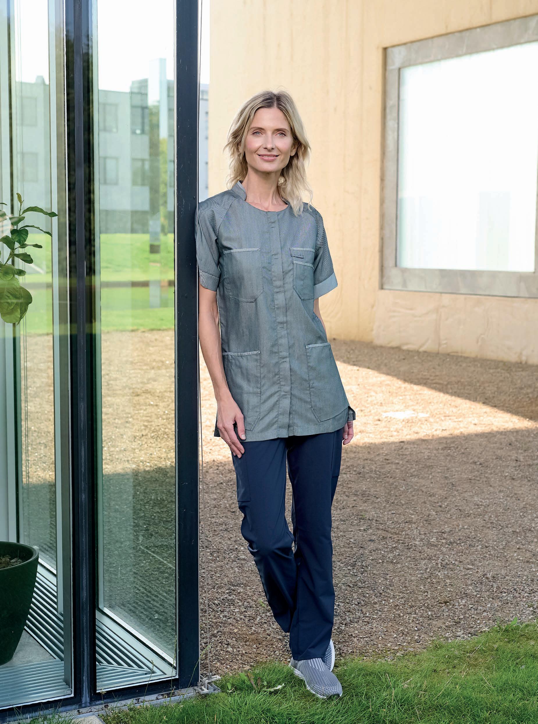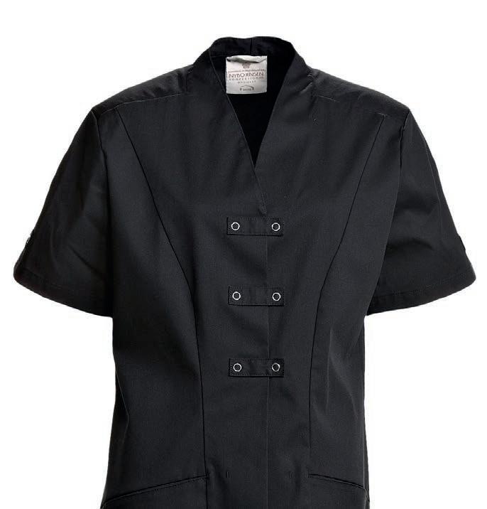 Busseronne med revers. Modellen har efter forskrifterne indvendig brystlomme i venstre side. Ærmeåbningen kan reguleres med trykknapper, og modellen har skjult trykknapslukning i stolpen. Faconen er skåret lige op og ned med en længde, der dækker godt bagtil. Busseronnen er specielt udviklet til fødevareindustrien og opfylder kravene i DIN 10524-standarden.