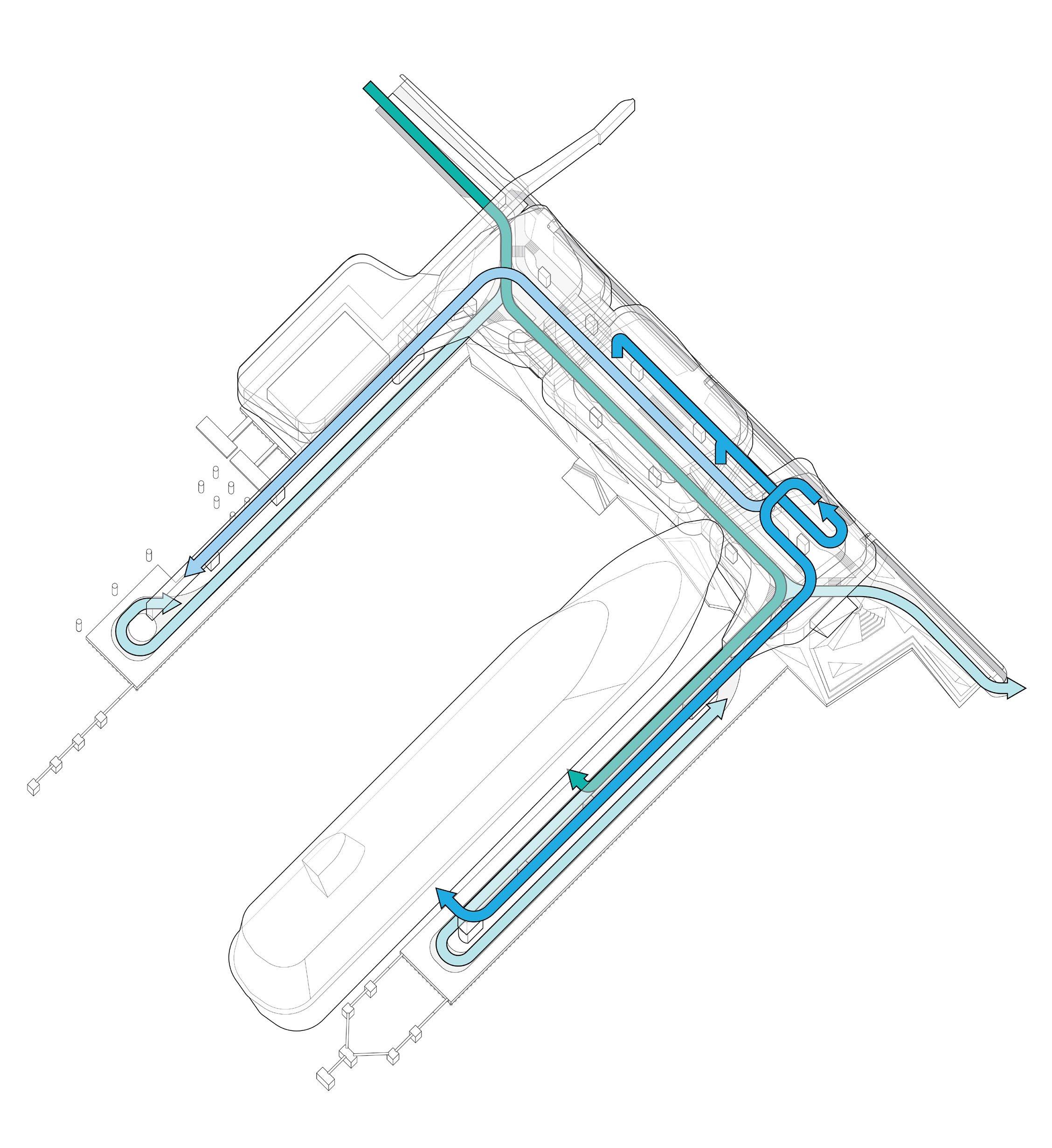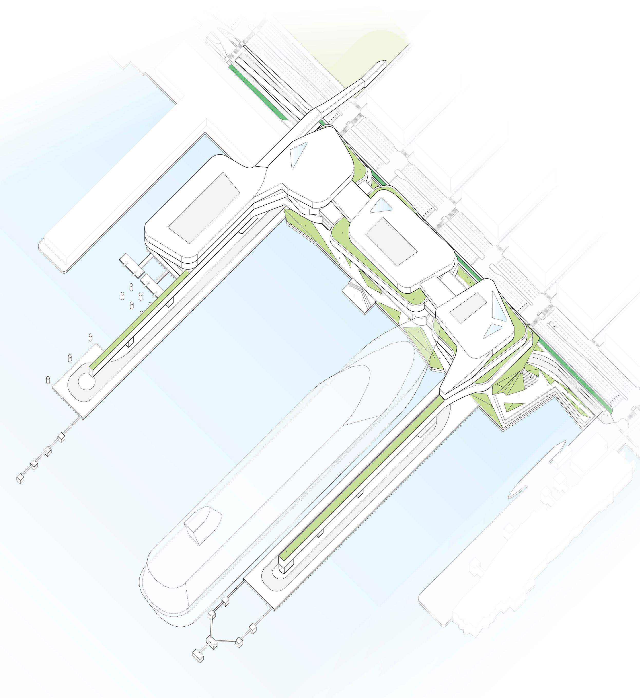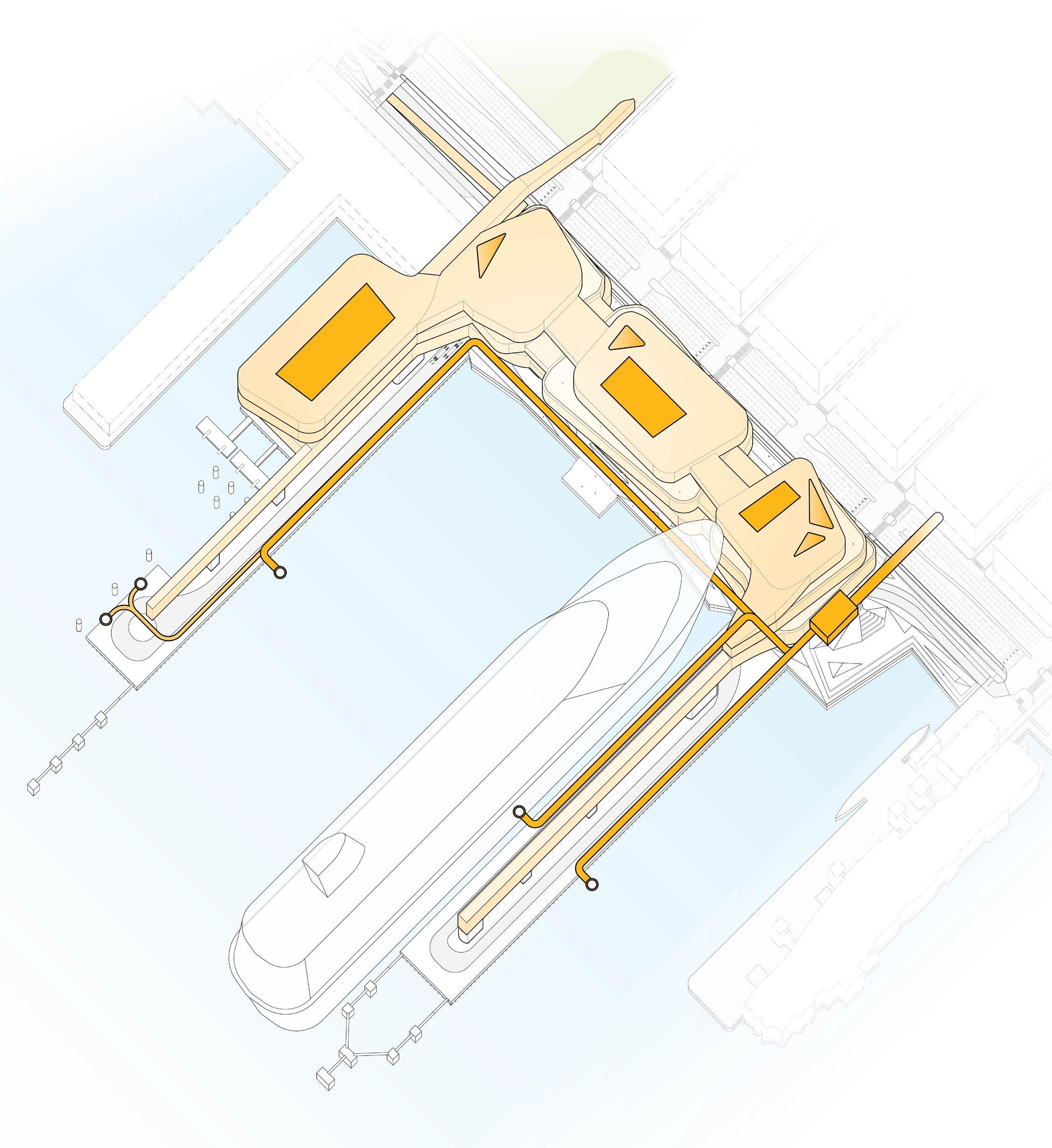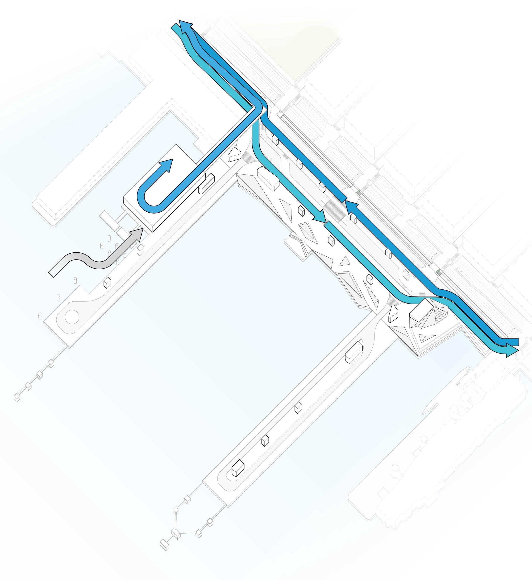 To activate the site’s new public spaces, a stepped plaza, located above the relocated terminal substation, will be constructed at the southern end of the site. This plaza connects both ground level and elevated public spaces, functioning as a nexus for gathering.