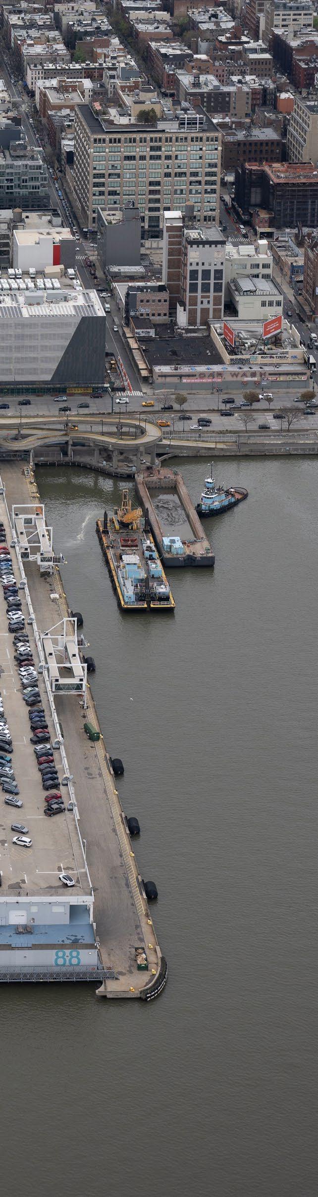 While detailed facility design will occur in a future stage of the project, the terminal’s unique location on Manhattan’s West Side necessitates thoughtful, context-sensitive design. The facility is strategically located between significant civic anchors, including the Intrepid Sea, Air & Space Museum and Hudson River Park. The design must strengthen the terminal’s relationship with its neighbors through wellplanned approaches: integrating with the north-south Route 9A Bikeway/Walkway to ensure safe movement along the waterfront, and maintaining east-west view corridors along W 49th and W 51st Streets to reinforce visual and physical connections between the city and the waterfront.
