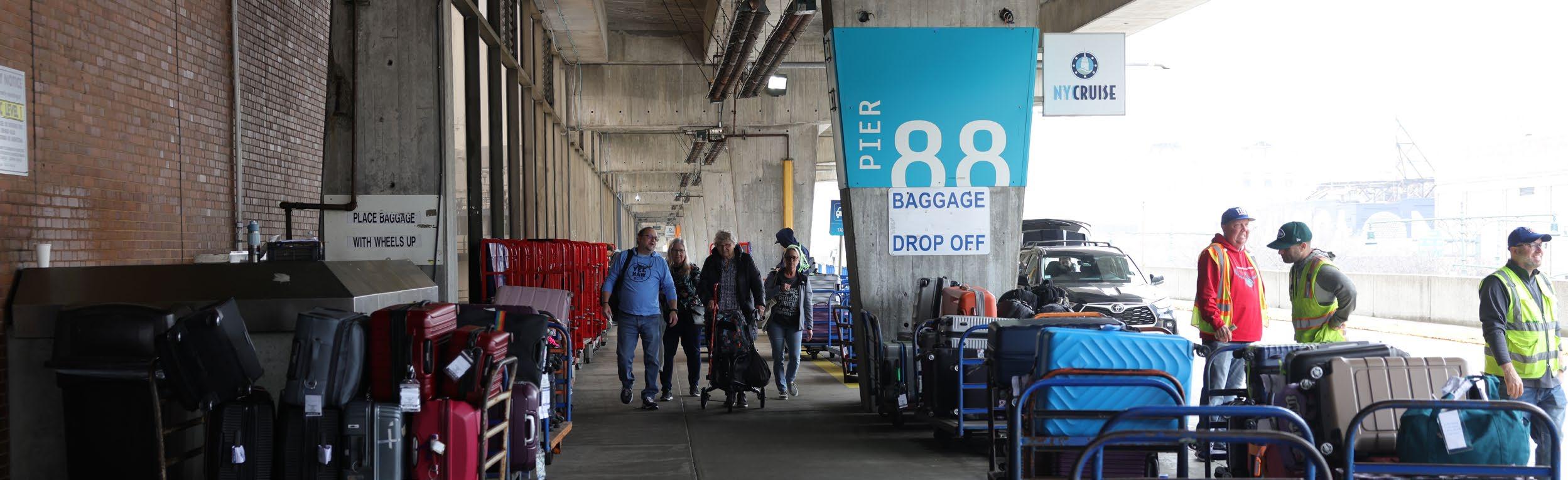 full-foreign arrival vessels. Berth 2 is particularly busy, as its more flexible gangway system can accommodate vessels with outboard lifeboats. The ground level of Pier 88 is dedicated to disembarkation processes, including baggage pick-up and customs, as well as other back-of-house functions, such as baggage screening. Trucks navigate the northern and southern aprons to deliver provisions, which are then loaded onto vessels. The second level is reserved for embarkation processes, including baggage drop-off, security screening, and ticketing. During the 1970s, the rooftops of Piers 88 and 90 were converted into parking lots for passengers and staff. Today, the roof of Pier 88 can accommodate up to 320 vehicles.