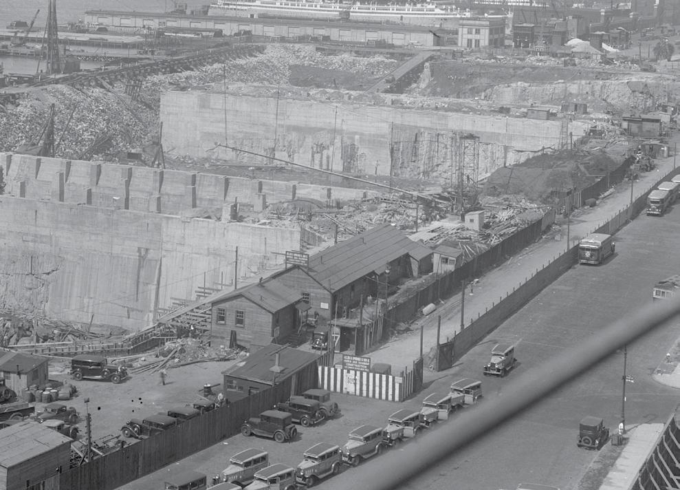 Construction of the original terminal began in 1932, with Piers 88, 90, and 92 opening between 1935 and 1936. Mayor Fiorello La Guardia spearheaded the project as part of a larger citywide infrastructure development plan. The facility, known then as the Passenger Ship Terminal, was constructed to serve the world’s largest ocean liners at the time, including the Normandie and Queen Elizabeth. To accommodate these vessels within the US Pierhead Line, the bulkhead was pushed eastward, with Manhattan bedrock being excavated to allow for adequate berthing space.