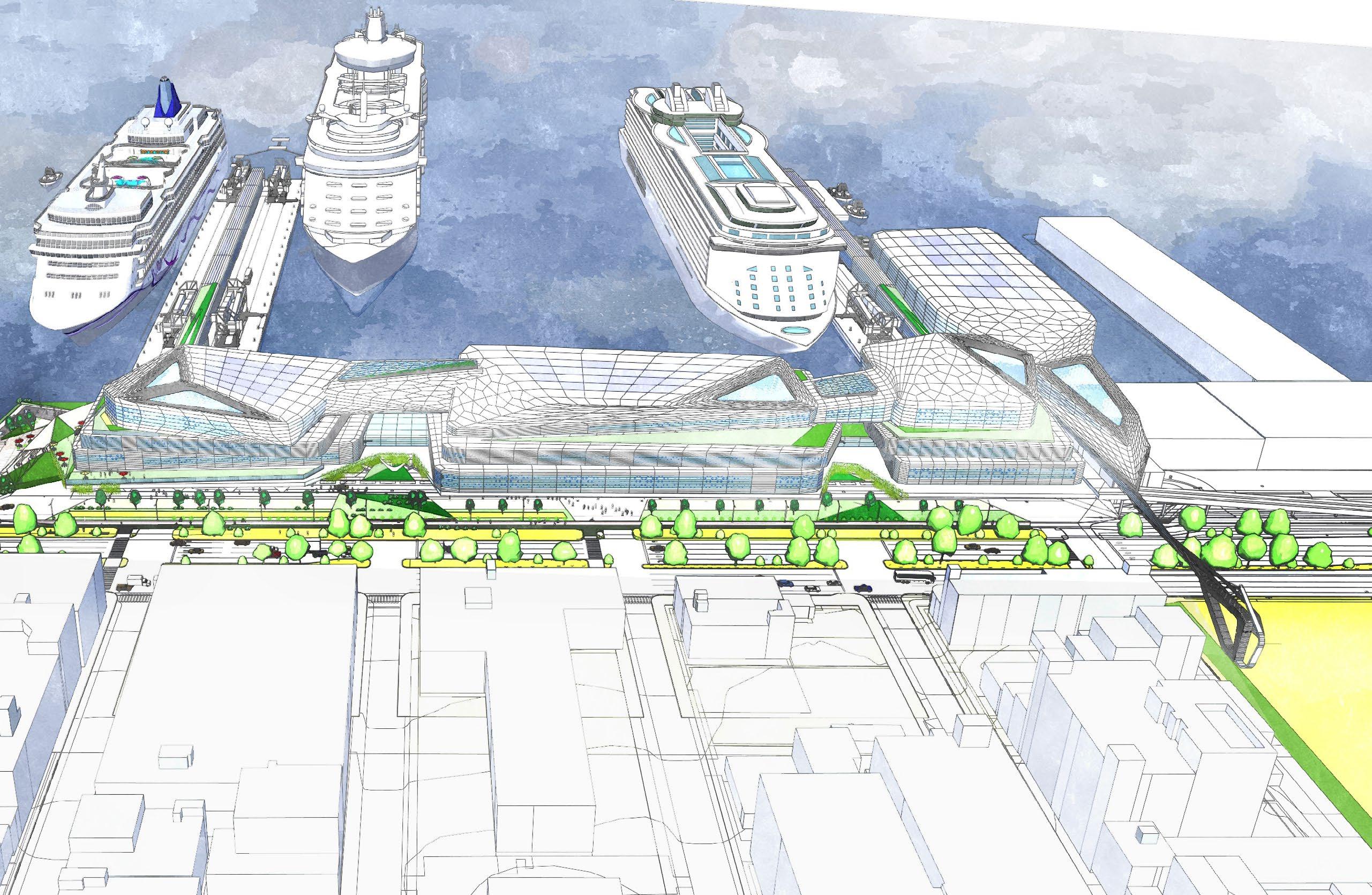 Phase 5, the final stage of the terminal’s redevelopment, will see the completion and activation of all new structures and facilities. These will include the central and southern terminal structures, a concourse on the South Pier, the permanent GTA, activation of the Blue Highways hub on the North Pier, and the site’s numerous green and public spaces. Once operable, the terminal will be capable of supporting three cruise vessels simultaneously, across its three berths.