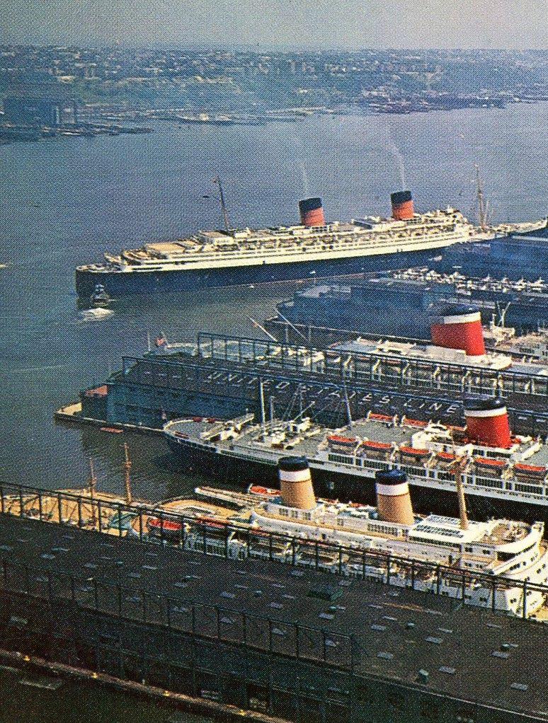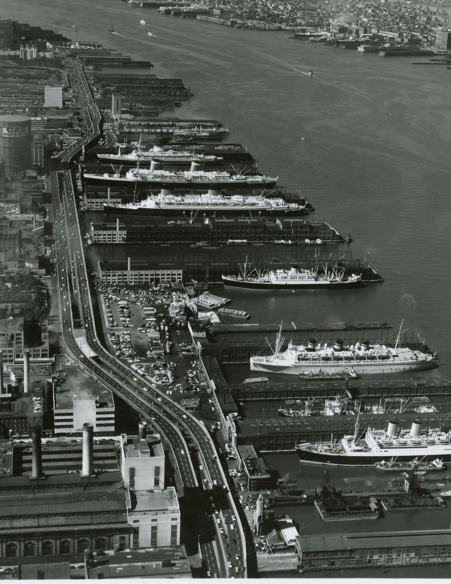 Background Image: In the 1950s, the terminal still operated all original piers and berths, handling transatlantic liners, leisure ships, and naval warships like the aircraft carrier at Pier 90. (Source: South Street Seaport Museum)