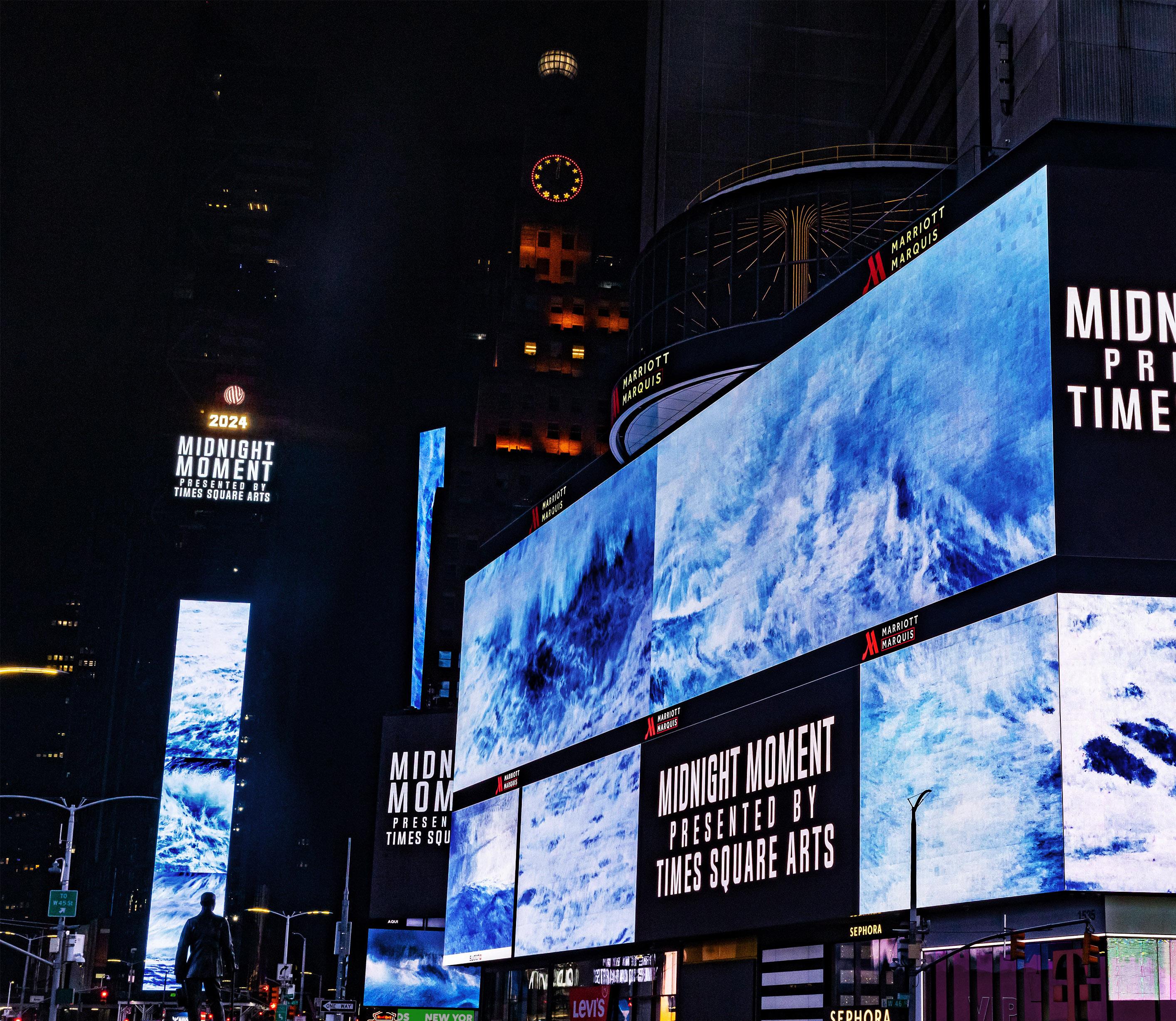 “Sometimes we talk about Midnight Moment as the most spectacular secret hiding in plain sight. You can sense that the thousands in Times Square at midnight are not expecting the nearly 100 screens to synchronize with tantalizing imagery of virtual worlds, dancers in snowdrifts, milky bubbles, meditative gradients, or stop motion animations,” says Times Square Alliance Director of Times Square Arts, Jean Cooney.