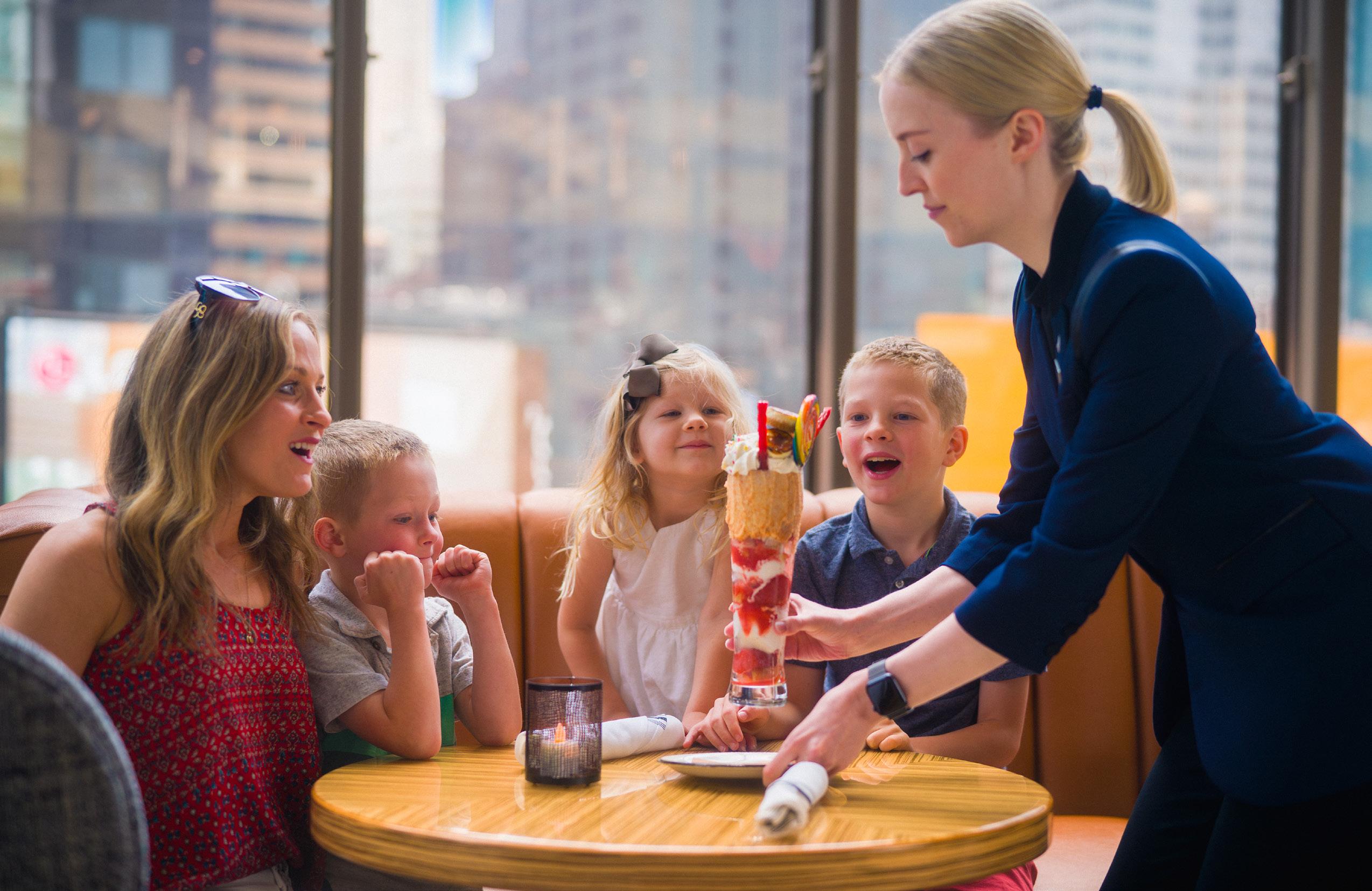 Offered at Broadway Lounge, New York Marriott Marquis. This tasty item is filled with vanilla cake bites, ice cream, strawberry compote and topped with homemade whipped cream, sprinkles, brulée cheesecake bites, Pirouette cookies, Twizzlers, and a colorful lollipop to top it off.