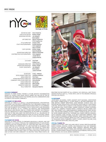 reaffirm the self-worth of all lesbian, gay, bisexual and transgender people and all those who join in the ongoing struggle for our civil rights. Membership Jason Bain, Joe Barna, Cheryl Bassett, Matt Blessing, Christopher Bollinger, Carmen Bonilla, Gloria Bonilla, Richard Borkowski, Nadine Boston, Robert Brightman, Adam Bruner, Charles Diaz, Sue Doster, Michael Dunlap, Kelly Easterling, Philip Ehrlich, John Farina, Lori Fine, Arthur Finn, Elizabeth Flynn, Monique George, Lina Gilmartin, Marlene Gioia, David Gomez, Andres Gonzalez, Donna Guzzardi, Darryl Hill, Kimberly Howard, Perin C. Hurewitz, Michele Irimia, Harriet Kirk, Audrey Luce, Jared Markowitz, Warren Mayer, Teddy Mcfadden, Jose Ricardo Moreno, Russell Murphy, Marilyn Nieves, Ada Ospina, Kevin Parker, Bruce Poli, Suzanne Poli, Marco Pretell-Vazquez, Keith Quinones, Marc Rayner, Alan Reiff, Maryanne Roberto, Fran Rolan, David Schneider, Darren Seidman, Simon Shaloub, Sheila Sim, Paul Stark, David Studinski, Brian Sullivan, Jennifer Szobota, Christie Takahashi, Maria Tamburro, Cheryl Tucker, Joseph Villane, Evan Watt, Jonathan Whitford, Craig Williams Special Thanks To: Carmen Cacciatore, Chris Gagliardi, Bryce Aviano, Preston Burford, Marco Ovando, Cocktail Caters, San Francisco CVB, Visit Denmark, Chicago CVB, Toronto Tourism, Pride Toronto, Gregory Wein, Ben Baker, Tom Suiter, Crunch Fitness, Nick Tertinek, Jayce Jones, Terron Moore, Lauren Sparks, Frances Fonacier, Ross Roberge, Rob Sullivan, Mike Espinosa, Xio Colon, Dennis Sherwood N YC PR I DE GU I DE