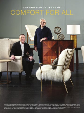 featuring: FRANCO SOFA in wingate-linen ($4110) $3045, ANSEL CHAIR in tibetan lambswool with brass base ($1880) $1345, JAMES CHAIR in wingate-linen, ($2270) $1675, MAJOR CHAIR in lingo-parchment ($1620) $1195, BELLA CHAIR in boulevard-ecru ($1870) $1395, JULES COCKTAIL TABLE $2120, LASALLE BAR $1870, JULES BOOKCASE $2870, KIMORA DINING TABLE $2620, ADDIE PULL-UP TABLE in bronze $745, ALLURE PULL-UP TABLE $620, DEANO TABLE LAMP in amber $580, POWER SHAG RUG in natural $1750, CIRCLE WALL ART in gold leaf $520, BLACK BURL TRAy $195, GEO SCULPTURES in vintage brass $180 and $125