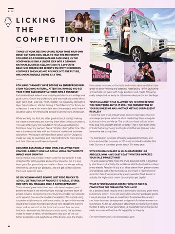 themselves are a very affordable and nimble retail model and are great for both vending and catering. Additionally, I think launching at Coachella, an event with huge exposure and media following, really catapulted us early on. It became a key part of our heritage. YOUR SCALABILITY HAS ALLOWED YOU TO GROW BEYOND THE FOOD TRUCK, BUT IS IT STILL THE CORNERSTONE OF YOUR BUSINESS OR HAS ANOTHER METHOD SURPASSED IT IN SALES? I think the food truck industry has come to represent more of a strategic purpose (which is often marketing) than a singular business to live and die by. The trucks are best utilized when they plug into a larger growth strategy. That is how both small brands that are growing and big brands that are looking to be innovative are using them. The distribution business officially surpassed the truck and brick-and-mortar business in 2014 and is slated to double this year. Our truck business grows about 5% every year. WITH COOLHAUS BASED IN MILD-WEATHERED LOS ANGELES, HOW HAVE EAST COAST WINTERS IMPACTED YOUR SALE PROJECTIONS? The East Coast winters mean the truck business there is essentially shut down, but actually the wholesale distribution business stays pretty steady. People still buy a lot of ice cream from grocery stores and celebrate with it for the holidays. Ice cream is really more of a comfort food than necessarily a warm weather food. Boston is actually the highest ice cream consumption per capita! WHAT IS YOUR BUSINESS DREAM? WHAT IS NEXT IN COMPLETING THE DREAM FOR COOLHAUS? On a personal level, I would love to continue to start and grow more businesses, which I think will always be consumer packaged goods. I would also love to have an investment fund where Freya and I can foster business development and growth for other women-run businesses. As far as Coolhaus is concerned, we really want it to be the Ben & Jerry’s of our generation—a household name that can be easily accessed without sacrificing quality or integrity. For more information, visit eatcoolhaus.com.