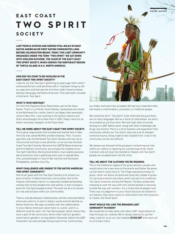 our tribes, and were fully accepted. We had very important roles like healers, matchmakers, counselors, or medicine people. We coined the term “Two Spirit” to be intertribal because there are so many languages. But as a result of colonization, we aren’t as accepted as we once were. We have high rates of suicide among our LGBT Native youth, along with other challenges like drugs and alcohol. There is a lot of isolation and separation from community without our Two Spirit roles and a lot of intergenerational trauma; being made to feel isolated from a role in the community can be very difficult. We always say that part of the purpose in reclaiming our role within our nations is repairing our sacred hoop of life, which is broken and will never be mended or healed until Two Spirit people are accepted back into the circle. TELL ME ABOUT THE CLOTHING YOU’RE WEARING. This is the traditional regalia of the grass dancers, people who would come into a new area on the prairie and flatten the grass so that others could move in. The fringe represents blades of grass—when we dance we bend and sway like a blade of grass. I’m carrying a basket and a bow, which are part of a traditional Two Spirit ceremony among the Mojave. The bow symbolized choosing to walk the way with men and the basket is choosing to walk the way with women—it’s a choice that all people have. There was no judgement to your choice because we listened to our dreams; they were visions or instructions from the ancestors or creator, the Great Spirit. WHAT WOULD YOU LIKE THE BROADER LGBT COMMUNITY TO KNOW? We would like to make allies with other LGBT organizations to help increase our visibility. We’re always looking for partnerships. Look for us on our new website EC2SS.NET and reach out to us to learn more. 109