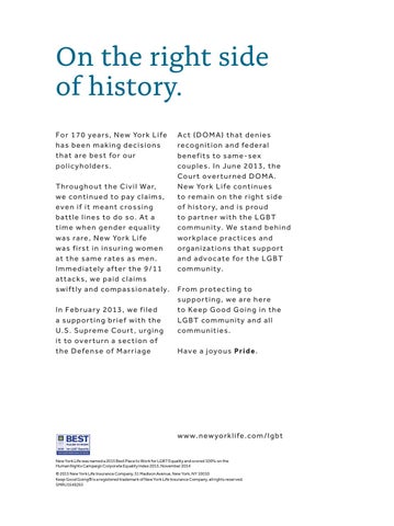 For 1 7 0 yea rs, N ew Yo r k L i fe A c t ( DO MA ) t h a t d en i es Fo r 170hayears, New k Life that s b een maYor k ing de ci sAct i o n(DOMA) s reco g ndenies i t i o n a n d fed era l h a s beet ha n making and t a re bdecisions est for our recognition b en efifederal t s to s a m e-s ex t h a t a re best for our benefits to same-sex p ol icyhol ders. co u ples . I n J u n e 2 0 1 3 , t h e po li cyh olders. couples. In June 2013, the Co u r t o v er tu r n ed DO MA . Court overturned DOMA. Throug hout t he Civil Wa r, N ew Yo r k L i fe co n t i n u es Th ro ug hout the Civil War, New York Life continues we cont to p ay c la s, to a i n oside n the right side we co nt inued toinue pay dclaims, toi m remain on rem the right n if itcrossing me a nt cross iof n ghistory,oand f h i is s to r y, a n d i s pro u d even i feitve meant proud ba tt l to e l do ineso. s toAtdo pa the r t n er wi t h t h e L GB T batt le lines a so. At to apartnerto with LGBT t imegender when equality g ende r eq ucommunity. a li ty coWe m mstand u n i tybehind . We s t a n d b eh i n d t i me when wa s ra re, YorN k ew LifeYor k L i fe workplacewo practices wa New s ra re, r kpla c eand pra c t i c es a n d wa s f i rswa t in insur ing women organizations s first in insur ing wo m en o rg athat n izasupport t i o n s t h a t s u ppo r t at t h e same rates as men. and advocate for the a t t he sa me ra t e s a s m en . a n d a d v o c aLGBT t e fo r t h e L GB T Imme d i ately after the 9/11 community. Im me dia t e ly a ft er t he 9 / 1 1 co m m u n i ty . att ack s, we paid claims a tt a ck s, we p a id cl a im s swi f t ly and compassionately. From protecting to mare prot ec t i n g to swift ly a nd comp a ssiosupporting, n a t ely . F ro we here s u ppo r t i nin g , the we a re h ere In Fe bruar y 2013, we filed to Keep Good Going Inr ting Fe b br r ua 2 0 1the 3 , we fiLGBT led community to Keepand Goall o d Go i n g i n t h e a suppo iefr ywith a sup p ort ing b r ief wit hcommunities. the L GB T co m m u n i ty a n d a ll U .S . Supreme Cour t, urging i t to o ver n a section of t , u rg i n g U .Stur . Sup re me Cour co m m u n i t i es . Have a joyous Pr ide. t h e De ifense of Mar r iage t to over tur n a sect io n o f H a v e a j oyo u s Prid e. t he De fense of M a rr ia g e
