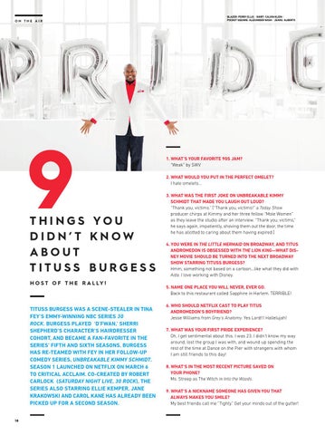 TITUSS BURGESS WAS A SCENE-STEALER IN TINA FEY’S EMMY-WINNING NBC SERIES 30 ROCK. BURGESS PLAYED ‘D’FWAN,’ SHERRI SHEPHERD’S CHARACTER’S HAIRDRESSER COHORT, AND BECAME A FAN-FAVORITE IN THE SERIES’ FIFTH AND SIXTH SEASONS. BURGESS HAS RE-TEAMED WITH FEY IN HER FOLLOW-UP COMEDY SERIES, UNBREAKABLE KIMMY SCHMIDT. SEASON 1 LAUNCHED ON NETFLIX ON MARCH 6 TO CRITICAL ACCLAIM. CO-CREATED BY ROBERT CARLOCK (SATURDAY NIGHT LIVE, 30 ROCK), THE SERIES ALSO STARRING ELLIE KEMPER, JANE KRAKOWSKI AND CAROL KANE HAS ALREADY BEEN PICKED UP FOR A SECOND SEASON. 18