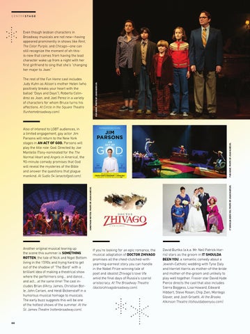 If you’re looking for an epic romance, the musical adaptation of DOCTOR ZHIVAGO promises all the chest-clutched-withyearning-earnest story you can handle in the Nobel Prize-winning tale of poet and idealist Zhivago’s love life amid the final days of Russia’s czarist aristocracy. At The Broadway Theatre (doctorzhivagobroadway.com).
