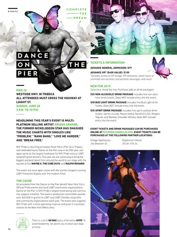 NEW FOR 2015 PIER 26 WESTSIDE HWY. IN TRIBECA ALL ATTENDEES MUST CROSS THE HIGHWAY AT LAIGHT ST. SUNDAY, JUNE 28 3 P.M. TO 10 P.M. HEADLINING THIS YEAR’S EVENT IS MULTIPLATINUM SELLING ARTIST ARIANA GRANDE. THE FORMER NICKELODEON STAR HAS SMASHED THE MUSIC CHARTS WITH SINGLES LIKE "PROBLEM," "BANG BANG," "LOVE ME HARDER," AND "BREAK FREE." NYC Pride is returning to Hudson River Park’s Pier 26 in Tribeca with extended hours! Dance on the Pier, now in its 29th year, will again serve as the largest fundraiser for NYC Pride and our LGBT nonprofit grant winners. This year we are continuing to bring the biggest and best talent from around the world to our stage with the sounds of DJs WAYNE G, THE CUBE GUYS, and RALPHI ROSARIO. The event will once again close with the world’s longest-running LGBT fireworks display over the Hudson River.