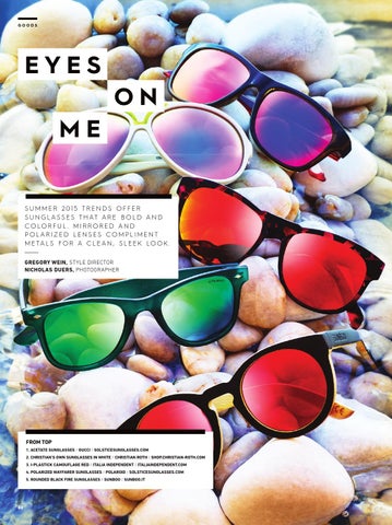SUMMER 2015 TRENDS OFFER S U N G L A S S E S T H AT A R E B O L D A N D C O LO R F U L . M I R R O R E D A N D POLARIZED LENSES COMPLIMENT M E TA L S F O R A C L E A N , S L E E K L O O K . GREGORY WEIN, STYLE DIRECTOR NICHOLAS DUERS, PHOTOGRAPHER