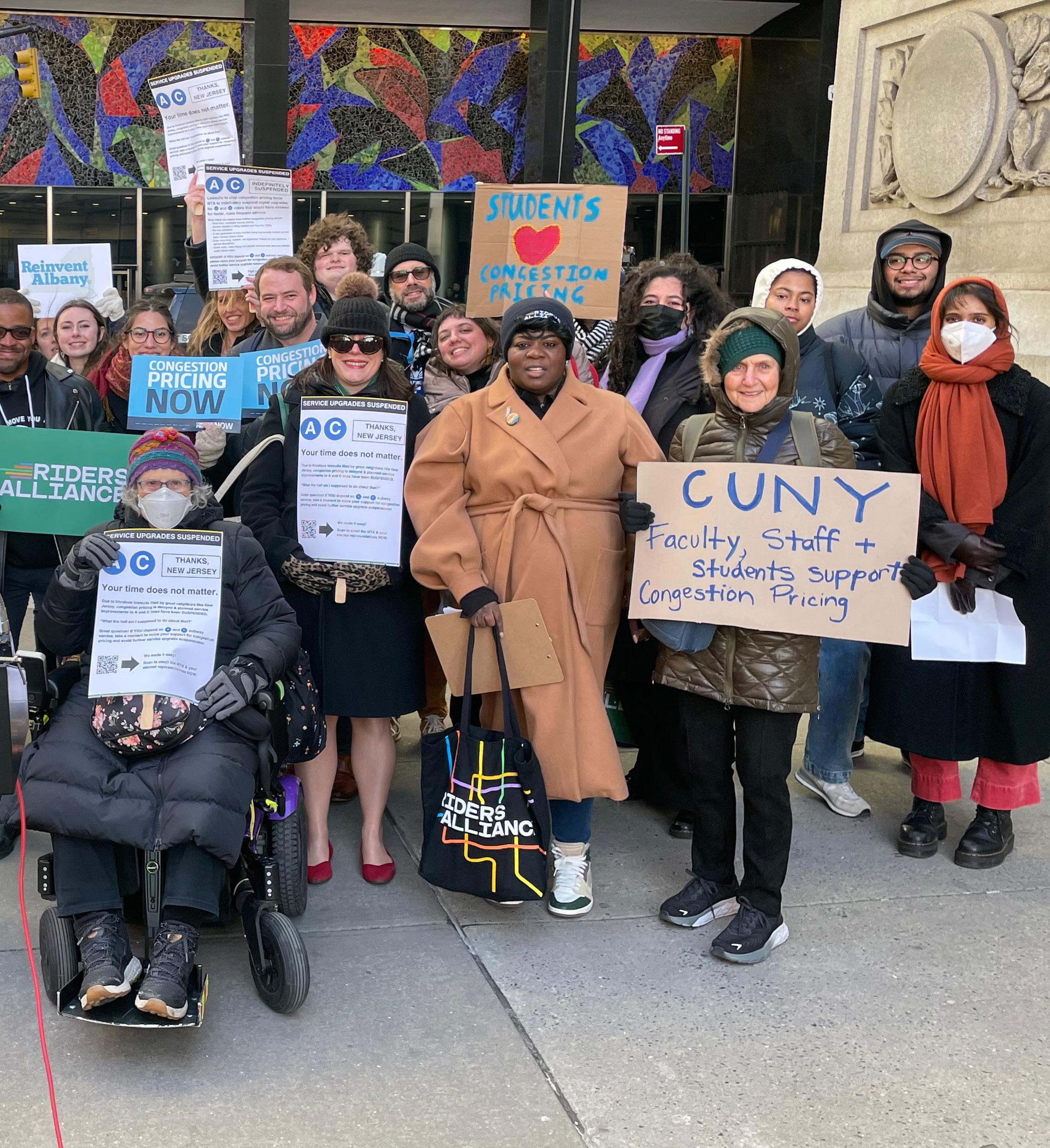 Several groups rally for congestion pricing in front of MTA headquarters in Lower Manhattan. Photo courtesy of the Riders Alliance